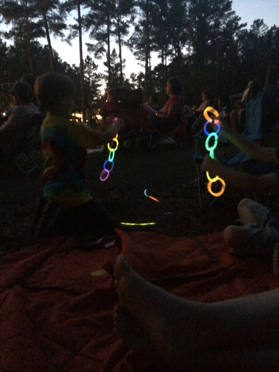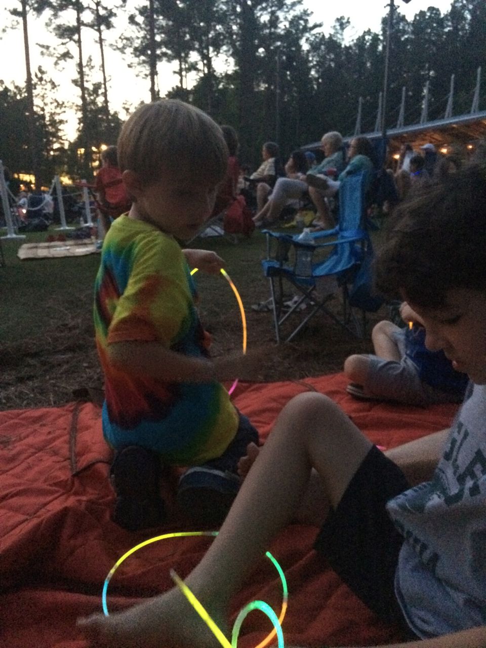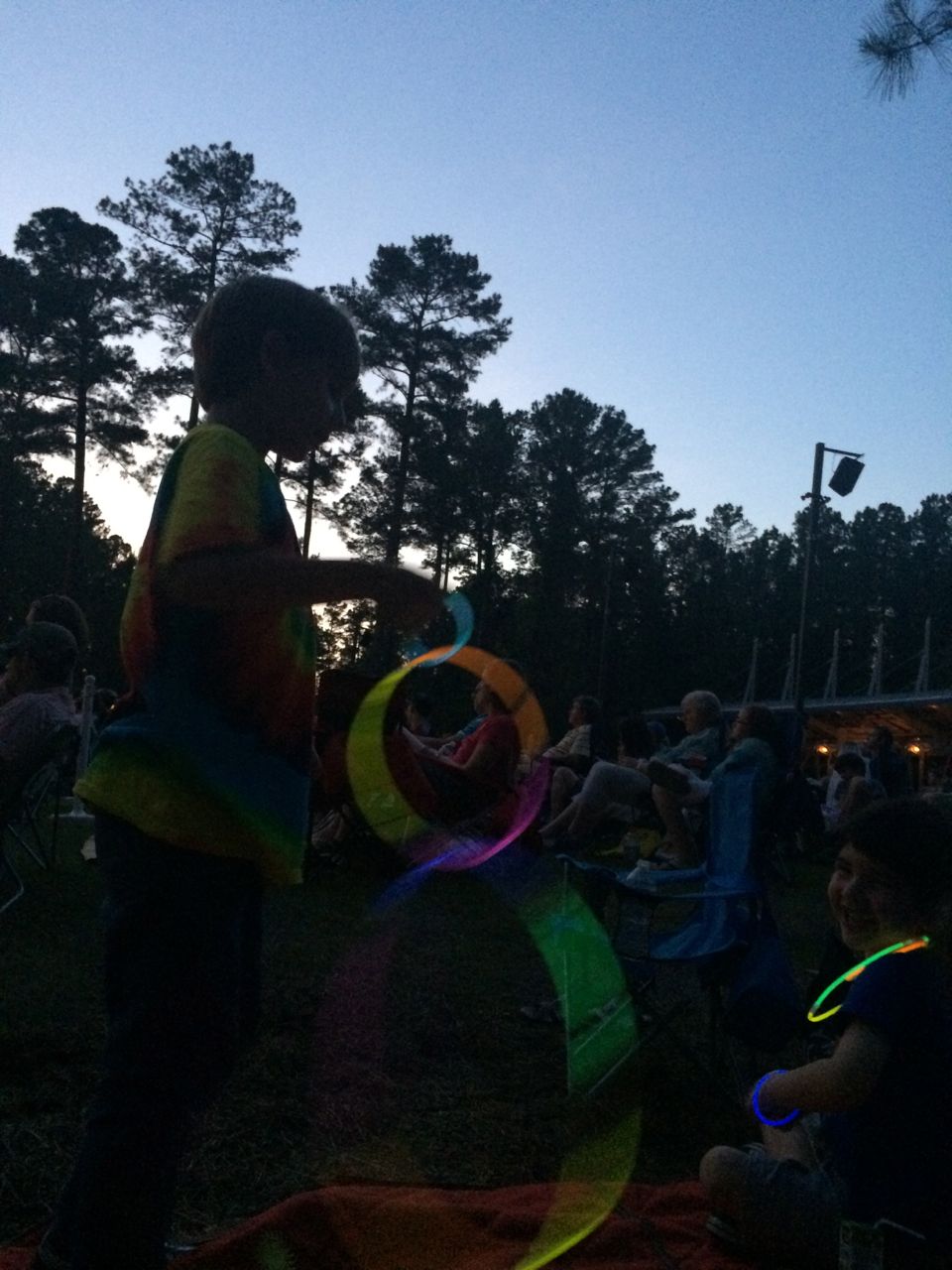 After work, we collected the children and went over to Neomonde to pick up supplies for an excellent middle eastern picnic. The kids sang along to “Pompeii” by Bastille while we waited in the car, one of their favorite songs. We were meeting the Orazis for an outdoor concert at Cary’s Koka Booth Amphitheater. The theme was John Williams music, featuring Star Wars predominantly (sort of like the concert that I’d taken Brian to before!) We met up with our friends, who had staked out a spot, and enjoyed a lovely picnic together, as the concert started. It was a beautiful evening, not too warm, and not too cool, and the food and the company were just the best. The 501st was on hand for photo ops, and I took the kids around to see the characters and let them pose for photos! The Orazis had brought a box of Moon Pies for dessert (that was Nico’s idea!) and we all enjoyed those as the sun was setting. Brian and Kendall probably hadn’t had one before, and they really got into it! Jen had remembered the fun thing I’d forgotten to bring, a bunch of glow sticks for the kids! That was really fun for them, especially as it got darker, and their attention spans got shorter, as the evening went on. Brandon and I started thinking, we should probably look into getting some lawn chairs like the Orazis have. It’s fun to sit on the blanket for awhile, but the chairs sure started looking nice after a couple hours! We did make it all the way to the end, though, and the kids played with those glow sticks all the way back to the car (not a short trek!) I ran into my friend Joni on the way, who I hadn’t seen in years! That was a nice surprise to end the evening with. All in all, a perfect early-summer day!