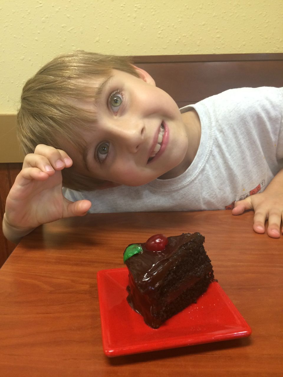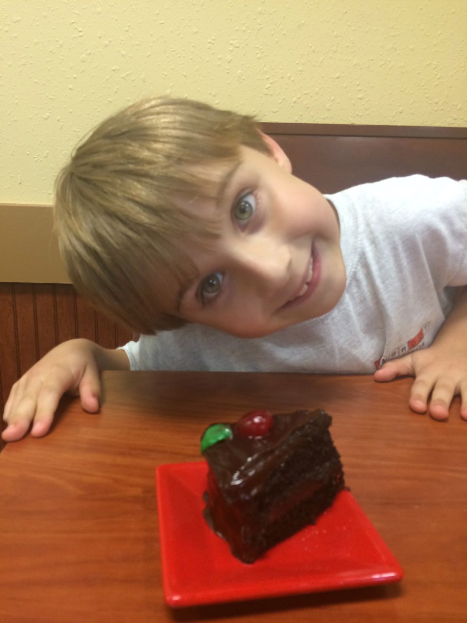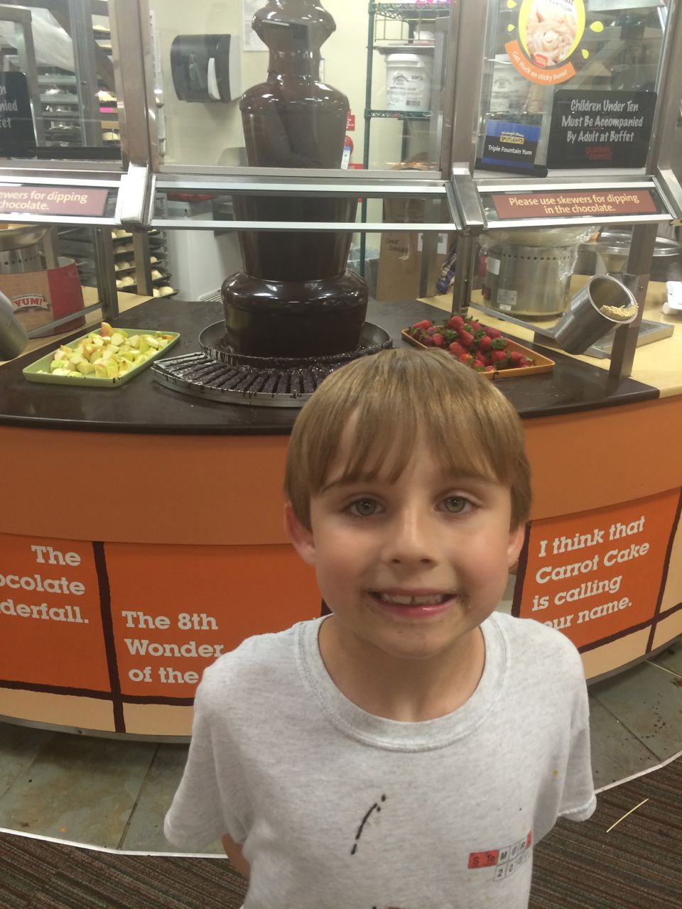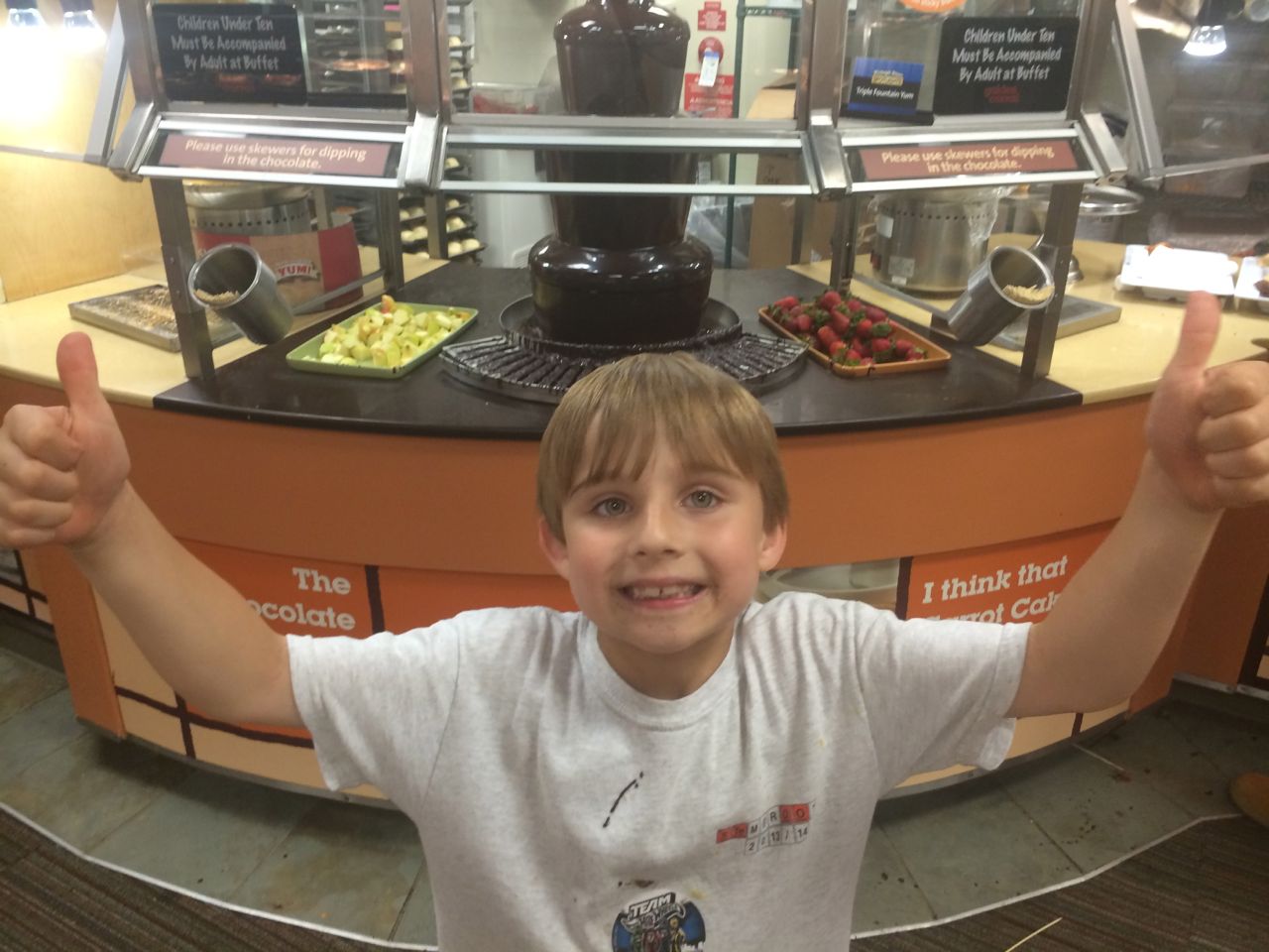 Well, he did it! Brian has finished his first whole year as an elementary schooler, and completed Kindergarten today with flying colors. It’s a little bittersweet, of course, but new fun and adventures await in first grade–not to mention the summer filled with many different camp experiences! Sadly, today Brian has to say goodbye to the after school program at Laurel Hills, since they have cancelled the transportation service from Root for next year. Theoretically, Root will have its own after-school program starting in the fall, but Brandon and I are a little nervous, since it doesn’t seem to be a done deal as of yet. I guess we’ll hope for the best for now, and deal with the worst should it come to that in the fall! We asked Brian how he would like to celebrate, and he asked to go to Golden Corral. Now, Brandon and I may have enjoyed it back in the 80’s as kids, before they went full-on buffet insanity. But now, meh, it’s not all that good, and feels sort of icky. We don’t like it anymore, and have said no every time Brian has begged to go there for the past 8 months or so of hockey season. (All the commercials make it sound like a great idea to him!) But, today was about him, not about us, so we gave in. He was so happy to get the chance to go there! He loved having all the choices, and the chocolate fountain was a big hit, of course! 😉 I think maybe he did start to understand that the food isn’t actually all that delicious (well, maybe except for that cake!), but it was worth sharing the experience, I guess! Clearly, it was meant to be, since even the ketchup-bottle trivia question we got was about Brian’s favorite book, The Day The Crayons Quit. 😉