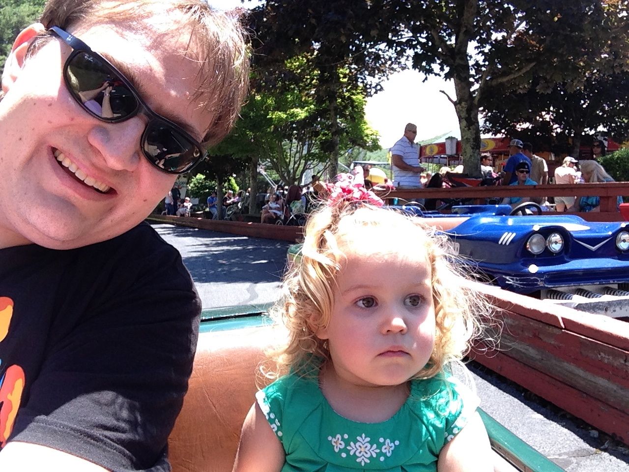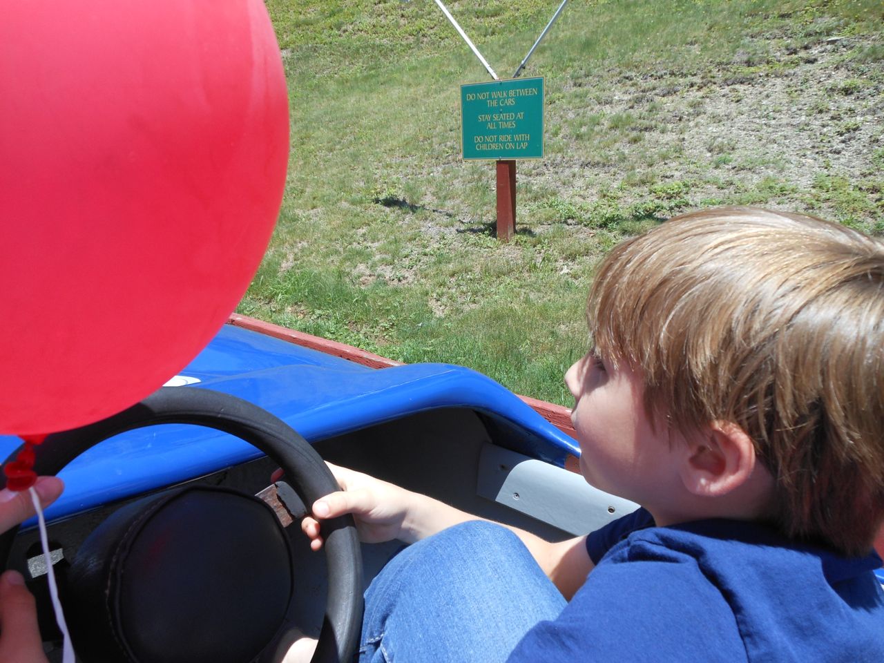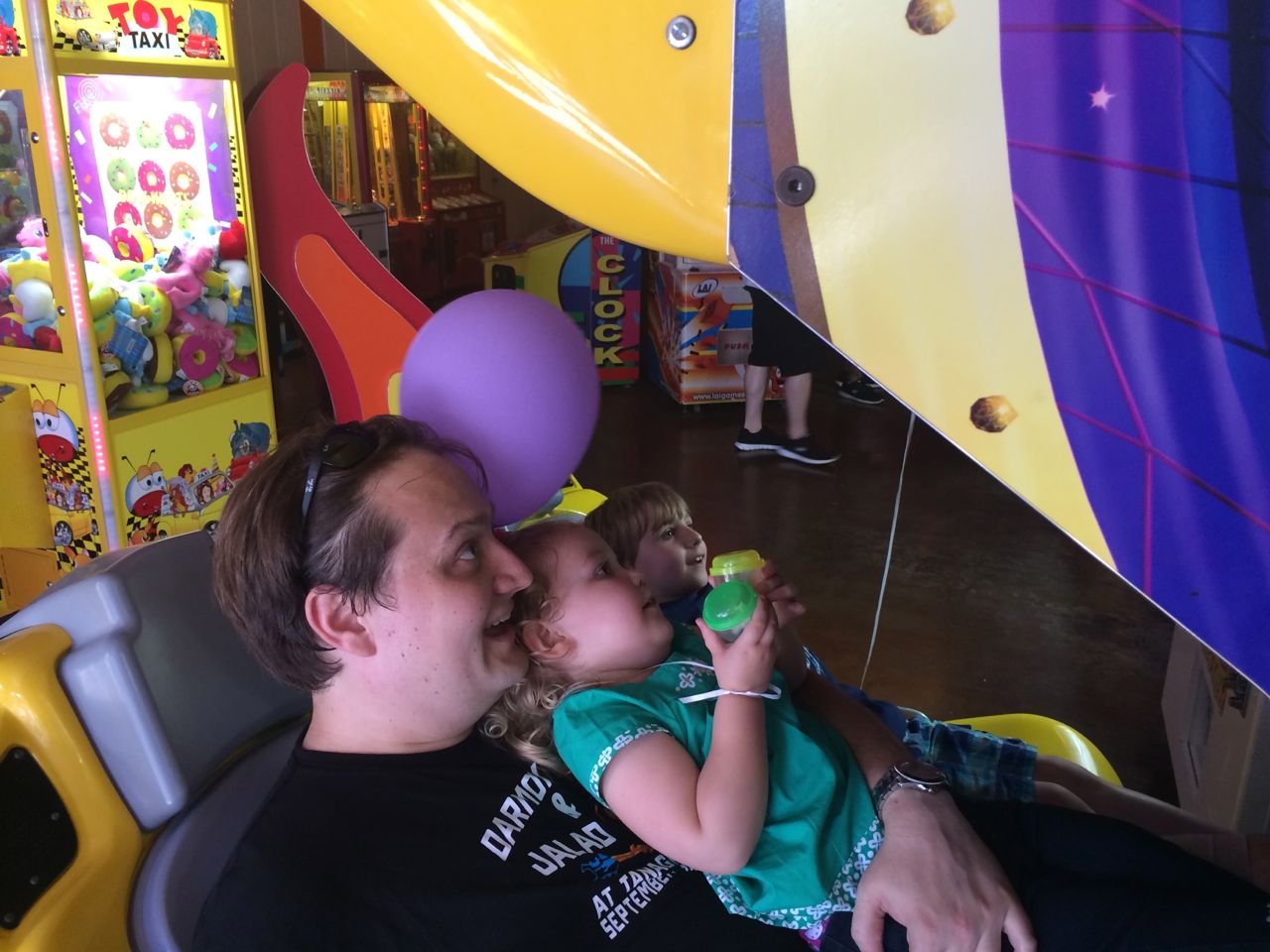 Leaving the train we took the chance to get a few photo-ops in before the kids get tired (read: cranky) at the end of the day.  We then headed up to the arcade area and spent a bunch of time up there playing games.  After that, we moved on to the motorized cars.  As the one that was the “responsible adult” riding with four-year-old Brian in this very amusement, where he took such joy in intentionally driving the car into the rails, I “graciously allowed” Alison to ride with him this time around.  Well, turns out six-year-old Brian still finds the driving into the rails to be a grand-old-time.  I already fear for ten years from now 🙂  I was the pedal man for Kendall’s ride, and she didn’t do too bad, but I definitely had to guide the car a lot more.  We’ll see how four-year-old Kendall does in a couple of years, for comparison.