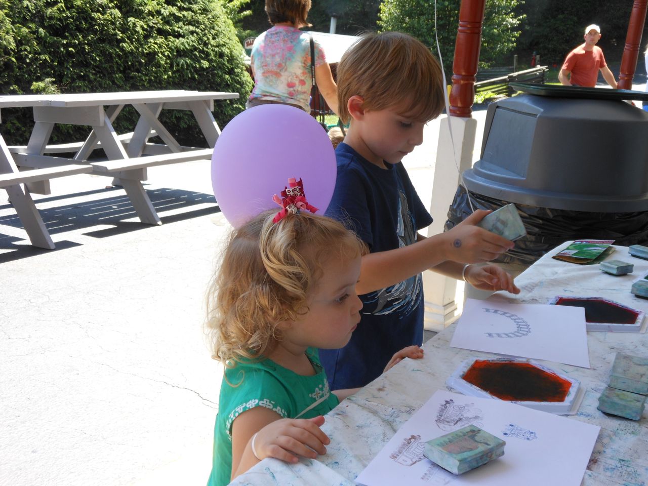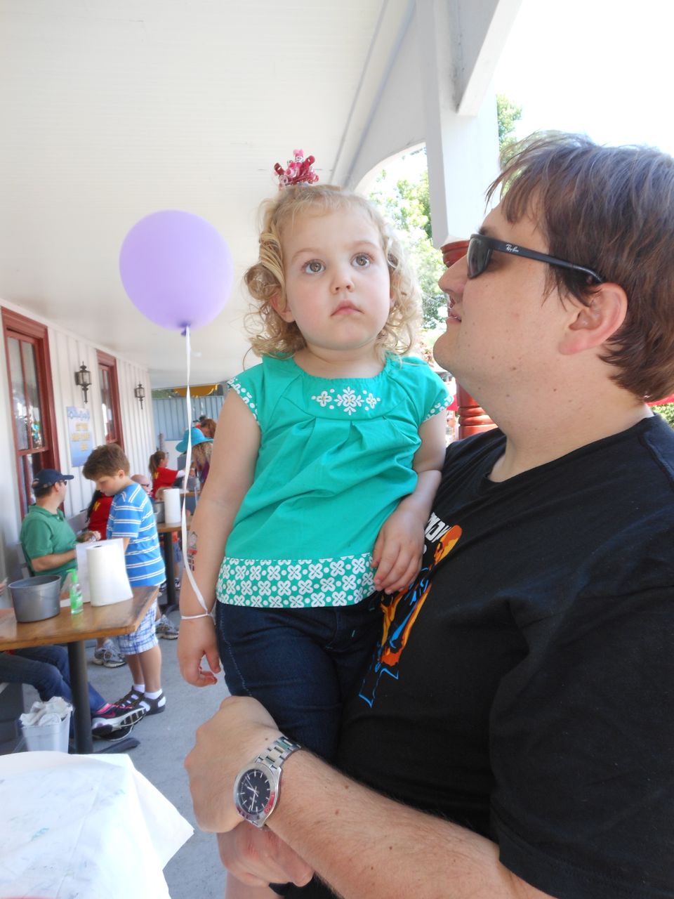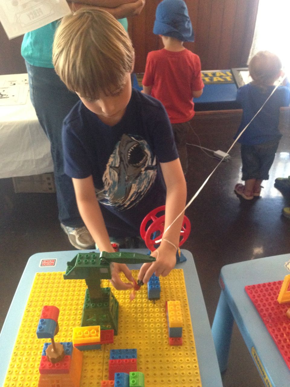 After this, it was snack-time, so we purchased one of their quick family meals of a pizza and four drinks.  We ate it in the saloon and took in a show while we had our lunch.  In the same building, they had the Mega Blocks tables for building Thomas stuff with interlocking bricks.  They both had a bunch of fun with these tables, especially Cranky the Crane!  The day was quickly getting Kendall tired, so I sat with her while Brian continued to play with Track Master and Mega Blocks while Alison went to do reconnaissance in the Thomas/Tweetsie store (much better having a single adult go in than having the kids asking for anything and everything in there!).  But, very quickly, Kendall went into full-nap mode.