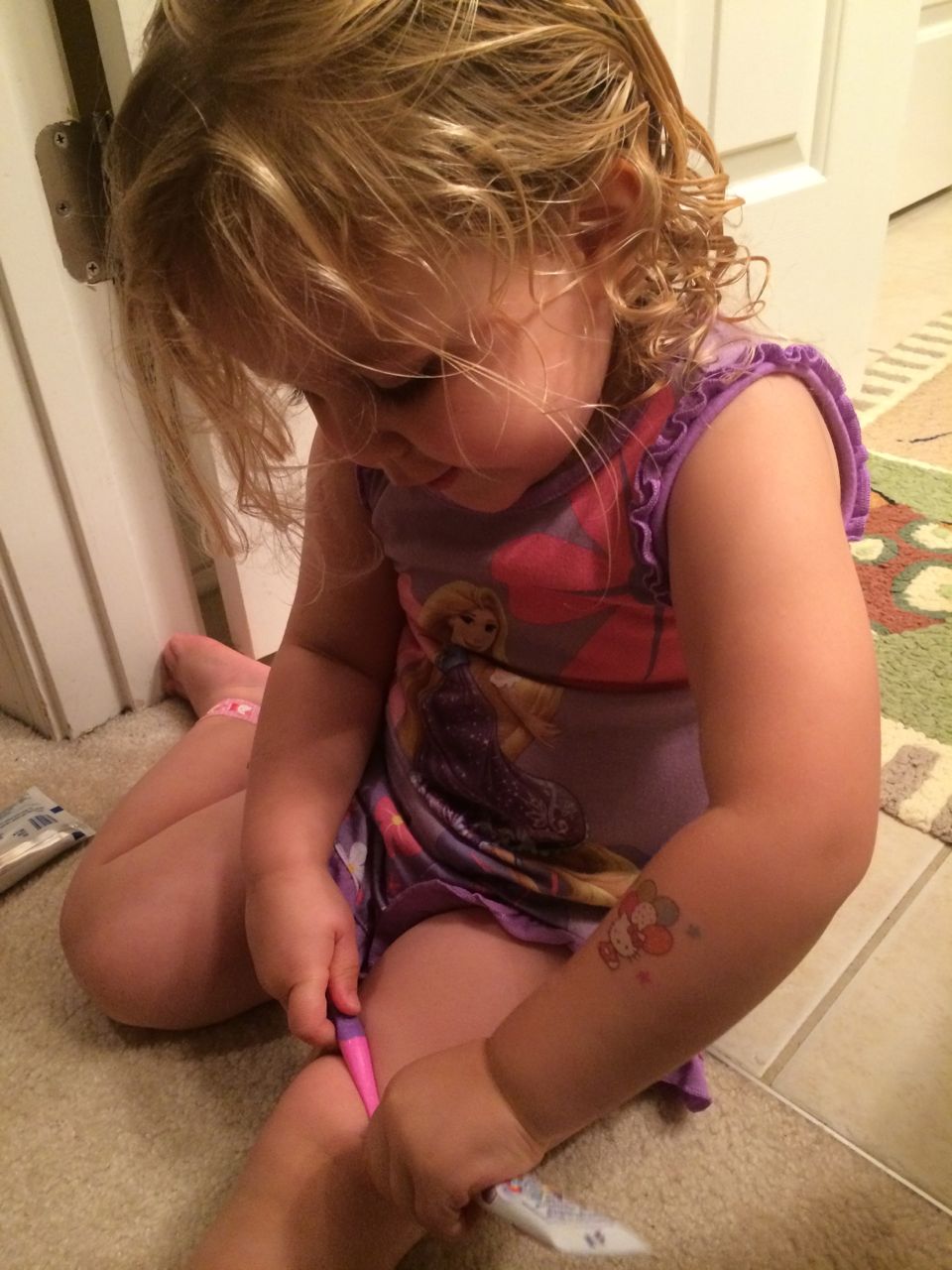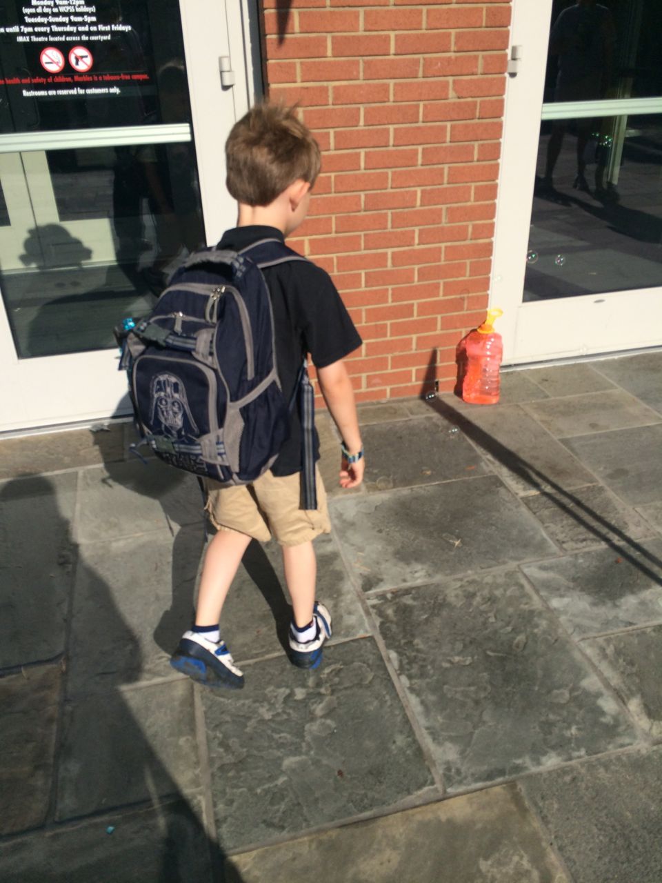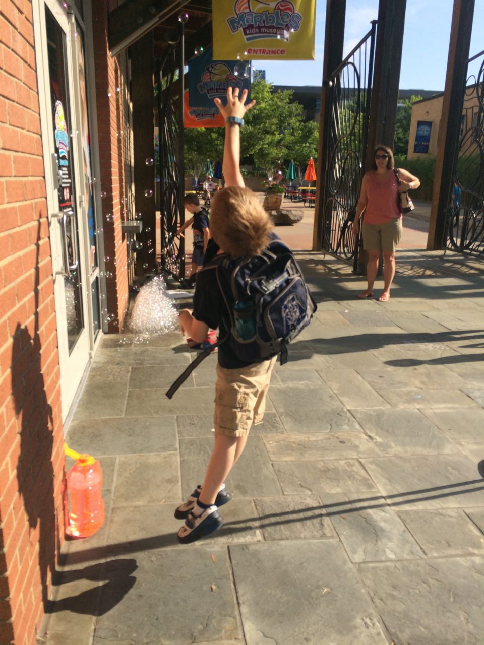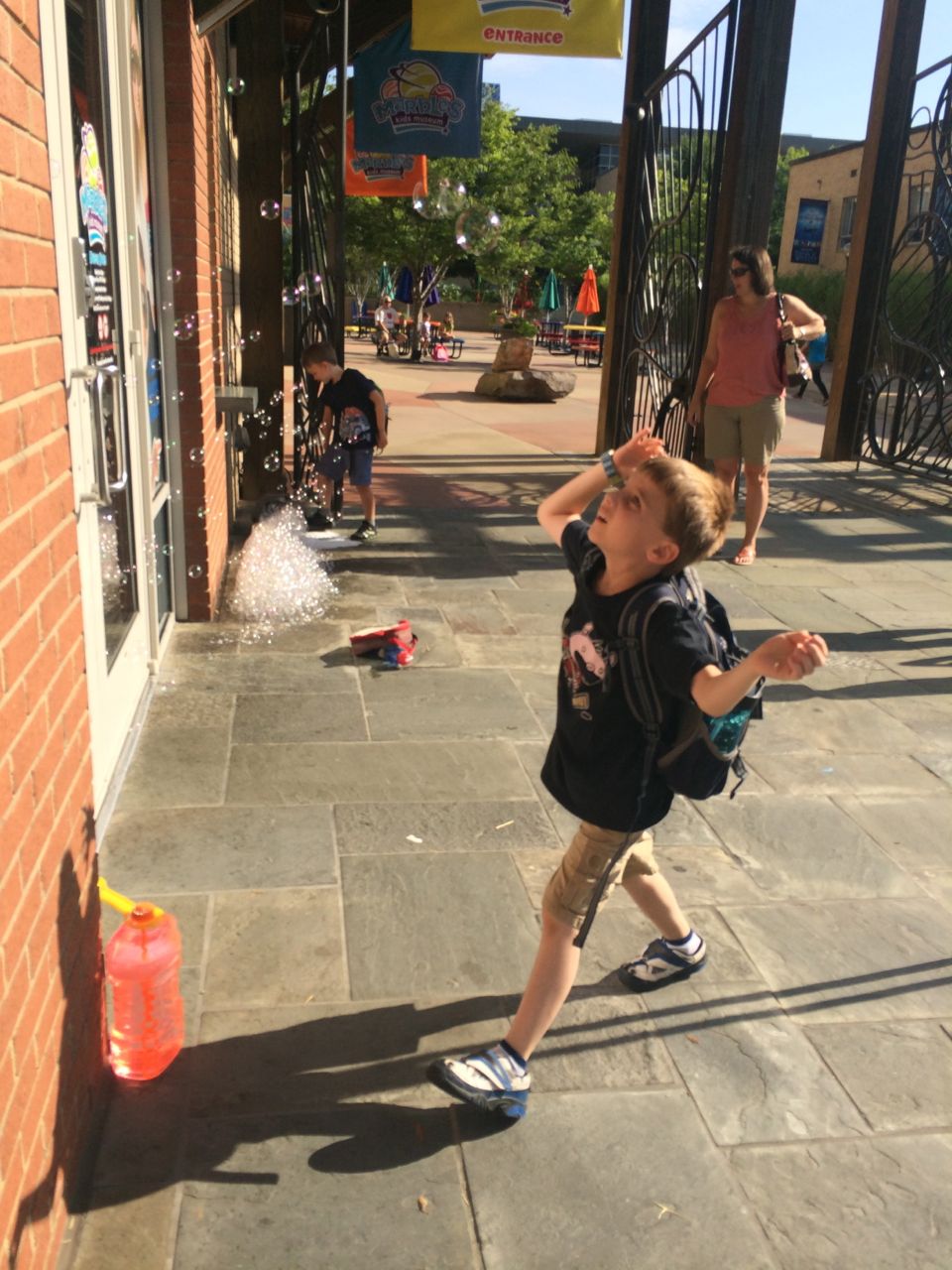 Today started Brian’s second week of summer camp, back at Marbles this week, for a morning session focused on Magic Treehouse! It was a bright and sunny morning, and Kendall was looking cool in her shades on the way to school. Marbles was getting things kicked off in a festive way, with a bubble maker running at the front door! That was helpful in keeping the kids entertained before the doors opened up. We got him safely to his room, and he was ready to get right to it! We don’t have afternoon care for Brian this week, but since he’s downtown nearby, and he’s been asking to come to work with us for awhile anyway, we’ve planned on just taking him with us back to Red Hat tower in the afternoons this week. We walked over to get him at lunchtime, and he walked back to the tower with us, had lunch, and basically chilled in a conference room with one or both of us for the afternoon. He played on the iPad a lot, and took advantage of the big marker board! After school, we saw that one of the little plants we’d gotten at Lowes up in the mountains had bloomed–cool! It was new toothpaste day for the kids, and Kendall was super-stoked that I’d gotten her a tube of “My Way” toothpaste–it’s a mostly blank tube, with six whole sheets of stickers to decorate it with! That’s way too much for one tube, so Brian decorated his tube as well, and then they moved onto our tube! We now have the most festive toothpaste of any family, I’d wager. Such a simple thing, stickers on toothpaste tubes, but I can’t overstate how cool this was for the kiddoes! They thought this was the best thing ever. I noticed that the good folks at Marbles had posted a really great photo of Brian’s class on their camp Tumblr this evening–I’m so glad Brian was front-and-center and looking right at the camera! This is a new thing for them this week, they’ll be posting photos and updates of what the campers have been up to. I’m really looking forward to it! 🙂