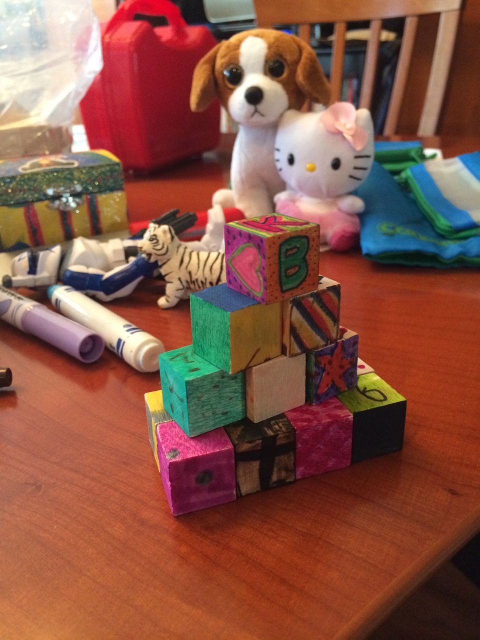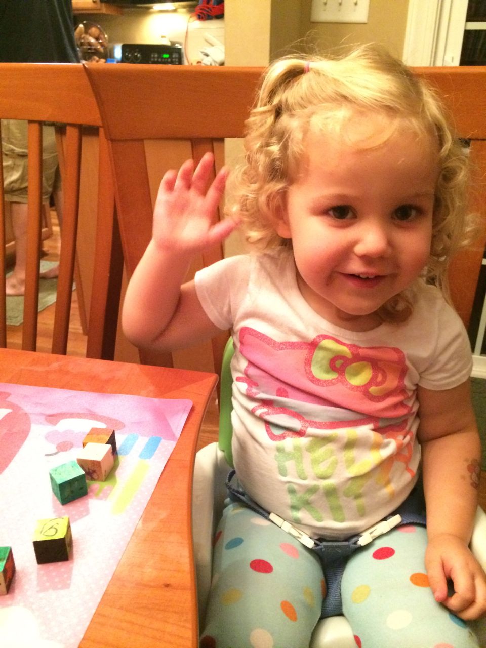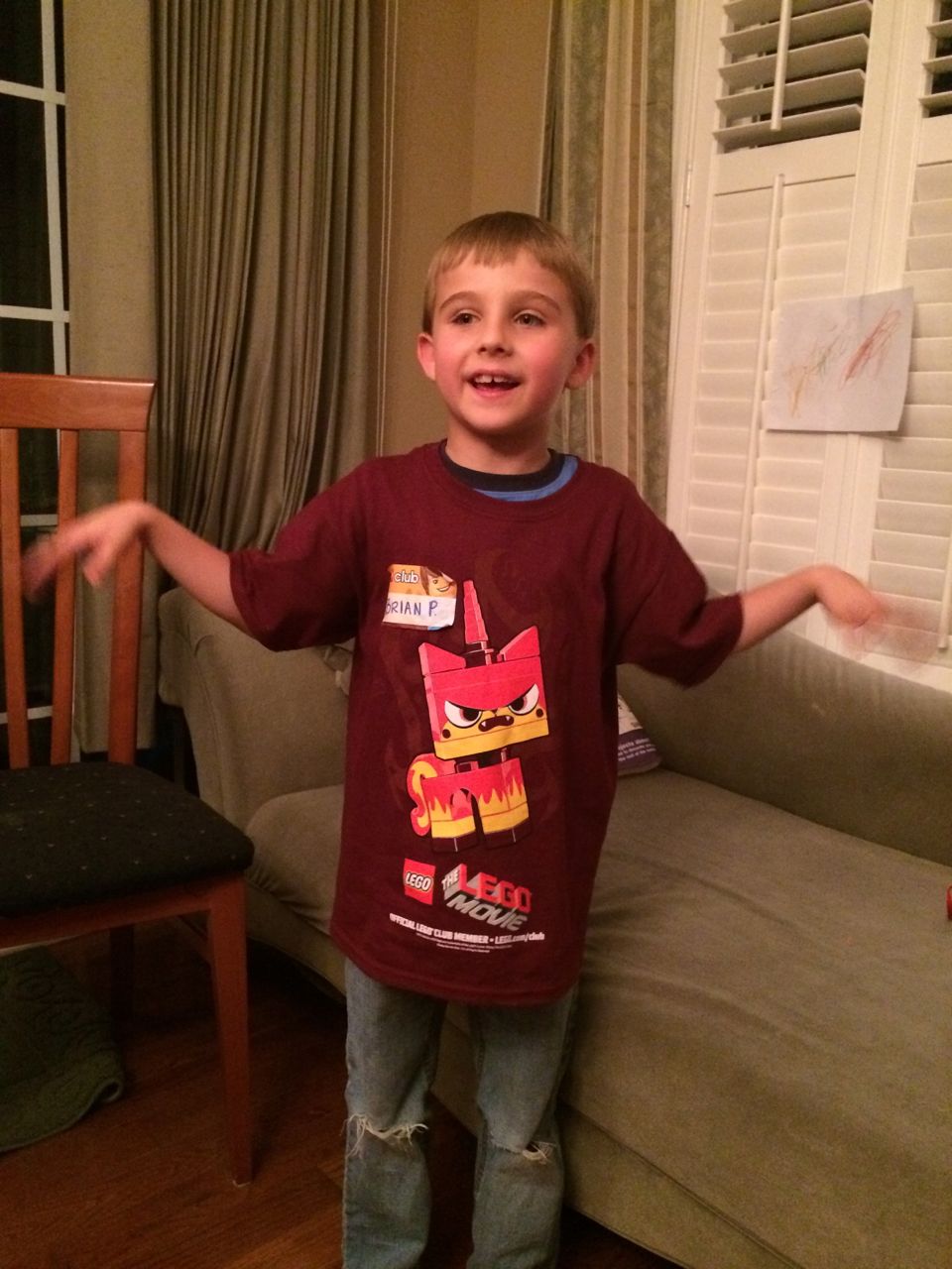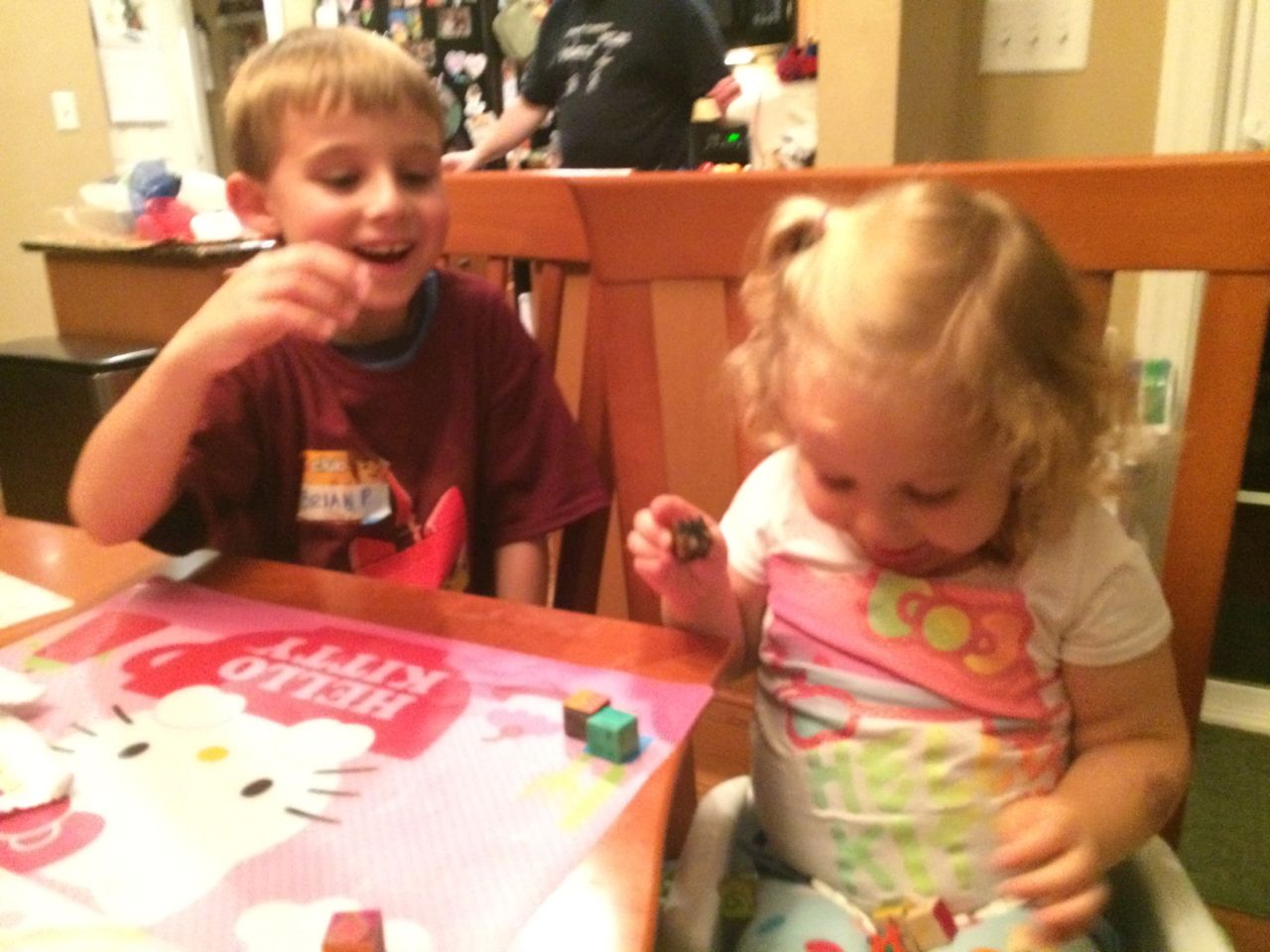 Just another lazy Saturday for the Perkins clan–oh, no wait, we don’t have those. 🙂 It was the crazy-busy kind of Saturday that we usually have! We started things off bright and early with a Lego Movie-themed Lego meeting. Next up, a Lowe’s Build and Grow where Brian built a cool How To Train Your Dragon 2 Sheep Launcher game! He thinks this is awesome, and really, it works way better than you’d think! After that, we met up to head over to Goddard School for their annual Birthday Party celebration. There was free food, snow cones, games, a bouncy house, and of course, fun things to do in every classroom! Ty was in attendance, and he and Brian had a fantastic time catching up with each other. We spent the most time in Brian’s last classroom with Ms. Tanisha, and the kids played with the big blocks for quite awhile! We ate in shifts, and Ty’s mom brought the kids their Kona Ice treats. We closed the party down, as usual, since the kids just couldn’t bear to leave! They got some balloons to take home, since the staff was already cleaning up. 😉 Back at home, Kendall napped, and Brian shared with us some of his items from camp last week, including a cool treasure map! Rosemary came by in the afternoon, and brought some of Brian’s clay projects that he’d done with her earlier this year. They painted his bear brown, and his bird yellow with an orange bill. Maybe it’s a duckling. 🙂 Rosemary also brought each kid a new plush toy (a Kitty for Kendall and a puppy for Brian), and some small natural wood blocks that the kids had a great time decorating with markers! It looked so fun, I even got in on some of that action. 🙂 Kendall loved stacking and knocking the little blocks down, and was so excited when we put a letter K on them for her! She recognizes a good number of letters already, but none more so than K! “Dat’s a K! K my Kendall!” is what she says when she sees one. 🙂 We decided to have a movie night during dinner, and since Brian has now done two Build and Grow projects about How to Train Your Dragon 2 without knowing what this Dragon thing is all about, we finally convinced him to watch the first movie, which we’d previously purchased on DVD/BluRay. He might have been on the fence before we started it but..! It was so good! Wow. Brian absolutely has fallen in love with this franchise. We all liked it even more than we thought we would. Really, it’s a great movie–I honestly could watch it again and again. We’ve decided to go and see the sequel in the theaters tomorrow! I am way more excited about that than a grownup probably should be. 😉 Brian was so taken with the soundtrack, he was humming and singing some of the themes for the rest of the night, flapping his arms and pretending to be flying around like a dragon! I have already bought him some of the soundtrack songs on iTunes. 🙂 We made some mint chocolate chip cookies for dessert during the movie, which were a huge hit with Brian–he couldn’t even tell us how good they were at first, waving us off saying “Oh. Mmm.. Just.. Just forgetaboutit!” (followed by dropping the sign language for “I love you.”) 😀