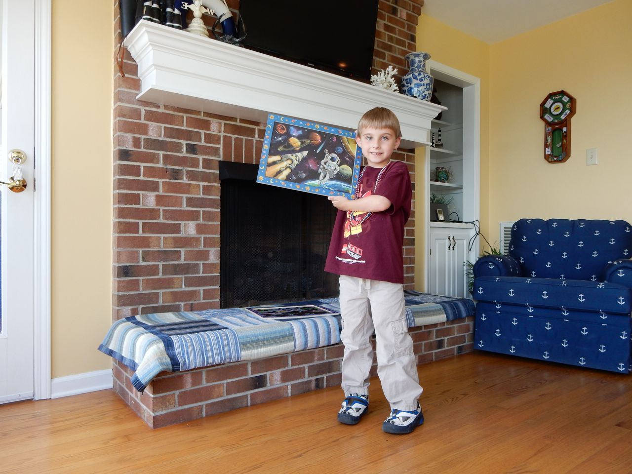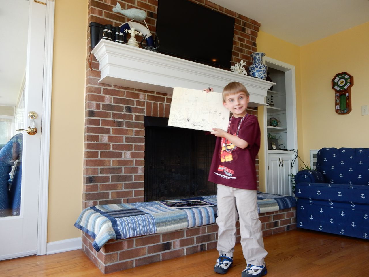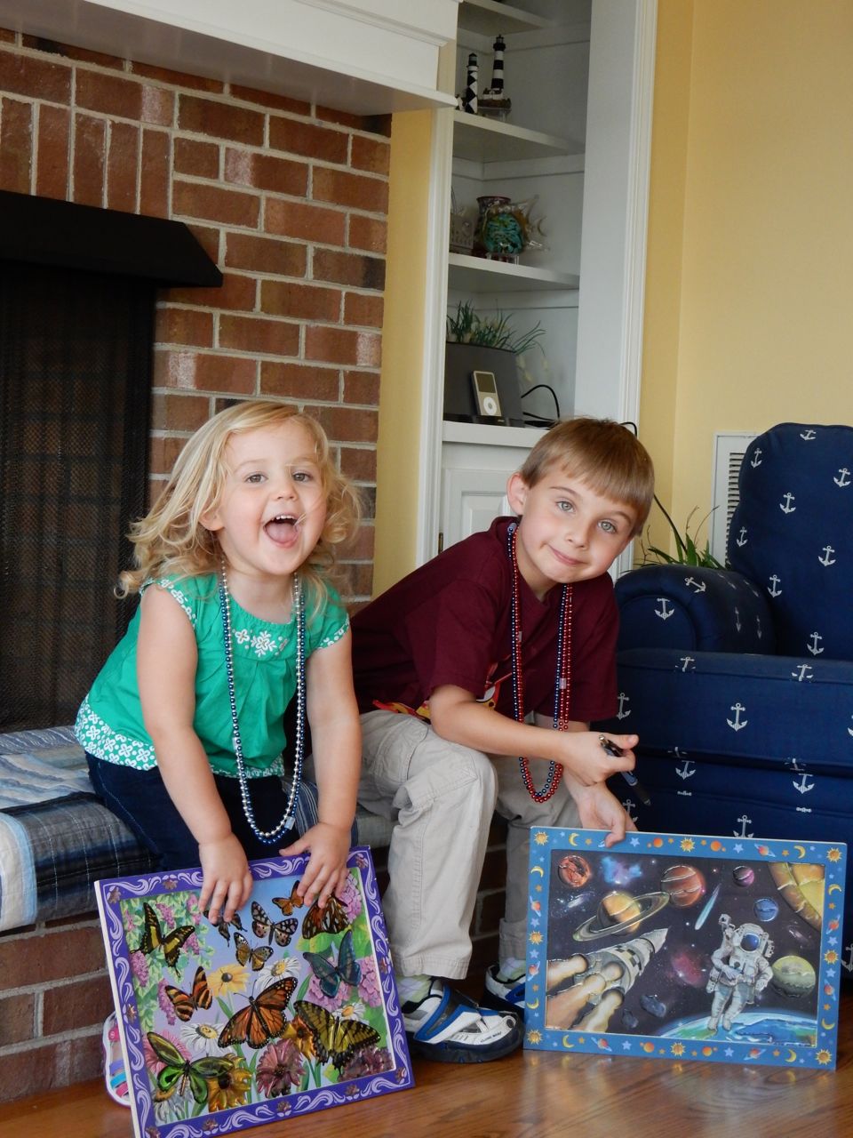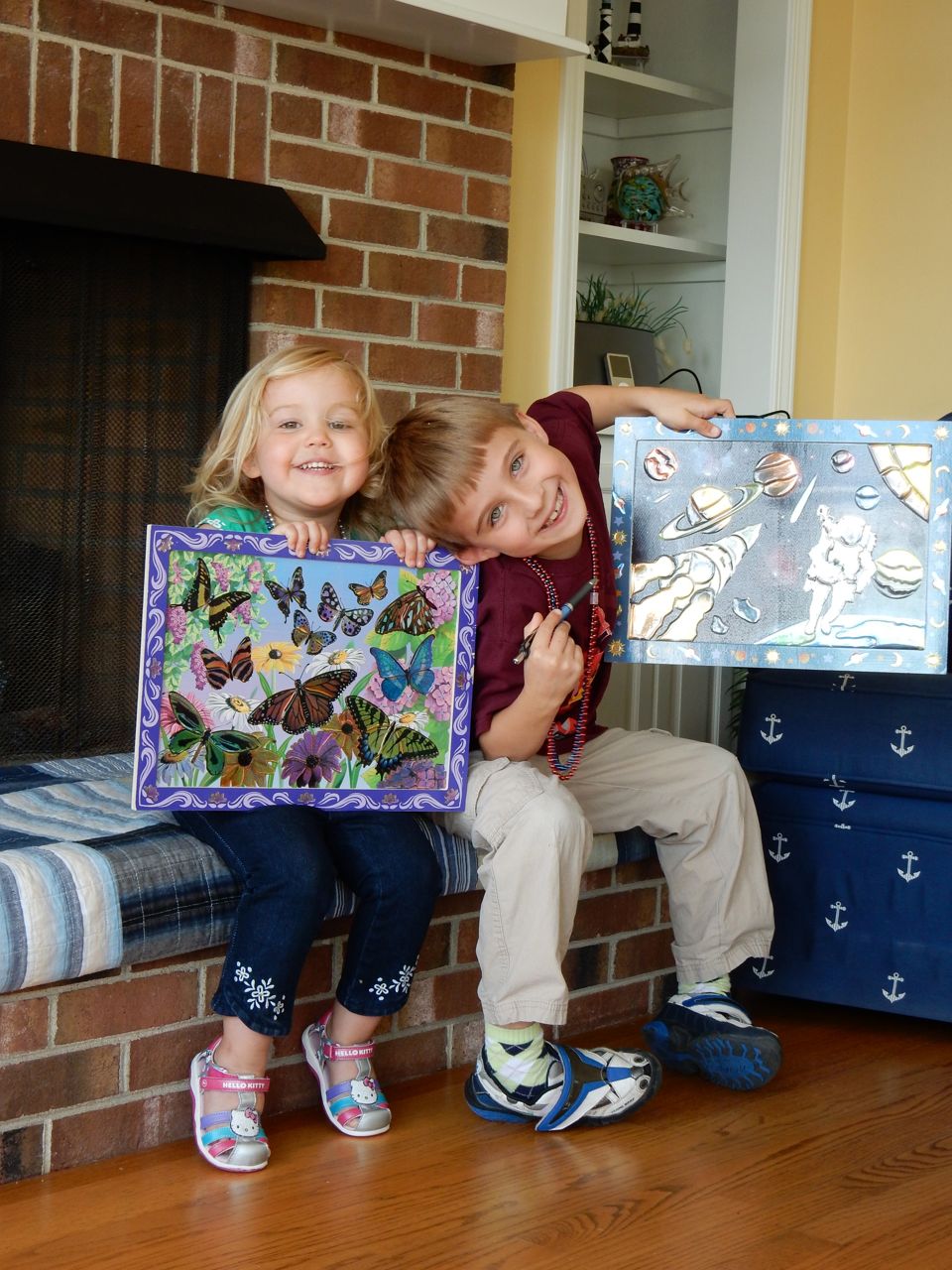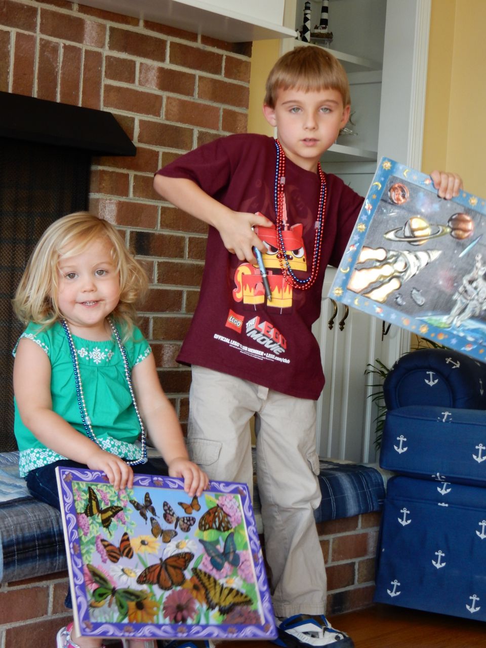 Today, our summer beach trip drew to a close, and that meant we spent the morning doing a couple more art projects, and trying one of the activities in the Candy Experiments book that Grandma Sue got for the kids. We observed what happens when Skittles are left in water (their letter S’es really do float right off, and their colors sink to the bottom! While Brandon did the majority of the packing, I helped both kids complete their Melissa & Doug sticker art projects, which are very shiny and cool-looking. We’ll probably hang them in their rooms. Neither kid wanted to leave, and who can blame them? They snagged a few extra seconds of pretend-kayaking before we had to get loaded up. We stopped by Neuse Sport Shop on the way home, like we usually do, and picked up some cool mirrored sunglasses for Kendall, and the goggles she was insisting on (Brian had some from his swimming lessons, and she found it highly offensive that she did not!) We should have gone straight home after that, but we decided to stop at a Dick’s and get one of those canopies like we saw on the beach. We lost our minds and went all in, getting the mosquito netting, the pole weights, a foldable wagon, and even the badminton set the kids were begging for. Probably shouldn’t have splurged like that, but when thinking about making that walk to the beach lugging everything, or going to that outdoor concert at Koka Booth, or just how many dang folding chairs we have now, that wagon sure seemed like a great idea. Plus, I’m sure we’ll use the canopy in the back yard, as well as the beach.