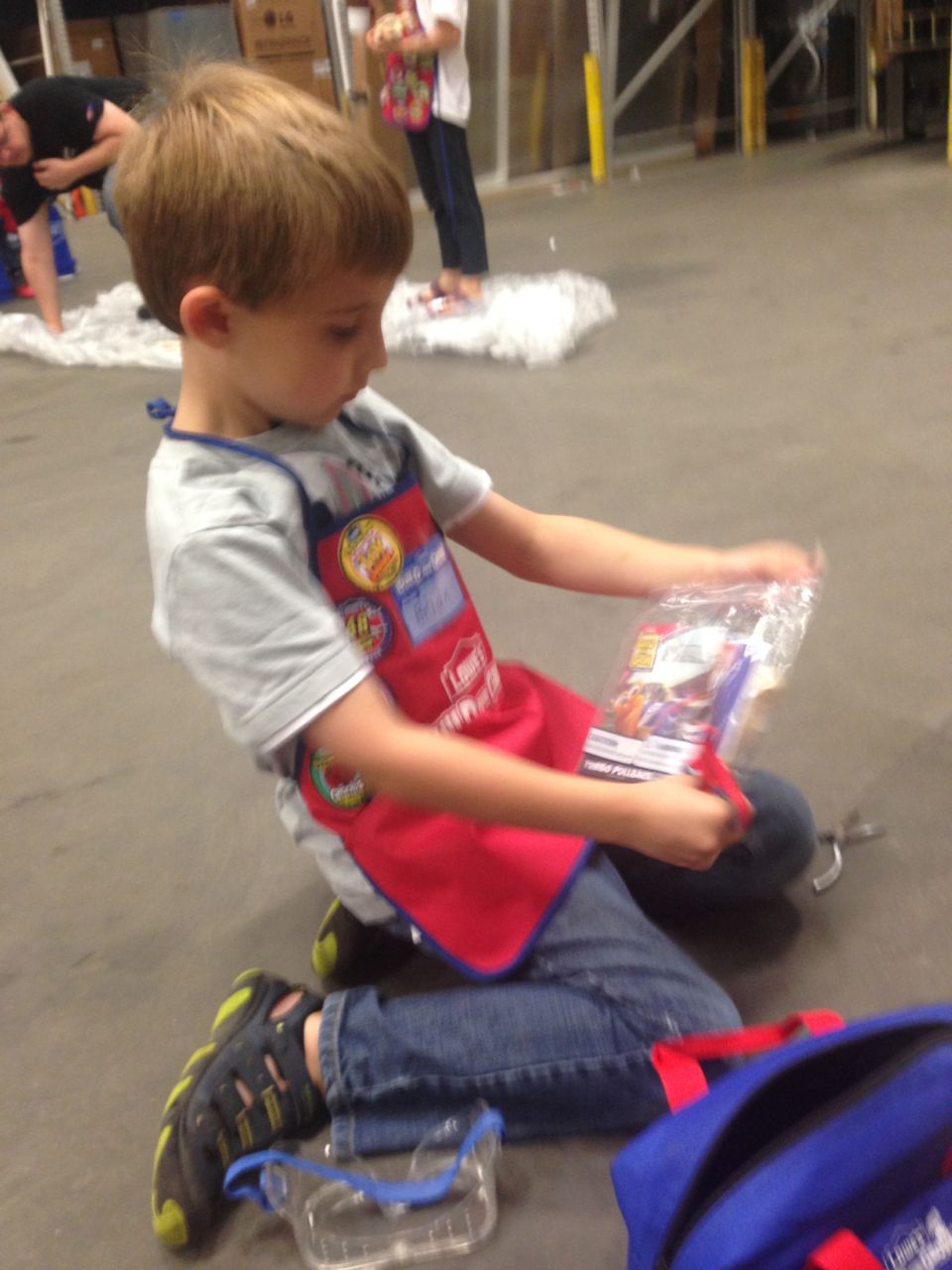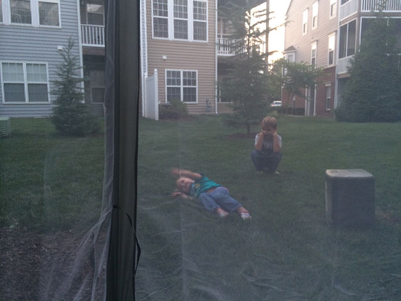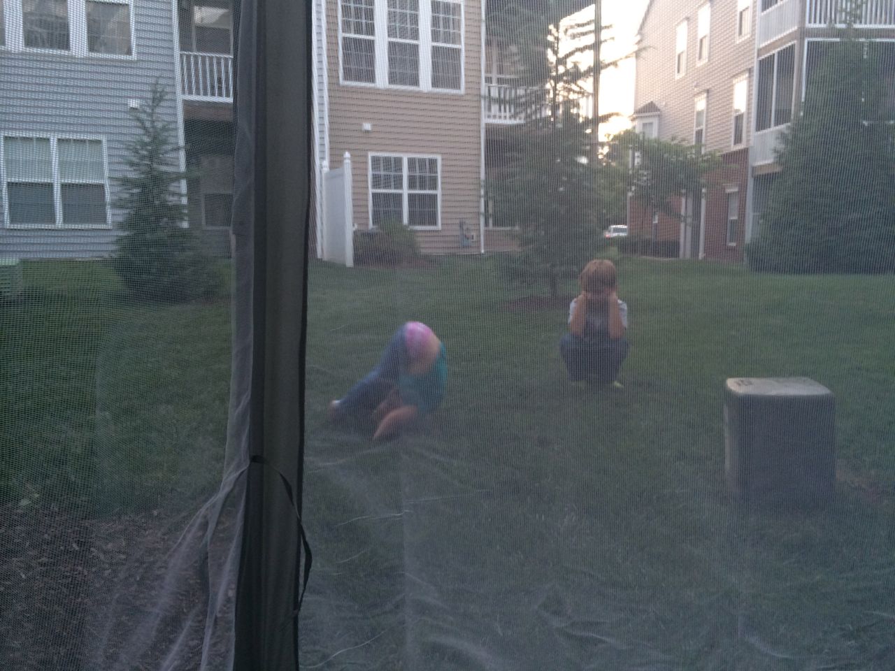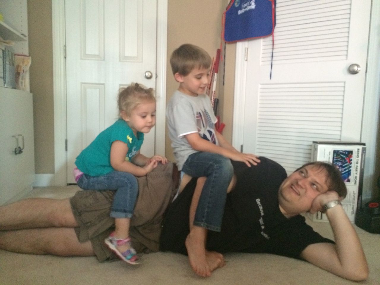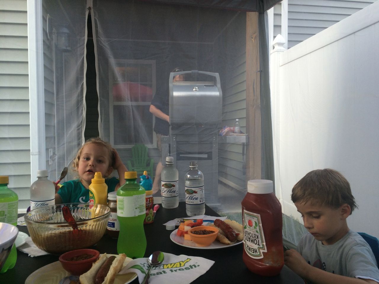 This morning, the kids both went to the Lowes Build and Grow session, and made a cool Turbo pull-back toy!  We weren’t familiar with Turbo, but found the movie on Netflix afterward, and watched it with lunch!  Pretty cute.  This afternoon, after playing downstairs for awhile (with the kids abusing Brandon by riding him like a horse!) we decided to make use of the canopy we’d bought on the way back from the beach and Brandon’s new grill, and have a cookout.  It’s a pretty nice canopy, especially with the mesh netting to keep the bugs away!  We’d been eyeing one that some folks down the beach had, and just decided to splurge and get one for ourselves.  Now we are pretty much set for future beach trips and outdoor fun, with plenty of folding chairs, a folding wagon, and a folding canopy to boot!