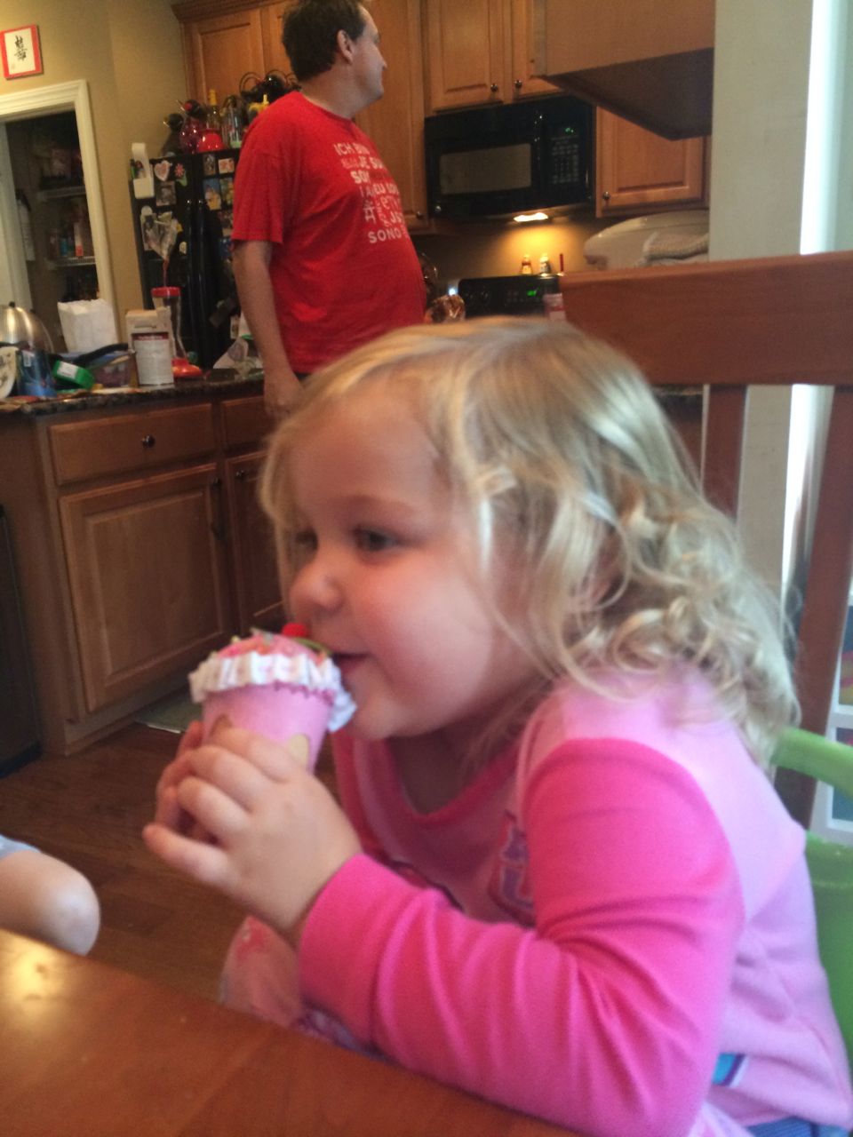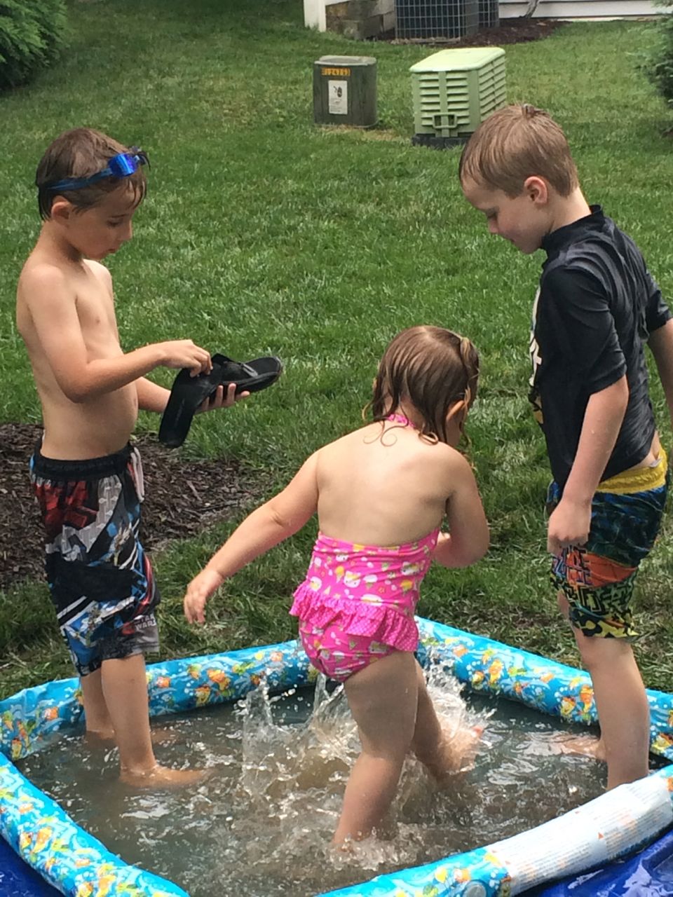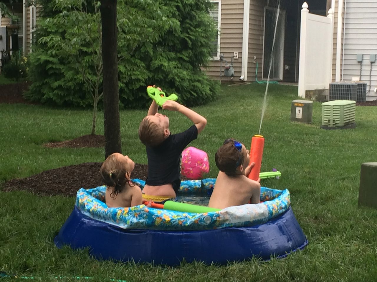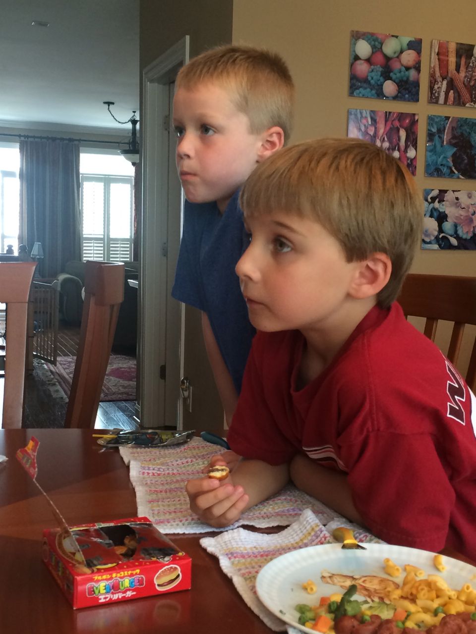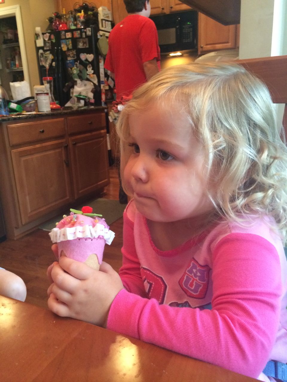 This morning, I surprised Kendall with a felt cupcake I made for her last night. I think it’s safe to say she liked it! 🙂 We had grand plans for a splash day playdate with Ty today, soaking up all the July sun and heat we could handle. But the weather had different plans, being a lot cooler and wetter than we’d expected! But, we did have some clear patches, and we made the most of it! We splashed and played and played with sprinklers and such, on the already-muddiest summer backyard you can imagine. 😉 So, the pool became a muddy puddle rather quickly, but the kids didn’t seem to mind. In any case, we hosed them down really well before going inside. 😉 Once everyone was dry and changed, we had a fun lunch of mac and cheese, hotdogs, and veg. Brandon had been watching some Neil DeGrasse Tyson lectures on Netflix, and somehow, the boys had the attention span to keep watching them. Awesome. 🙂 Pretty soon, the boys wanted dessert, and I hooked them up with some cute Japanese cookies I had on hand–Every Burger, cute cookies that look like little burgers, Yan Yan (like Pocky, but you dip the cookie sticks in a Nutella-like substance), and even the cute chocolate-covered biscuits that look like mini ice cream cones. Needless to say, they loved all of that. 😉 The kids played some more until it was time for Ty to go home. I did puzzles with Kendall while the boys played Star Wars and such. I found some really interesting creations afterward! Ice cream in the AT-AT? Sure, why not?! 😉