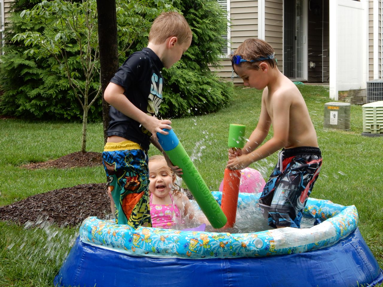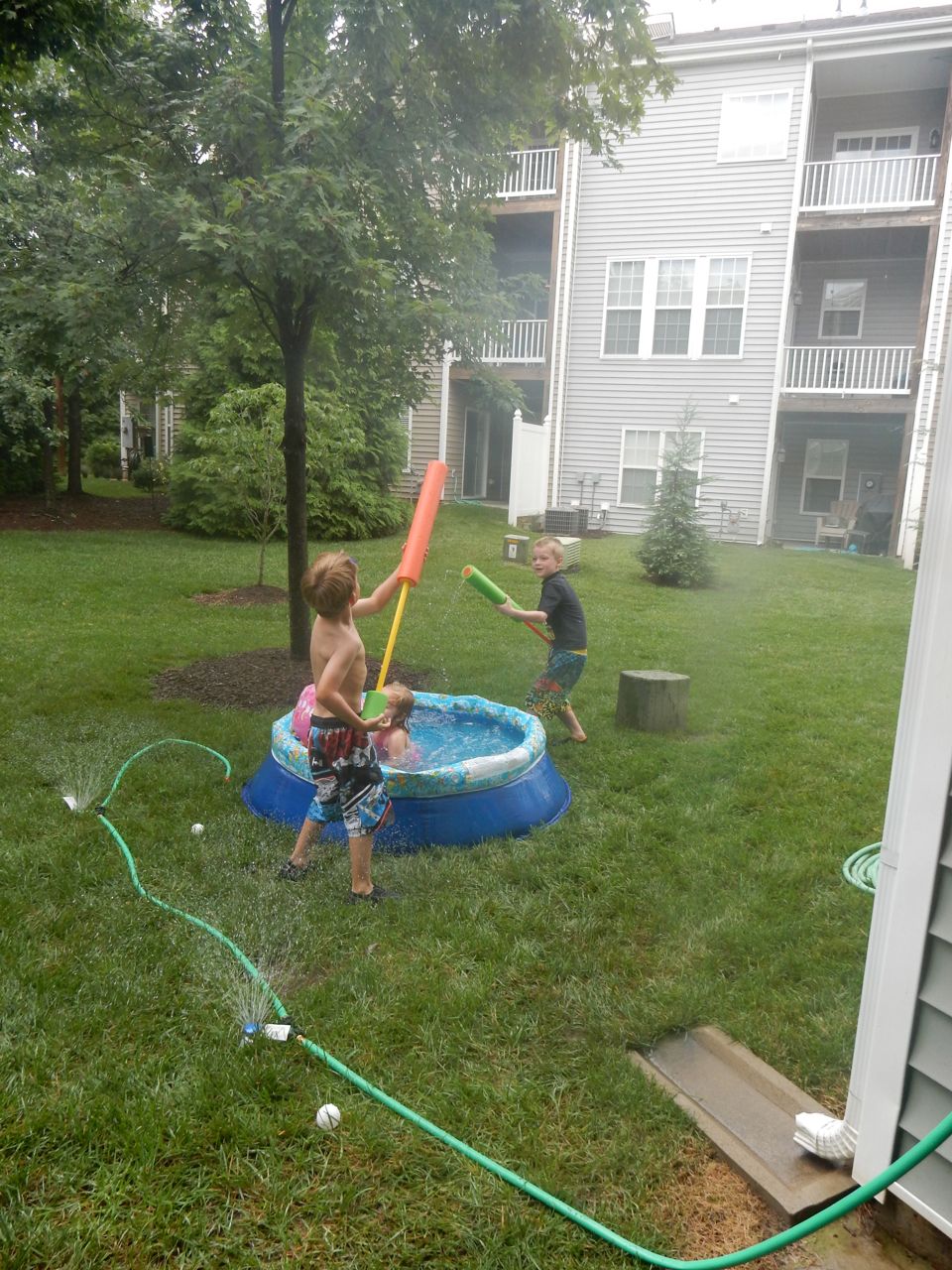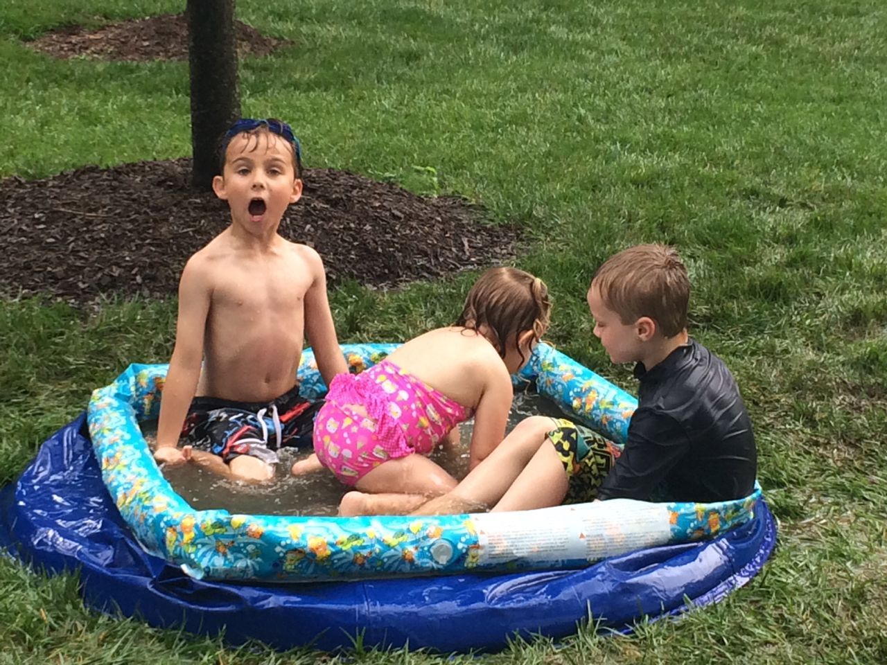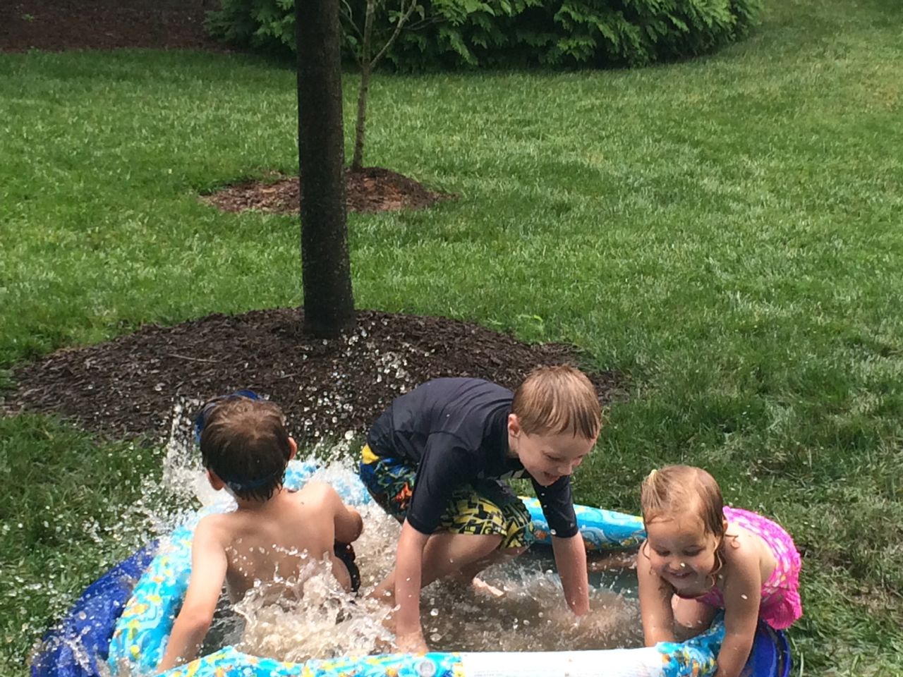 This morning, I surprised Kendall with a felt cupcake I made for her last night. I think it’s safe to say she liked it! 🙂 We had grand plans for a splash day playdate with Ty today, soaking up all the July sun and heat we could handle. But the weather had different plans, being a lot cooler and wetter than we’d expected! But, we did have some clear patches, and we made the most of it! We splashed and played and played with sprinklers and such, on the already-muddiest summer backyard you can imagine. 😉 So, the pool became a muddy puddle rather quickly, but the kids didn’t seem to mind. In any case, we hosed them down really well before going inside. 😉 Once everyone was dry and changed, we had a fun lunch of mac and cheese, hotdogs, and veg. Brandon had been watching some Neil DeGrasse Tyson lectures on Netflix, and somehow, the boys had the attention span to keep watching them. Awesome. 🙂 Pretty soon, the boys wanted dessert, and I hooked them up with some cute Japanese cookies I had on hand–Every Burger, cute cookies that look like little burgers, Yan Yan (like Pocky, but you dip the cookie sticks in a Nutella-like substance), and even the cute chocolate-covered biscuits that look like mini ice cream cones. Needless to say, they loved all of that. 😉 The kids played some more until it was time for Ty to go home. I did puzzles with Kendall while the boys played Star Wars and such. I found some really interesting creations afterward! Ice cream in the AT-AT? Sure, why not?! 😉