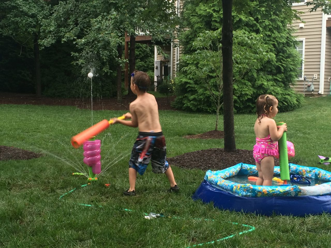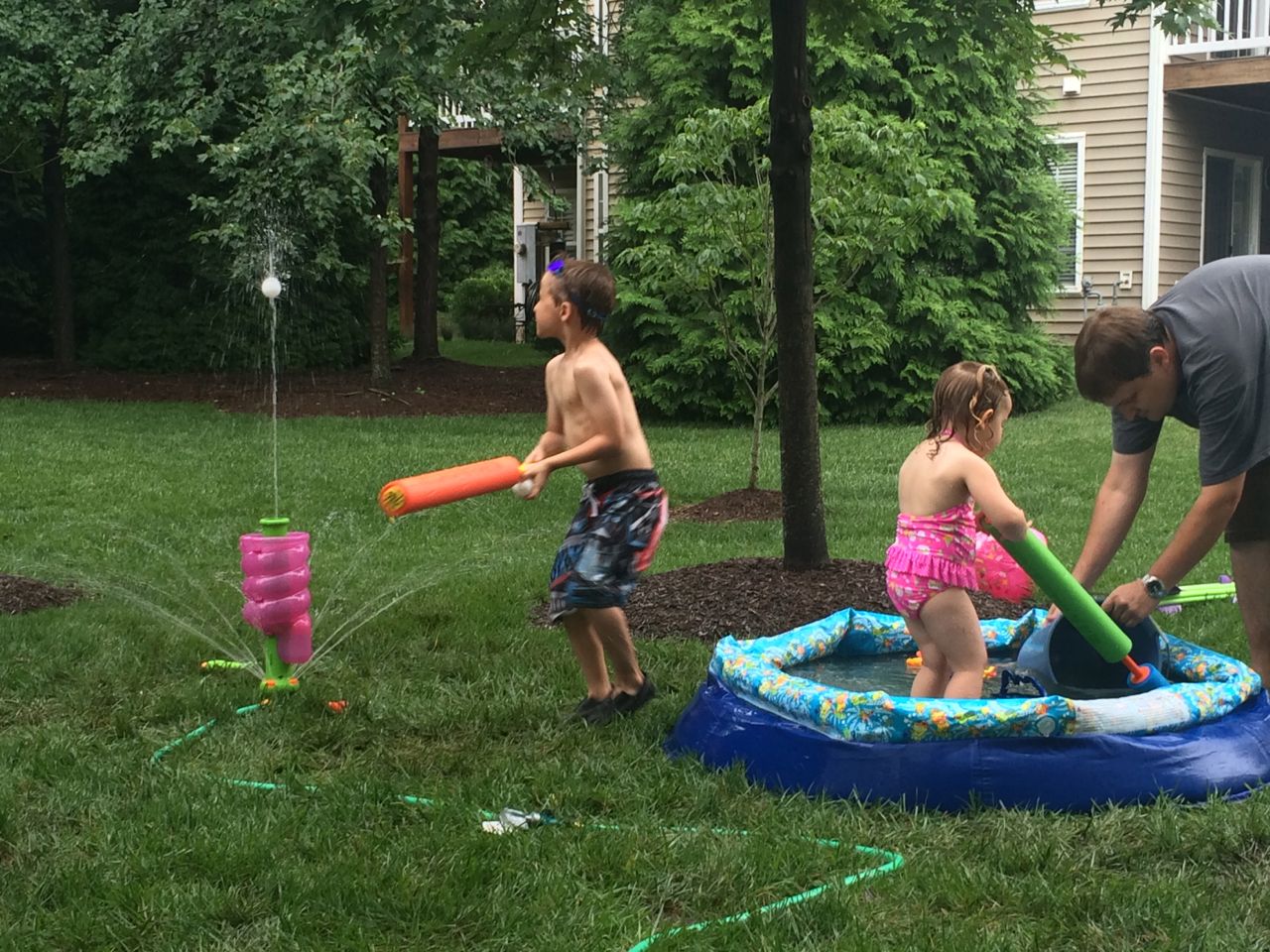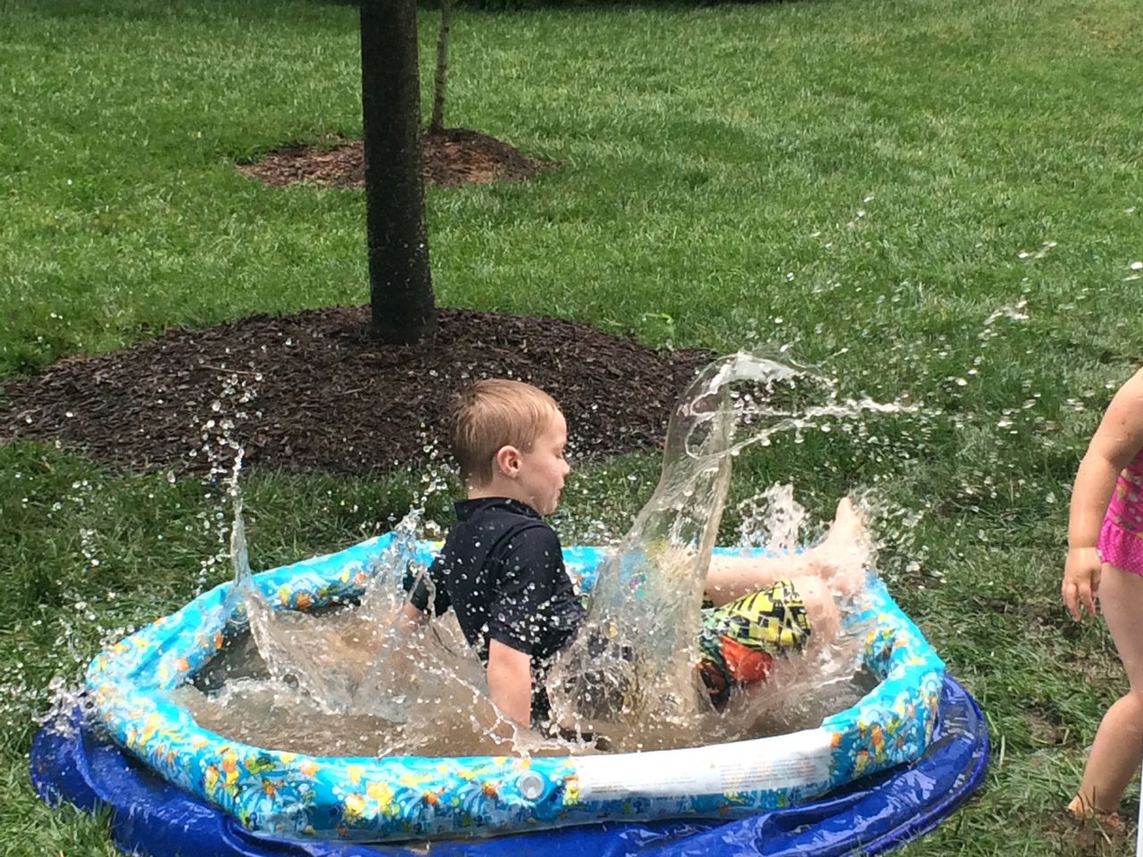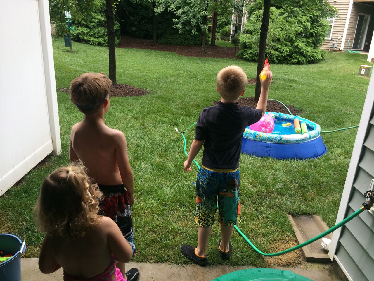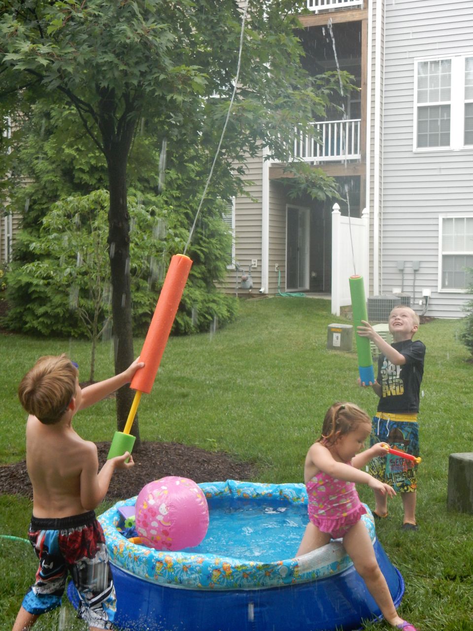 This morning, I surprised Kendall with a felt cupcake I made for her last night. I think it’s safe to say she liked it! 🙂 We had grand plans for a splash day playdate with Ty today, soaking up all the July sun and heat we could handle. But the weather had different plans, being a lot cooler and wetter than we’d expected! But, we did have some clear patches, and we made the most of it! We splashed and played and played with sprinklers and such, on the already-muddiest summer backyard you can imagine. 😉 So, the pool became a muddy puddle rather quickly, but the kids didn’t seem to mind. In any case, we hosed them down really well before going inside. 😉 Once everyone was dry and changed, we had a fun lunch of mac and cheese, hotdogs, and veg. Brandon had been watching some Neil DeGrasse Tyson lectures on Netflix, and somehow, the boys had the attention span to keep watching them. Awesome. 🙂 Pretty soon, the boys wanted dessert, and I hooked them up with some cute Japanese cookies I had on hand–Every Burger, cute cookies that look like little burgers, Yan Yan (like Pocky, but you dip the cookie sticks in a Nutella-like substance), and even the cute chocolate-covered biscuits that look like mini ice cream cones. Needless to say, they loved all of that. 😉 The kids played some more until it was time for Ty to go home. I did puzzles with Kendall while the boys played Star Wars and such. I found some really interesting creations afterward! Ice cream in the AT-AT? Sure, why not?! 😉
