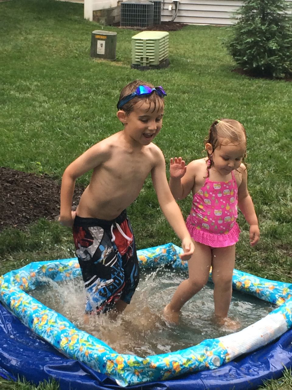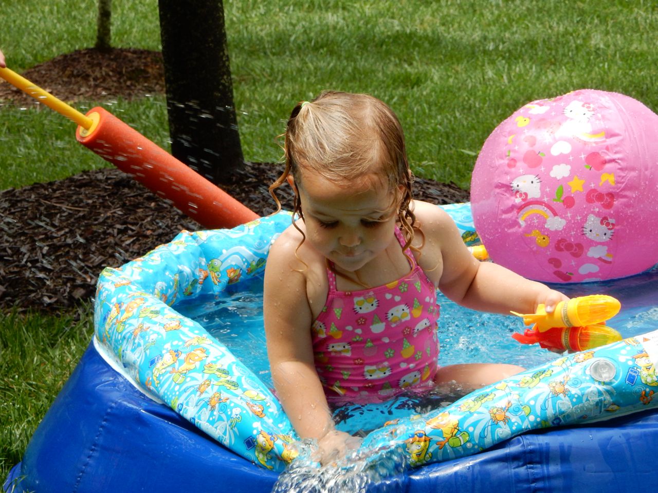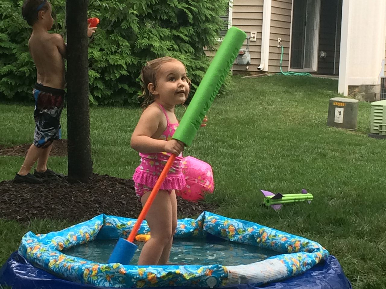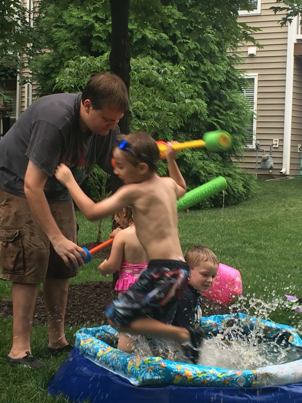 This morning, I surprised Kendall with a felt cupcake I made for her last night. I think it’s safe to say she liked it! 🙂 We had grand plans for a splash day playdate with Ty today, soaking up all the July sun and heat we could handle. But the weather had different plans, being a lot cooler and wetter than we’d expected! But, we did have some clear patches, and we made the most of it! We splashed and played and played with sprinklers and such, on the already-muddiest summer backyard you can imagine. 😉 So, the pool became a muddy puddle rather quickly, but the kids didn’t seem to mind. In any case, we hosed them down really well before going inside. 😉 Once everyone was dry and changed, we had a fun lunch of mac and cheese, hotdogs, and veg. Brandon had been watching some Neil DeGrasse Tyson lectures on Netflix, and somehow, the boys had the attention span to keep watching them. Awesome. 🙂 Pretty soon, the boys wanted dessert, and I hooked them up with some cute Japanese cookies I had on hand–Every Burger, cute cookies that look like little burgers, Yan Yan (like Pocky, but you dip the cookie sticks in a Nutella-like substance), and even the cute chocolate-covered biscuits that look like mini ice cream cones. Needless to say, they loved all of that. 😉 The kids played some more until it was time for Ty to go home. I did puzzles with Kendall while the boys played Star Wars and such. I found some really interesting creations afterward! Ice cream in the AT-AT? Sure, why not?! 😉