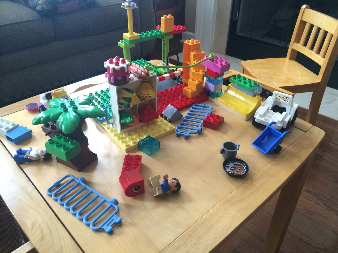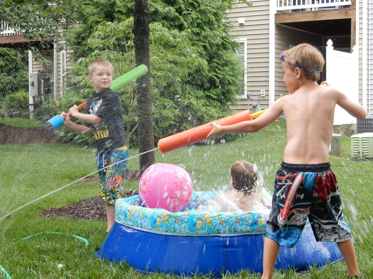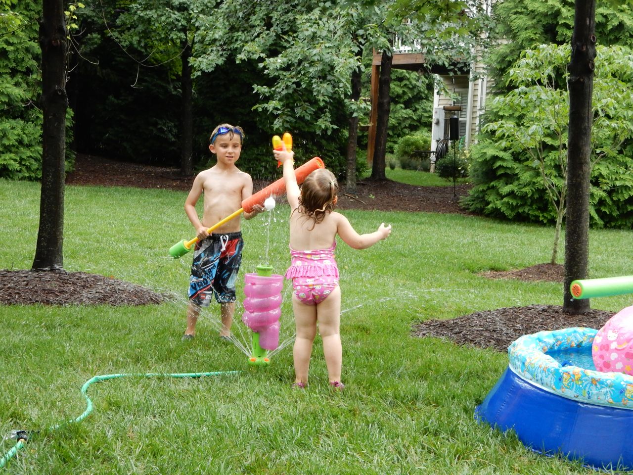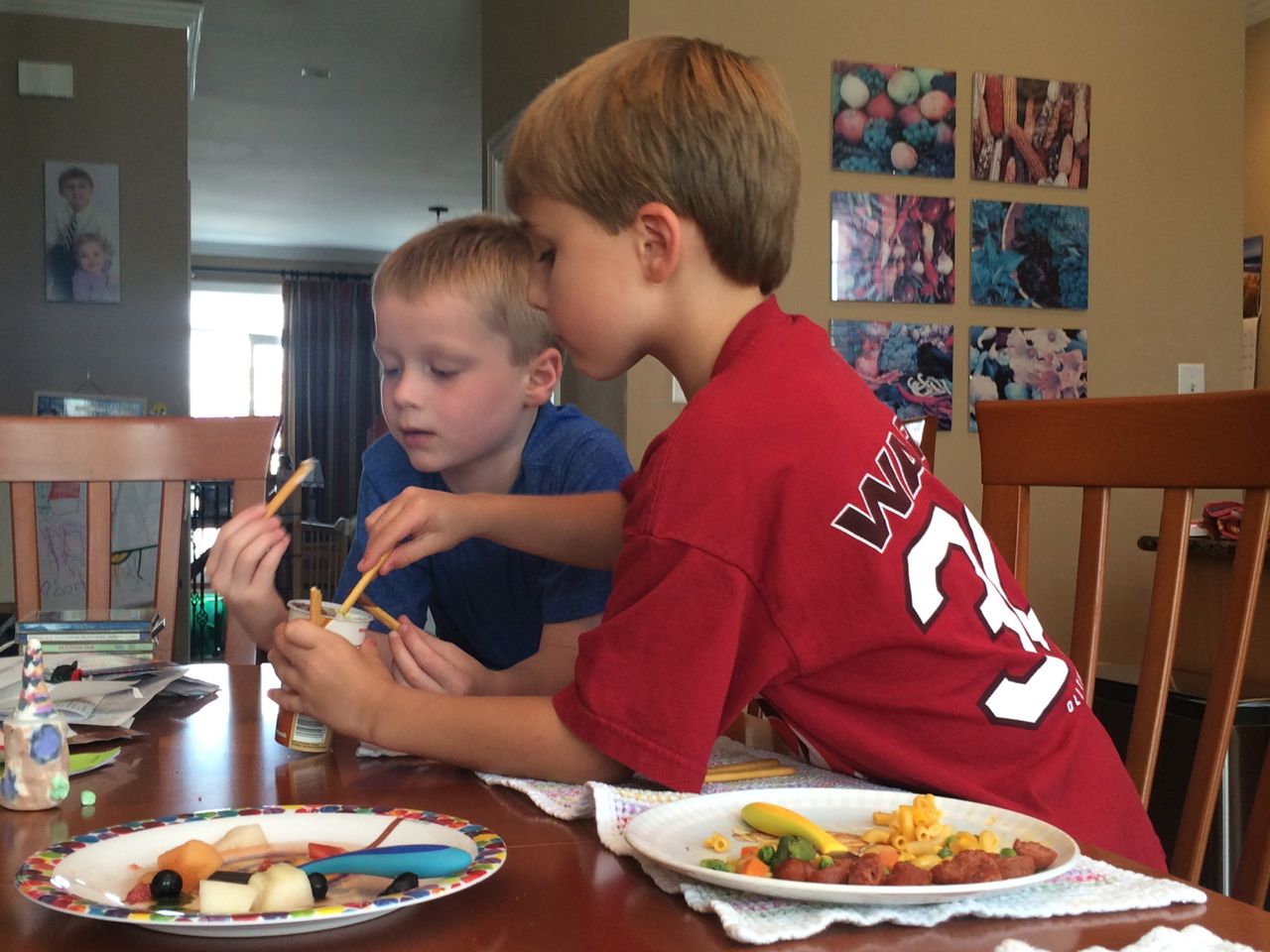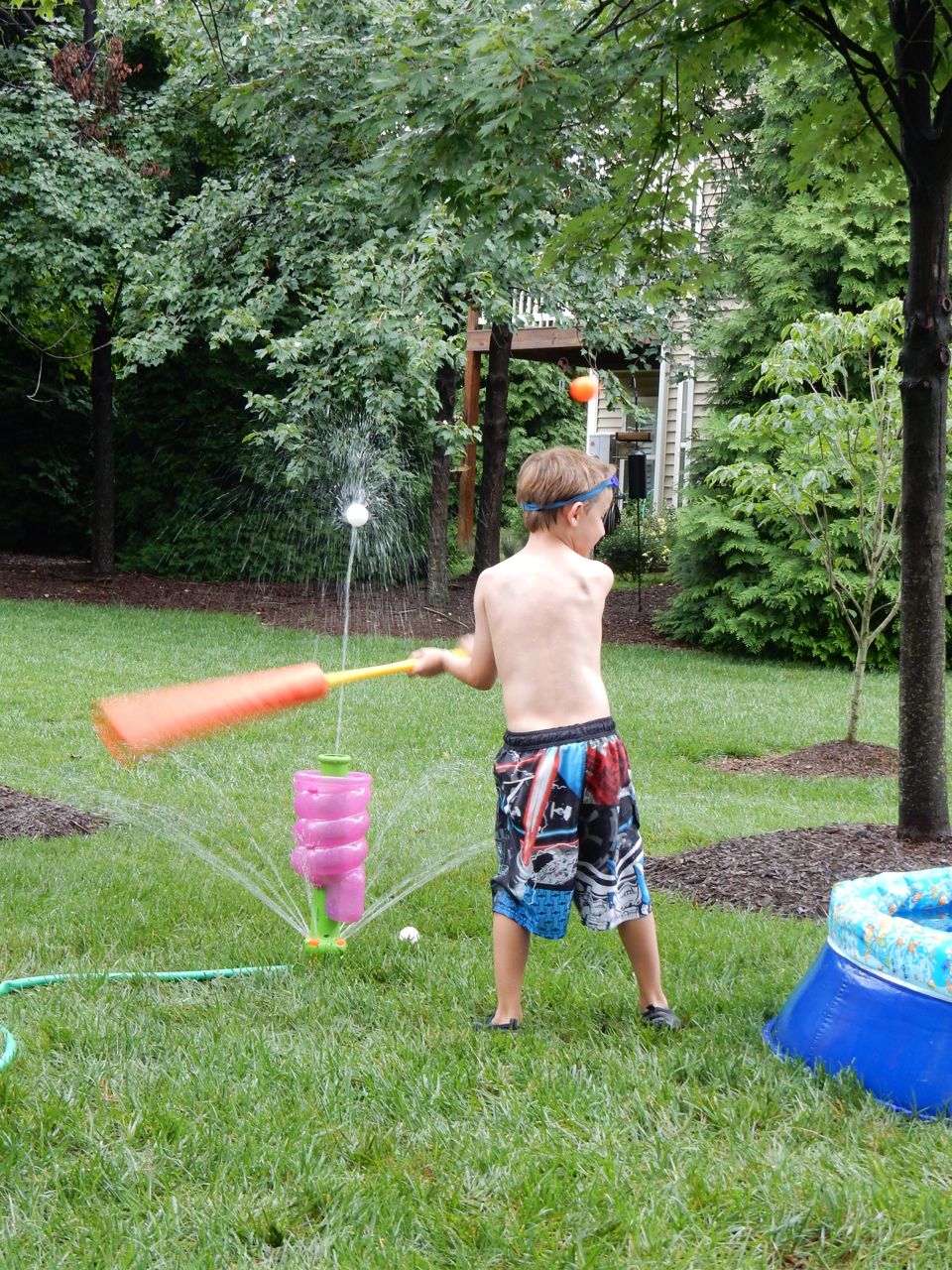 This morning, I surprised Kendall with a felt cupcake I made for her last night. I think it’s safe to say she liked it! 🙂 We had grand plans for a splash day playdate with Ty today, soaking up all the July sun and heat we could handle. But the weather had different plans, being a lot cooler and wetter than we’d expected! But, we did have some clear patches, and we made the most of it! We splashed and played and played with sprinklers and such, on the already-muddiest summer backyard you can imagine. 😉 So, the pool became a muddy puddle rather quickly, but the kids didn’t seem to mind. In any case, we hosed them down really well before going inside. 😉 Once everyone was dry and changed, we had a fun lunch of mac and cheese, hotdogs, and veg. Brandon had been watching some Neil DeGrasse Tyson lectures on Netflix, and somehow, the boys had the attention span to keep watching them. Awesome. 🙂 Pretty soon, the boys wanted dessert, and I hooked them up with some cute Japanese cookies I had on hand–Every Burger, cute cookies that look like little burgers, Yan Yan (like Pocky, but you dip the cookie sticks in a Nutella-like substance), and even the cute chocolate-covered biscuits that look like mini ice cream cones. Needless to say, they loved all of that. 😉 The kids played some more until it was time for Ty to go home. I did puzzles with Kendall while the boys played Star Wars and such. I found some really interesting creations afterward! Ice cream in the AT-AT? Sure, why not?! 😉