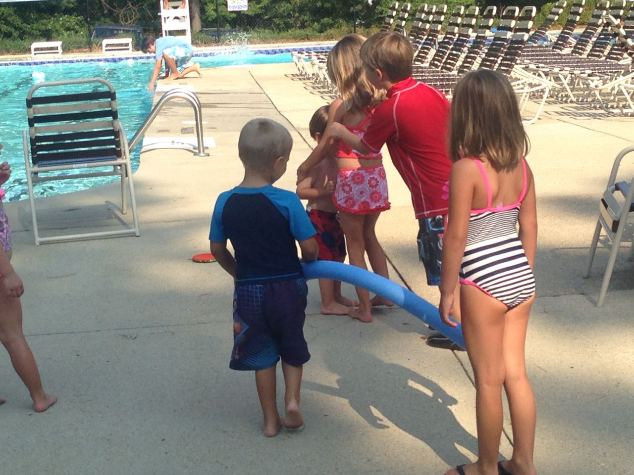 Way-back in preschool, Brian seemed to have about three birthday parties a month by the time he graduated. But, with Kindergarten, and a whole lot of new people, the parties settled-down to a more manageable number. It has almost gotten to the point where I miss them. So, what luck, Ella had a Birthday pool party! This was especially fun since it was the middle of summer break, so a lot of Mrs. Boswell’s kids and parents got together to catch up and have fun poolside. There were horrible thunderstorms leading-up to party time, to the point where I was almost sure the party would be cancelled. But, after picking up Brian from his Mad Science Summer Camp and getting back home, I decided we’d try to get out there. And, about two miles out, the clouds parted, the sun came out, and it was a beautiful evening to hang-out!