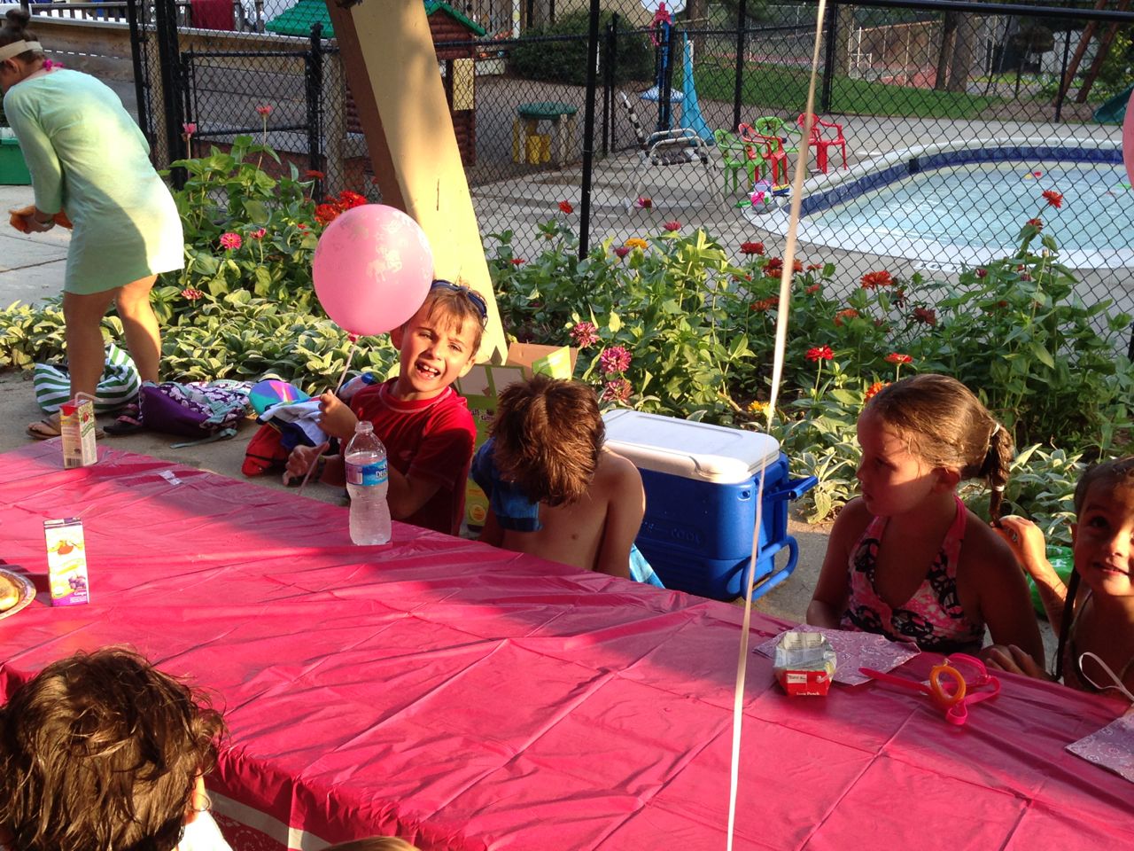 Besides just playing in the pool, the piñata was it’s normal fun. This was the first party I’d been to where we had both a rope breakage and a stick snap. It resulted in Ella’s dad having to pull the piñata apart to get the goodies inside. The kids didn’t mind, they still got their goodies!