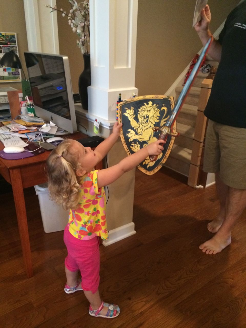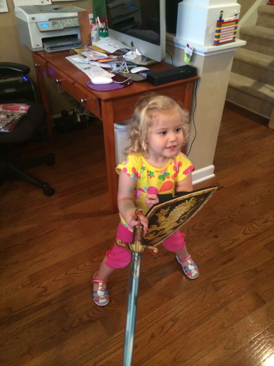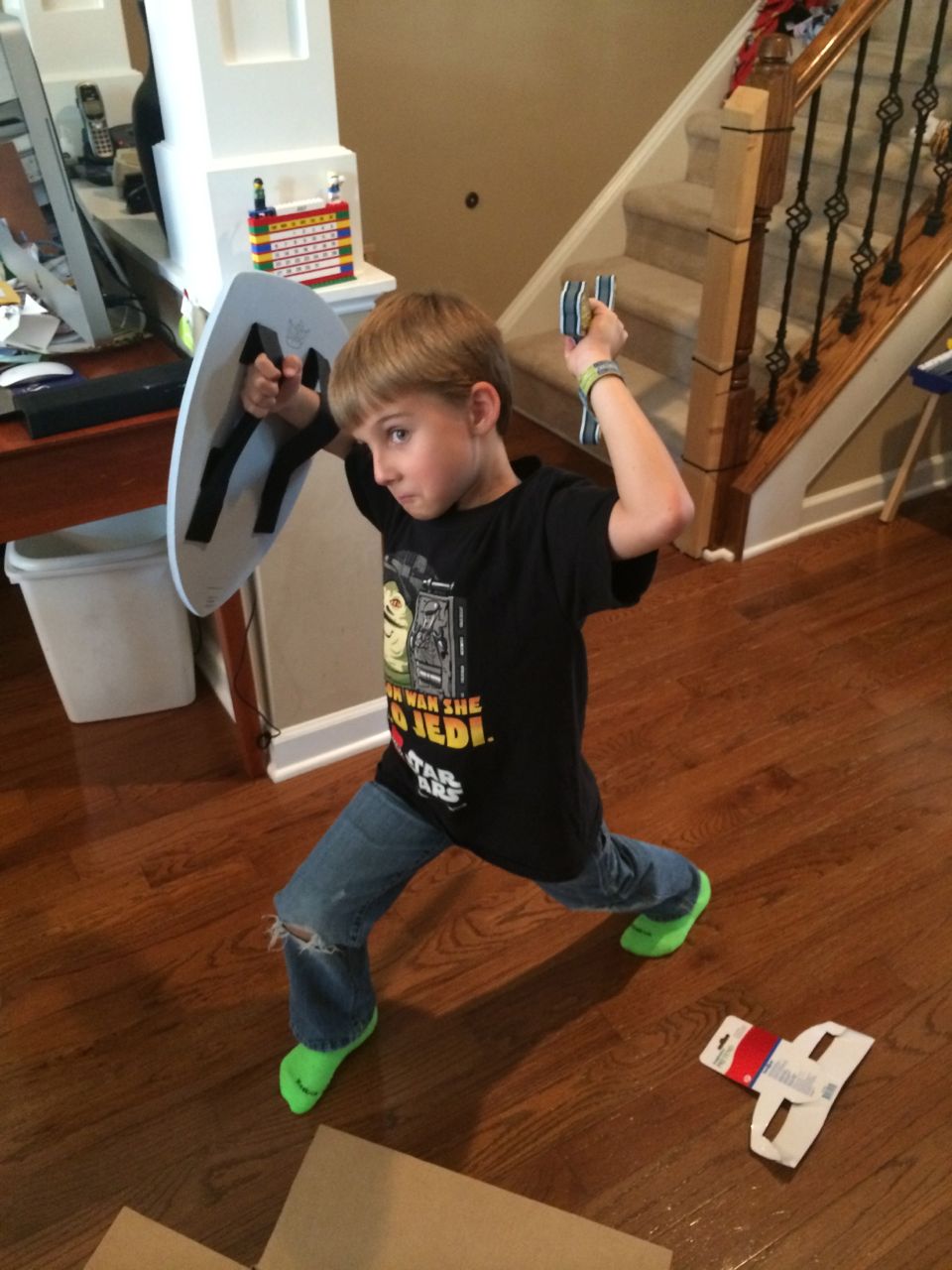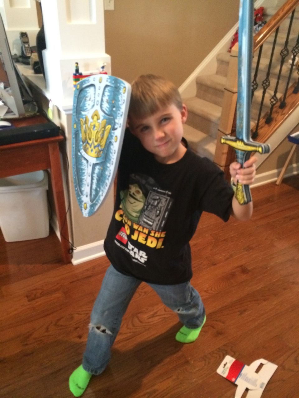 Brian first spotted these at ToysRUs quite awhile ago, and I wasn’t sure he’d still be into them now–but oh boy, am I glad I decided to get two sets! Both kids just love their foam swords and shields. I suppose it’s because of the Dragon movie being such a huge deal for them right now (leaving aside the fact that these don’t look like Viking gear in the slightest!)