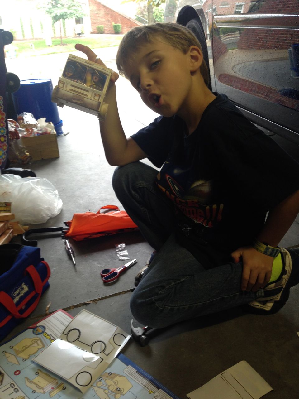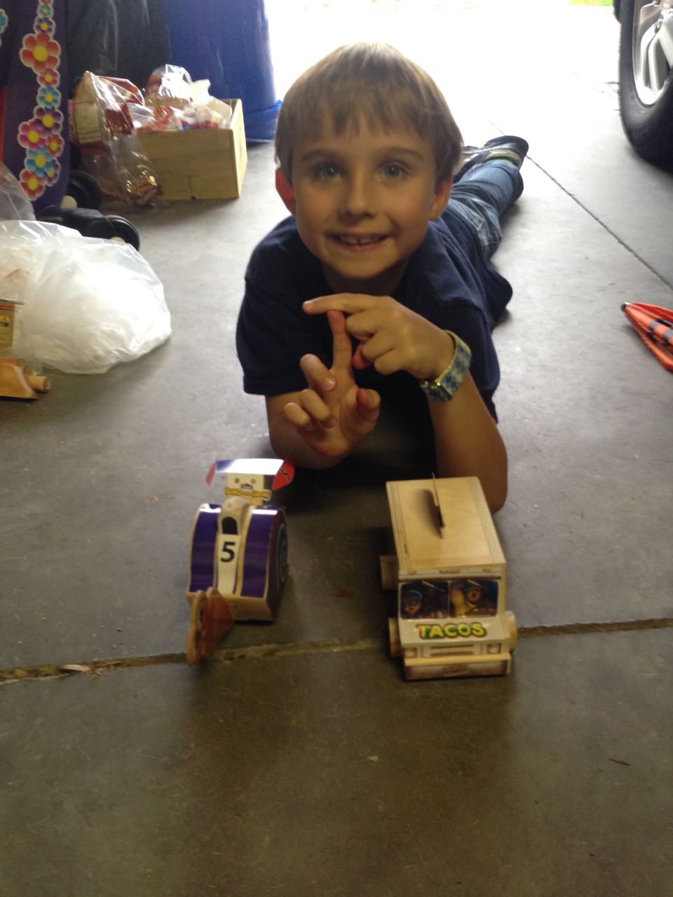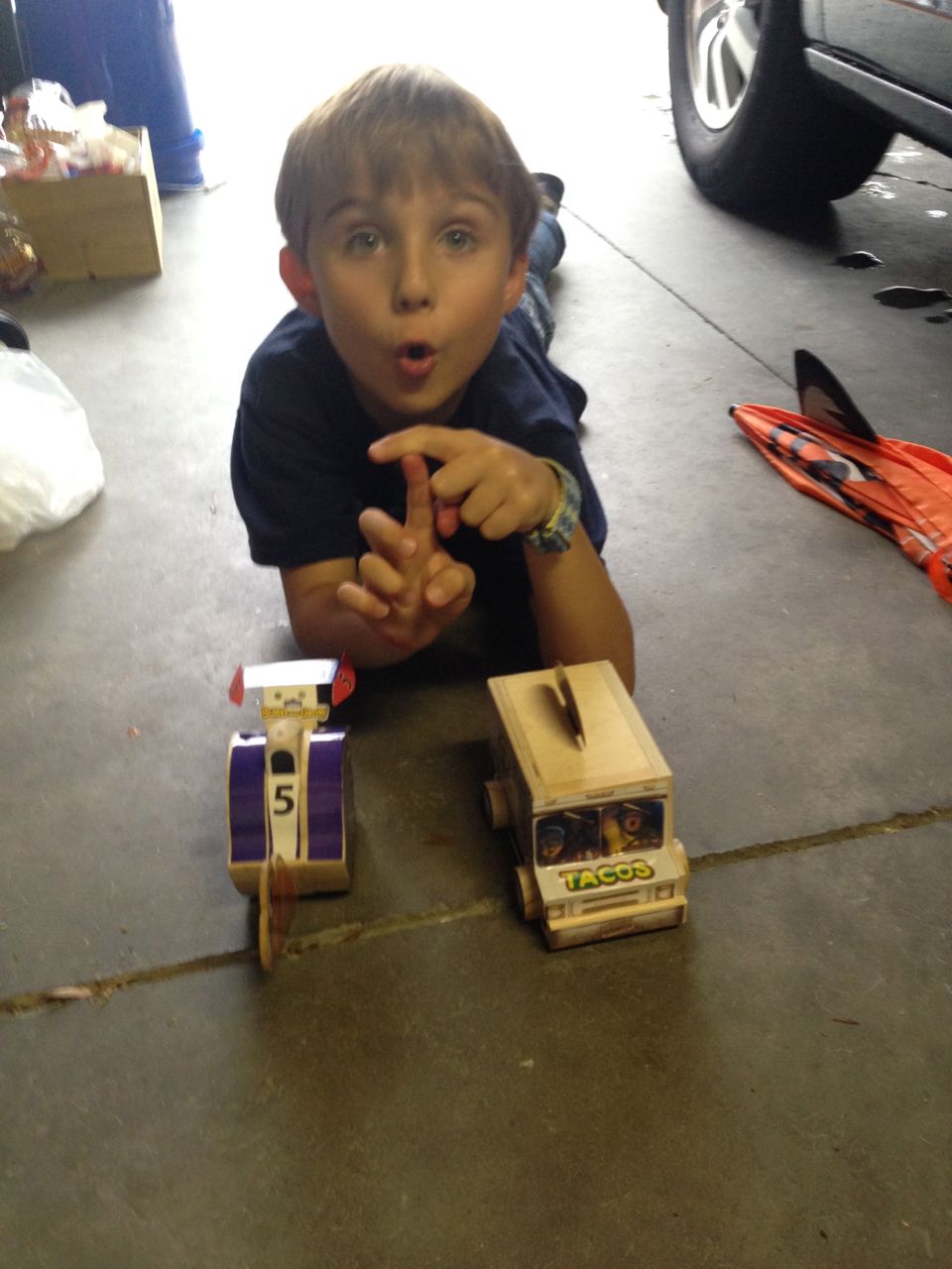 Brian caught up on his Turbo-themed Lowes Build and Grow projects today after his Mad Science: Eureka! camp. He now has both a cool pull-back Turbo he made previously (the super-fast snail from the movie which bears his name) and the really cute Taco Truck he made today, which belonged to the main human characters from the Turbo movie.