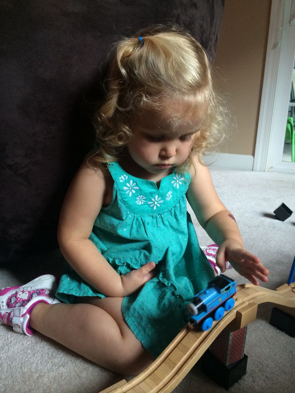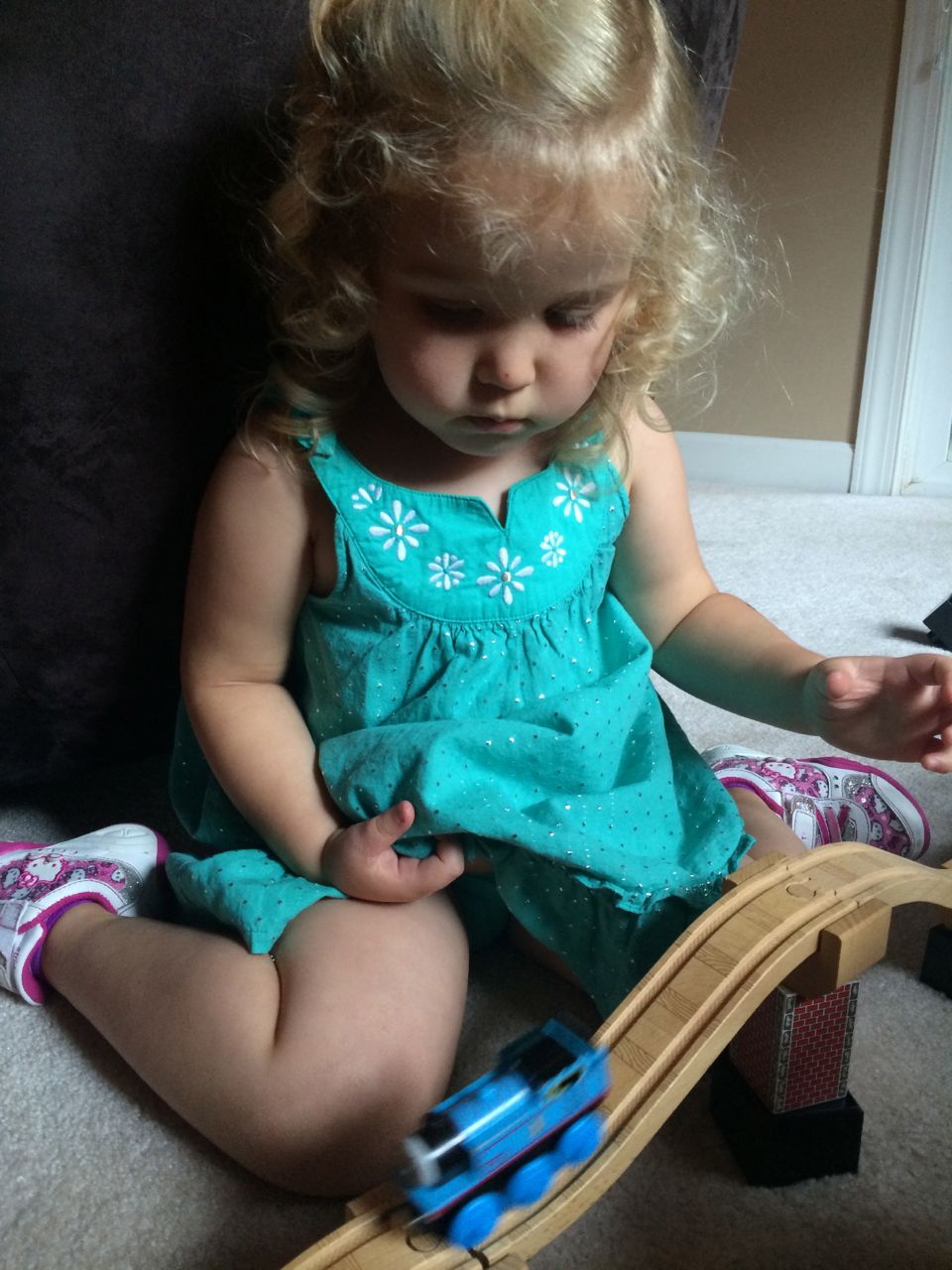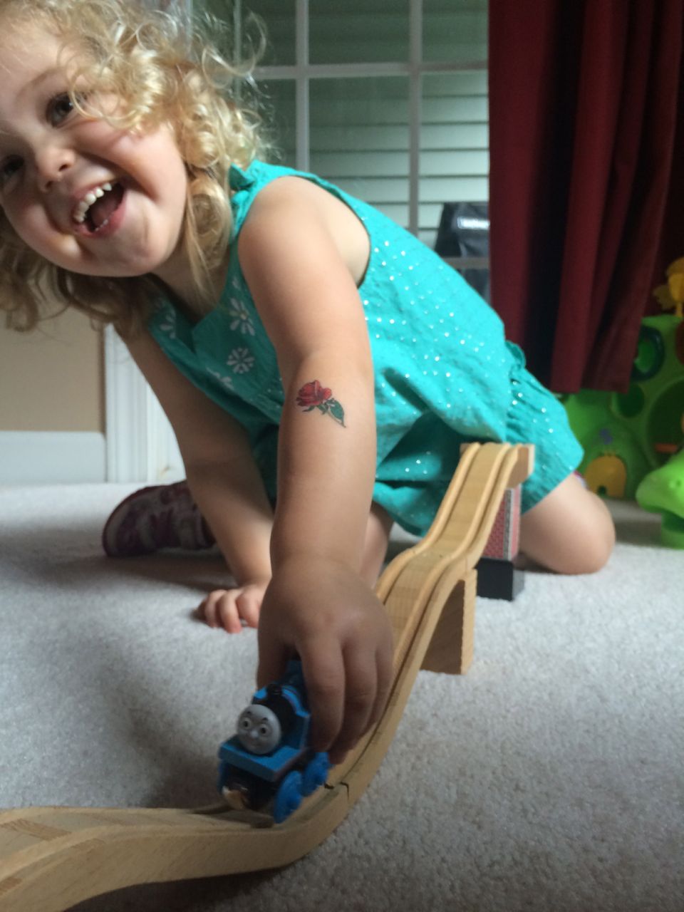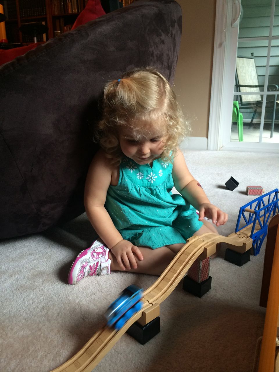 I’ve come to really look forward to my Tuesday afternoons with Kendall! While Brian is at skating lessons, Kendall and I have some girl time. She’s so cute, every time I pick her up, she asks, “Do we have Mommy’s car?” She cheers when I say that we do. Then, on the ride home, she asks if we can do all of the things we’ve done on previous afternoons together. “Can we play with Baby Jenna?” “Can we ride bikes?” “Can we have lemonade?” Sometimes we do the repeat activity she requests, but sometimes, I’ll present her with a new idea. Today, we enjoyed mango popsicles outside, and then went in for some Thomas races. We practiced building ramps and seeing how far we could get Thomas to go, cheering whenever we had a new record! Kendall was so serious when she was building, and so cute when she was celebrating! She still loves her sparkly “mermaid dress” and having a temporary tattoo. 😉