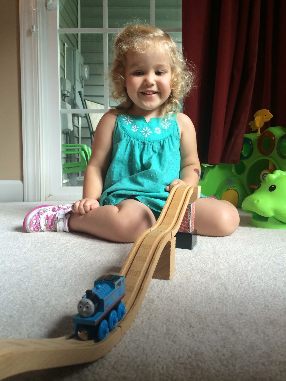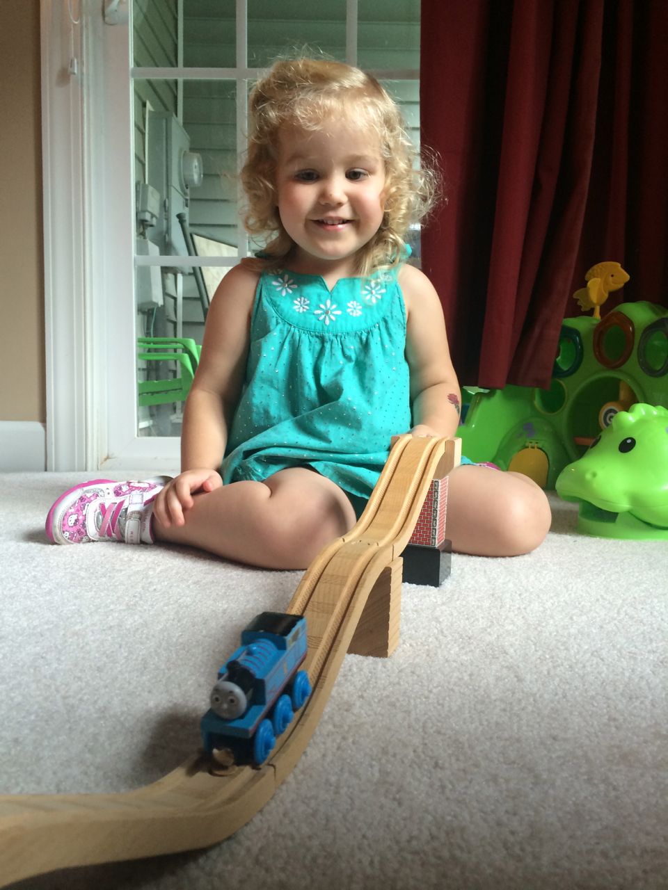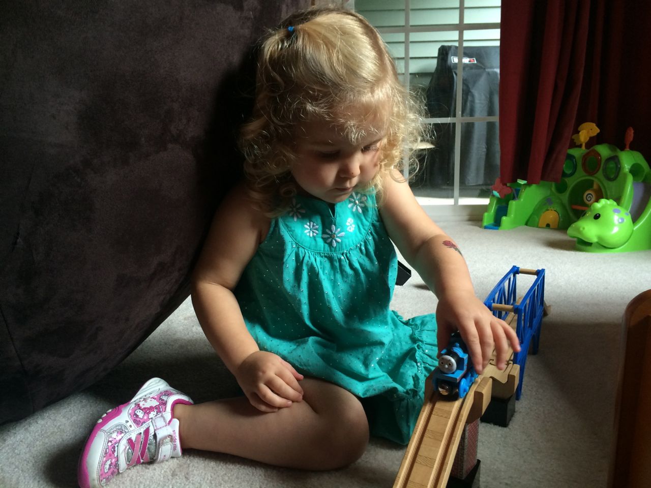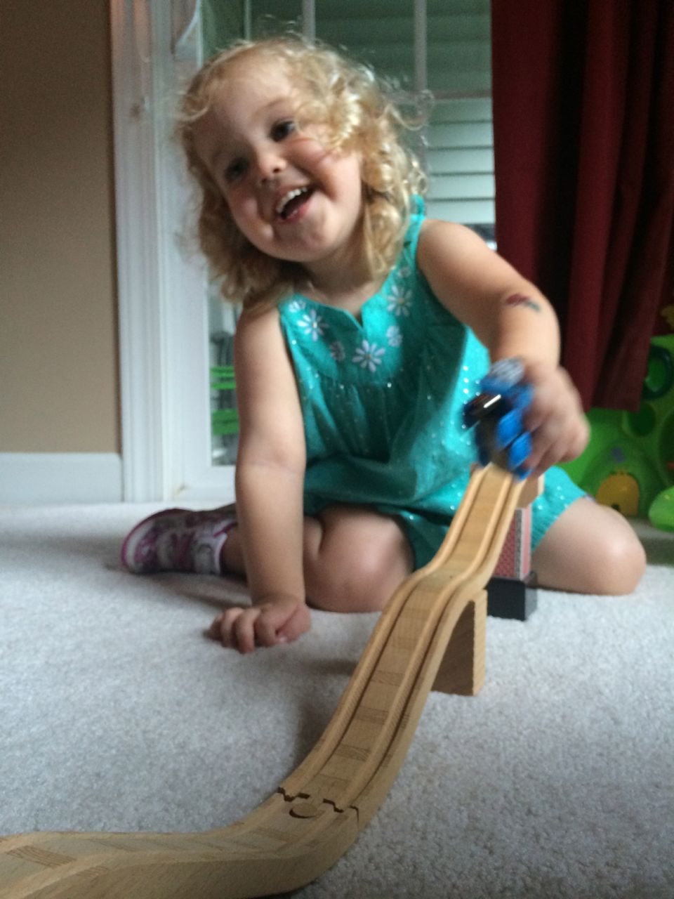 I’ve come to really look forward to my Tuesday afternoons with Kendall! While Brian is at skating lessons, Kendall and I have some girl time. She’s so cute, every time I pick her up, she asks, “Do we have Mommy’s car?” She cheers when I say that we do. Then, on the ride home, she asks if we can do all of the things we’ve done on previous afternoons together. “Can we play with Baby Jenna?” “Can we ride bikes?” “Can we have lemonade?” Sometimes we do the repeat activity she requests, but sometimes, I’ll present her with a new idea. Today, we enjoyed mango popsicles outside, and then went in for some Thomas races. We practiced building ramps and seeing how far we could get Thomas to go, cheering whenever we had a new record! Kendall was so serious when she was building, and so cute when she was celebrating! She still loves her sparkly “mermaid dress” and having a temporary tattoo. 😉