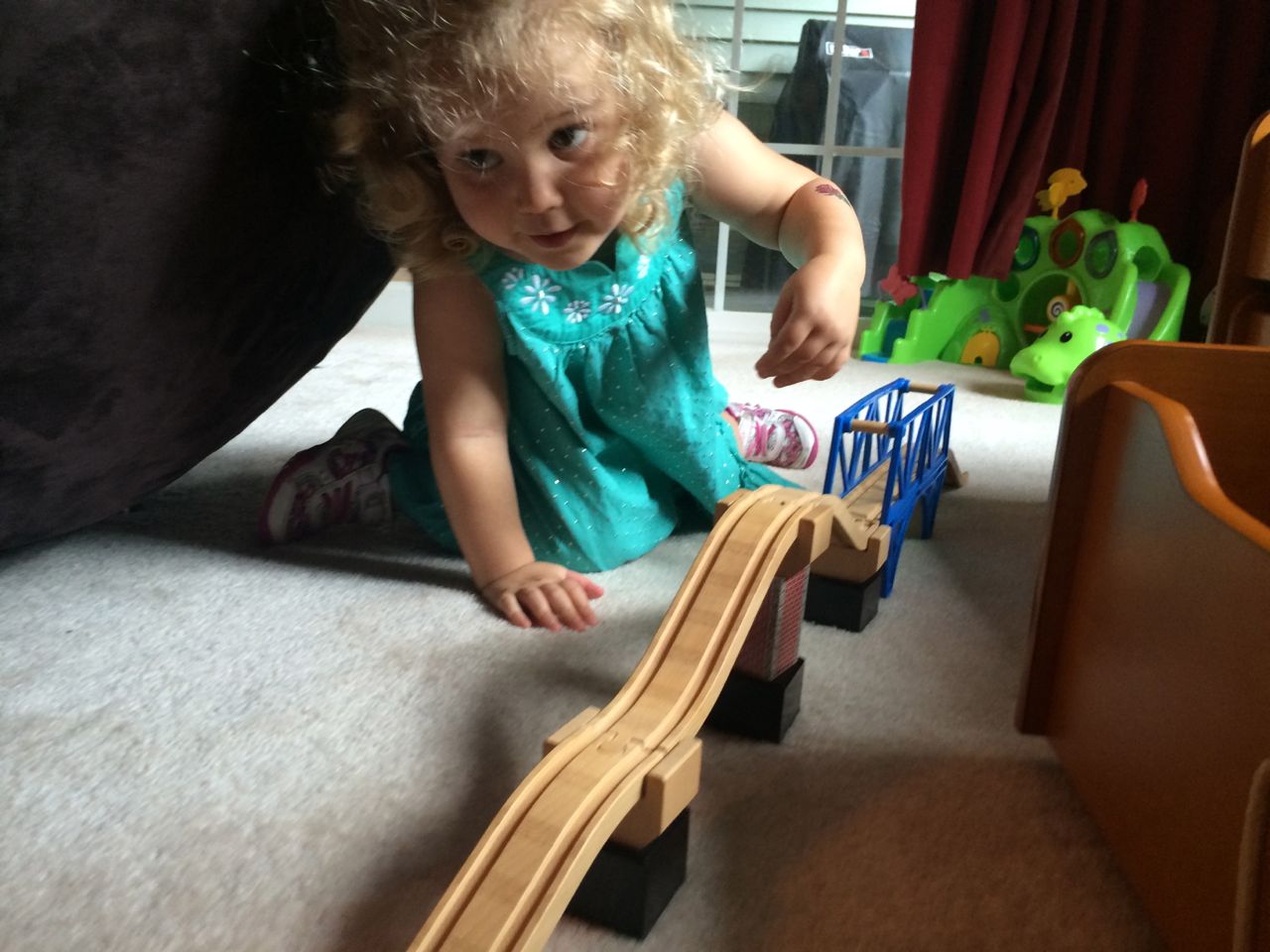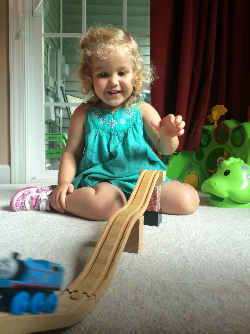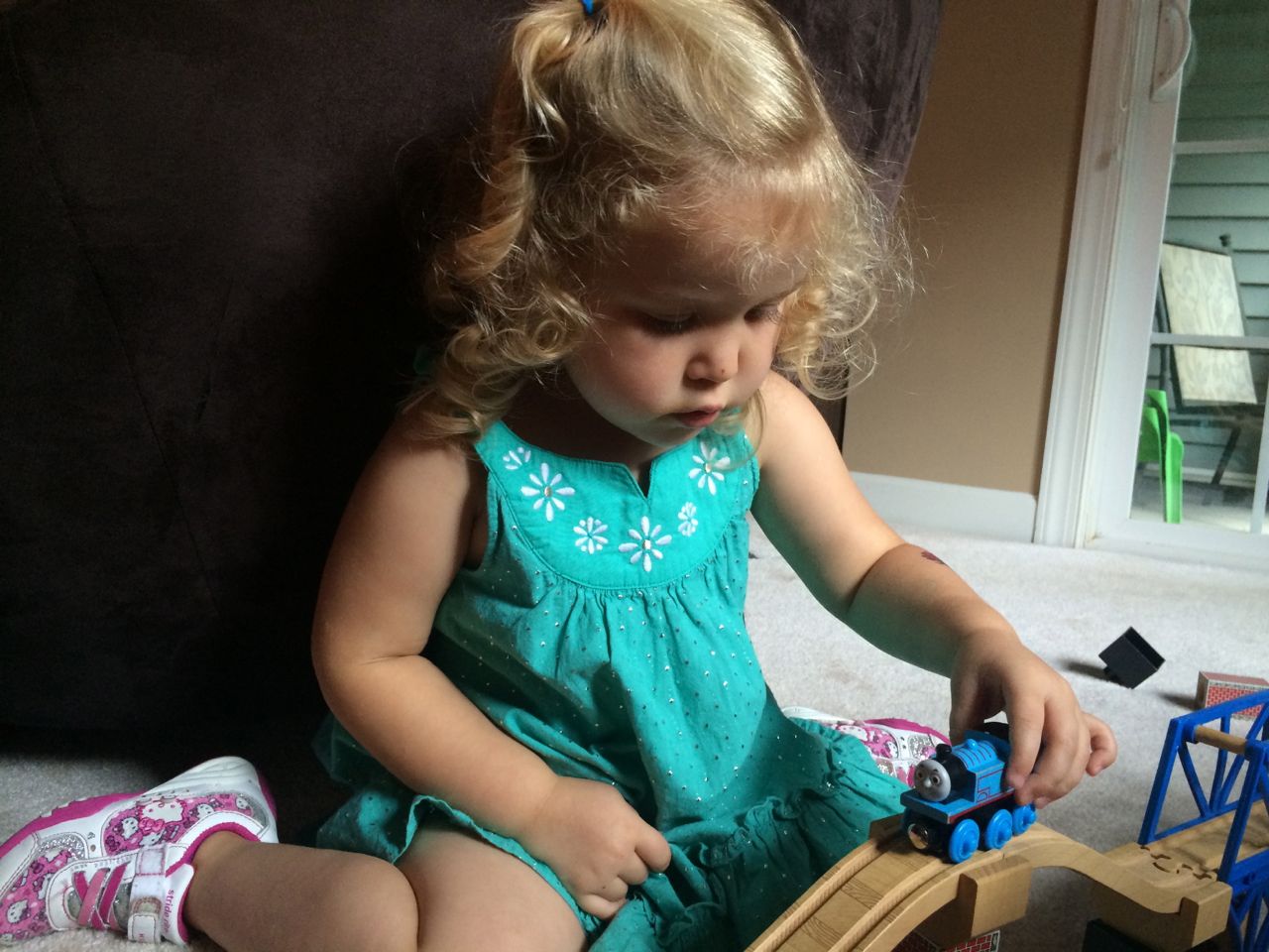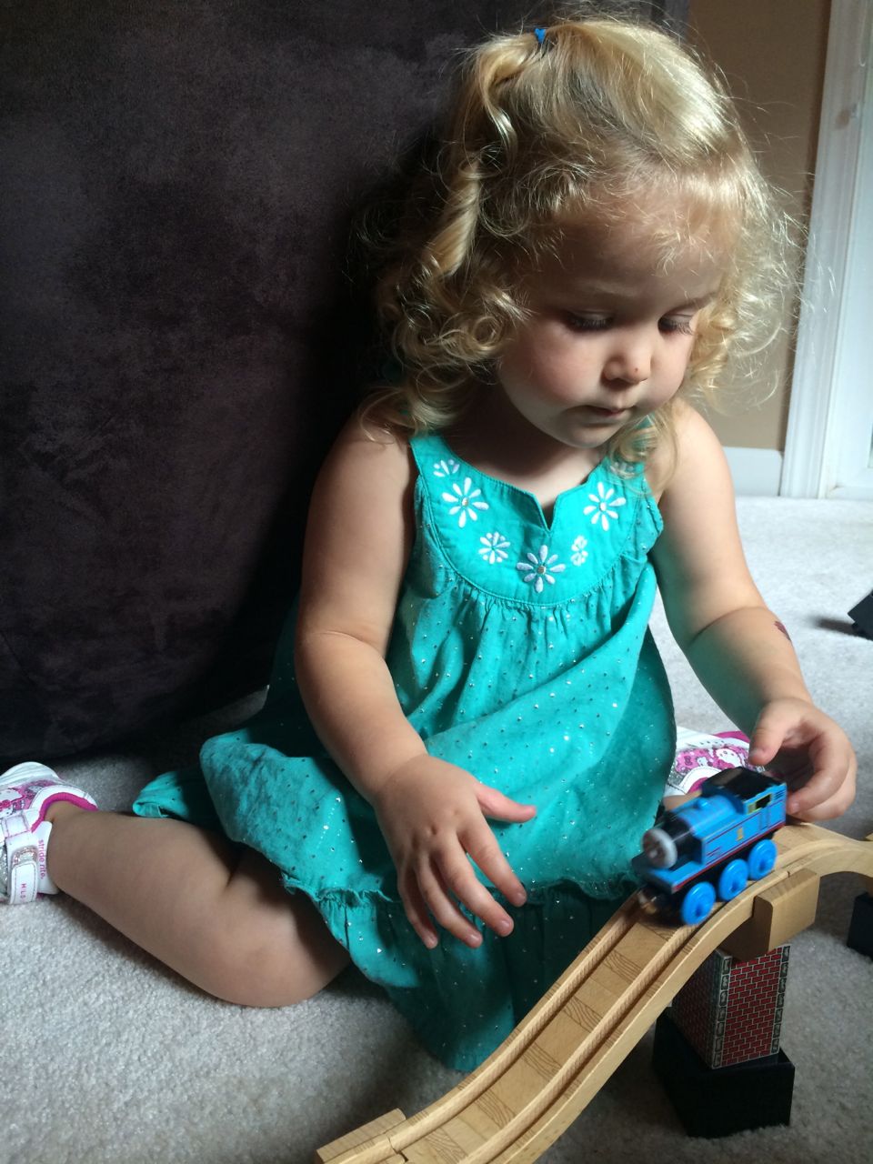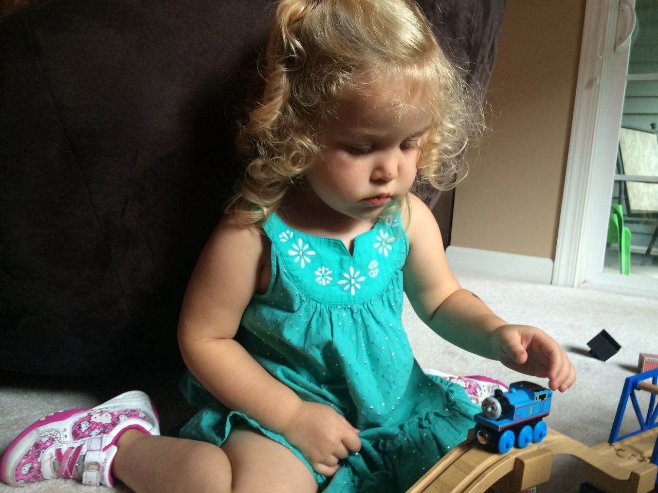 I’ve come to really look forward to my Tuesday afternoons with Kendall! While Brian is at skating lessons, Kendall and I have some girl time. She’s so cute, every time I pick her up, she asks, “Do we have Mommy’s car?” She cheers when I say that we do. Then, on the ride home, she asks if we can do all of the things we’ve done on previous afternoons together. “Can we play with Baby Jenna?” “Can we ride bikes?” “Can we have lemonade?” Sometimes we do the repeat activity she requests, but sometimes, I’ll present her with a new idea. Today, we enjoyed mango popsicles outside, and then went in for some Thomas races. We practiced building ramps and seeing how far we could get Thomas to go, cheering whenever we had a new record! Kendall was so serious when she was building, and so cute when she was celebrating! She still loves her sparkly “mermaid dress” and having a temporary tattoo. 😉