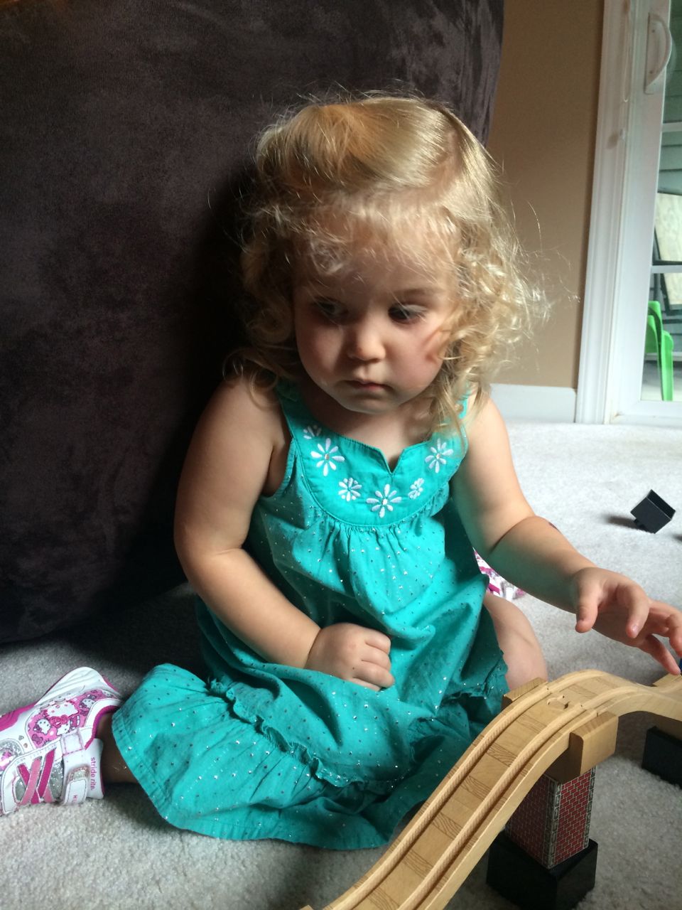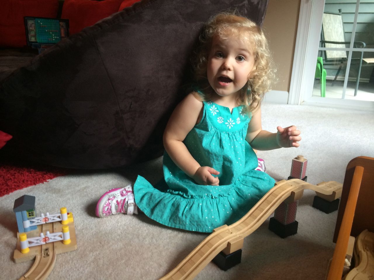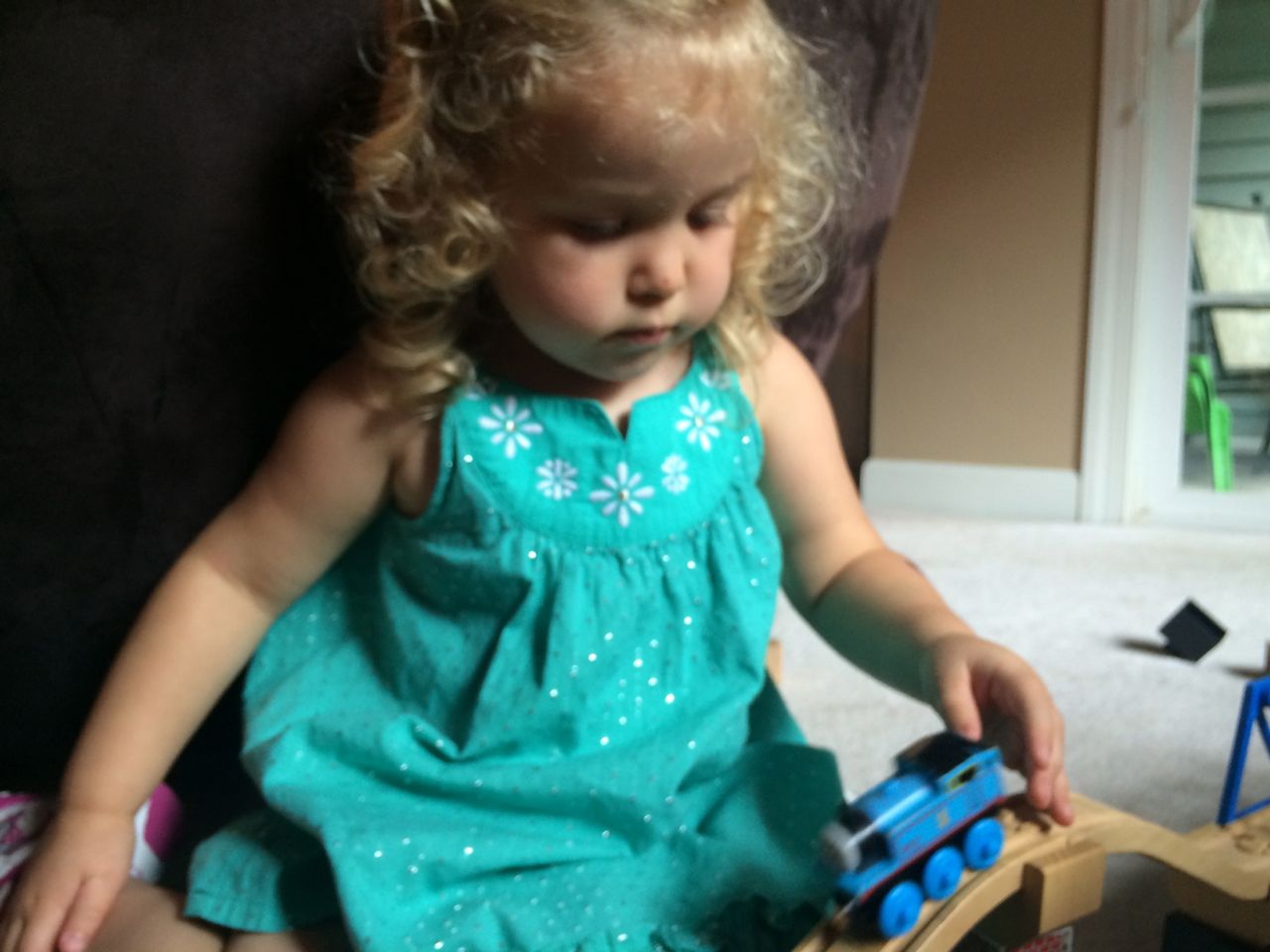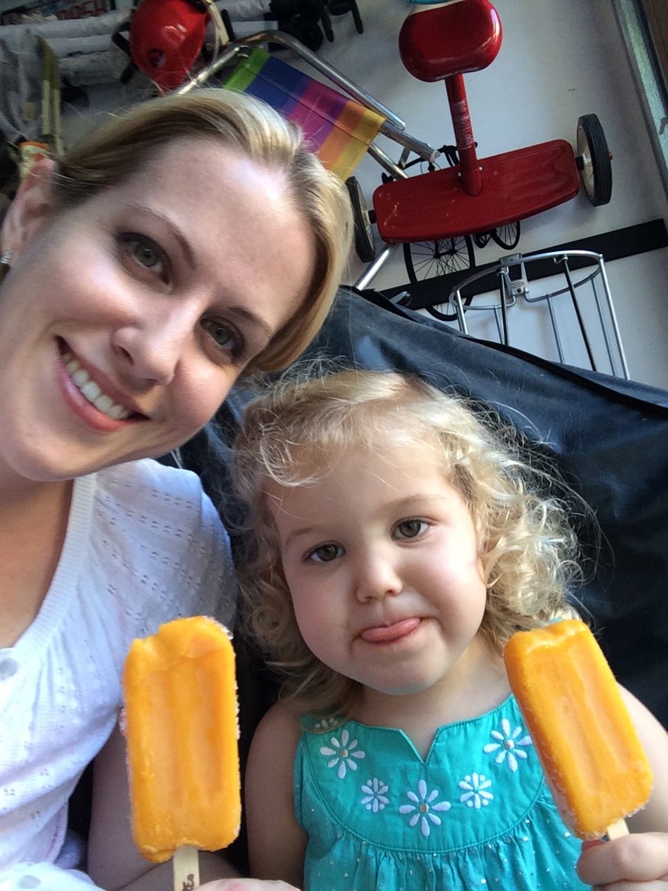I’ve come to really look forward to my Tuesday afternoons with Kendall! While Brian is at skating lessons, Kendall and I have some girl time. She’s so cute, every time I pick her up, she asks, “Do we have Mommy’s car?” She cheers when I say that we do. Then, on the ride home, she asks if we can do all of the things we’ve done on previous afternoons together. “Can we play with Baby Jenna?” “Can we ride bikes?” “Can we have lemonade?” Sometimes we do the repeat activity she requests, but sometimes, I’ll present her with a new idea. Today, we enjoyed mango popsicles outside, and then went in for some Thomas races. We practiced building ramps and seeing how far we could get Thomas to go, cheering whenever we had a new record! Kendall was so serious when she was building, and so cute when she was celebrating! She still loves her sparkly “mermaid dress” and having a temporary tattoo. 😉