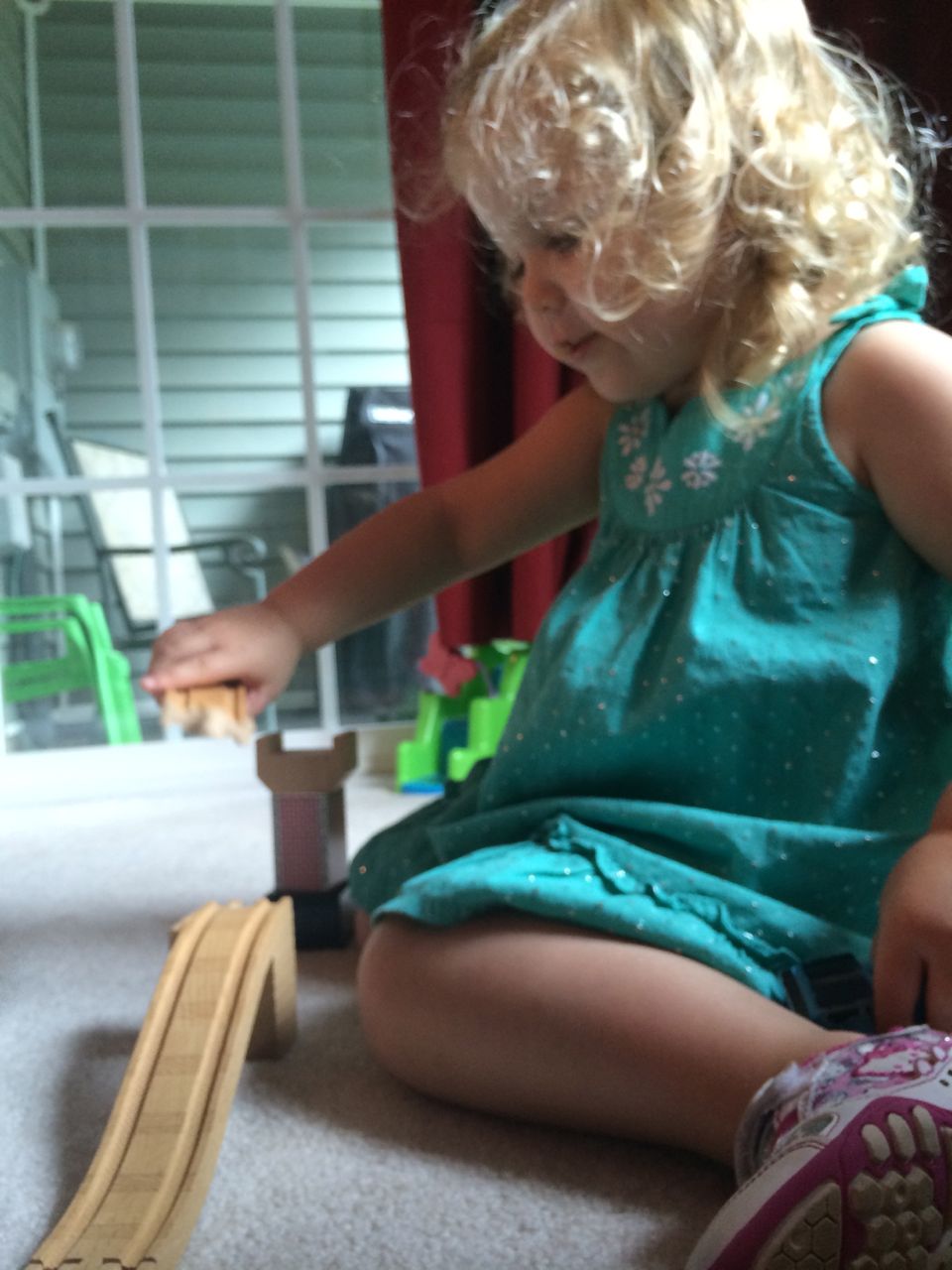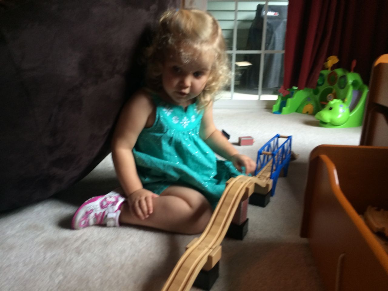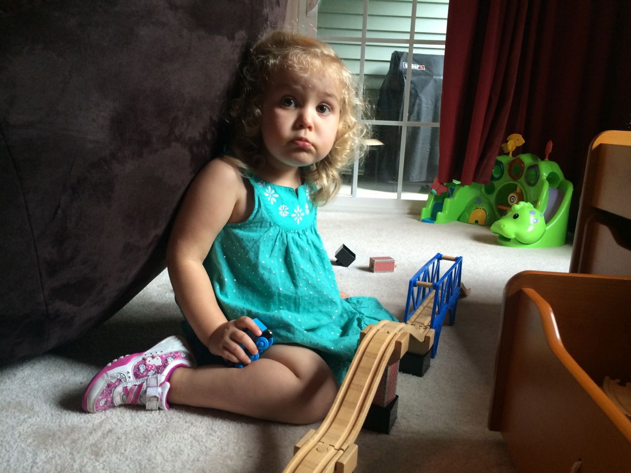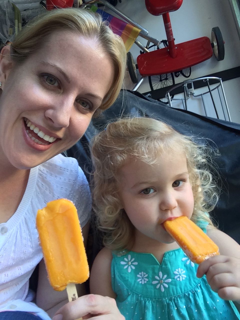 I’ve come to really look forward to my Tuesday afternoons with Kendall! While Brian is at skating lessons, Kendall and I have some girl time. She’s so cute, every time I pick her up, she asks, “Do we have Mommy’s car?” She cheers when I say that we do. Then, on the ride home, she asks if we can do all of the things we’ve done on previous afternoons together. “Can we play with Baby Jenna?” “Can we ride bikes?” “Can we have lemonade?” Sometimes we do the repeat activity she requests, but sometimes, I’ll present her with a new idea. Today, we enjoyed mango popsicles outside, and then went in for some Thomas races. We practiced building ramps and seeing how far we could get Thomas to go, cheering whenever we had a new record! Kendall was so serious when she was building, and so cute when she was celebrating! She still loves her sparkly “mermaid dress” and having a temporary tattoo. 😉