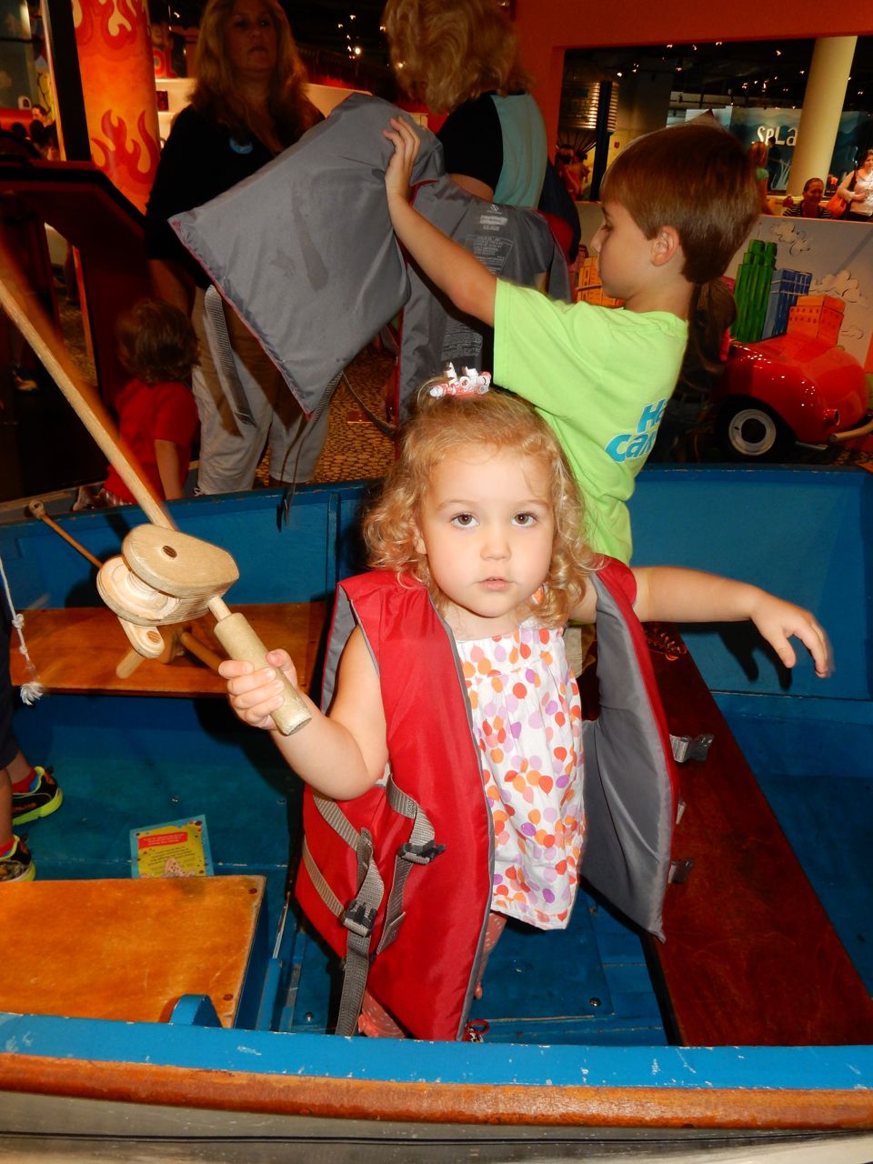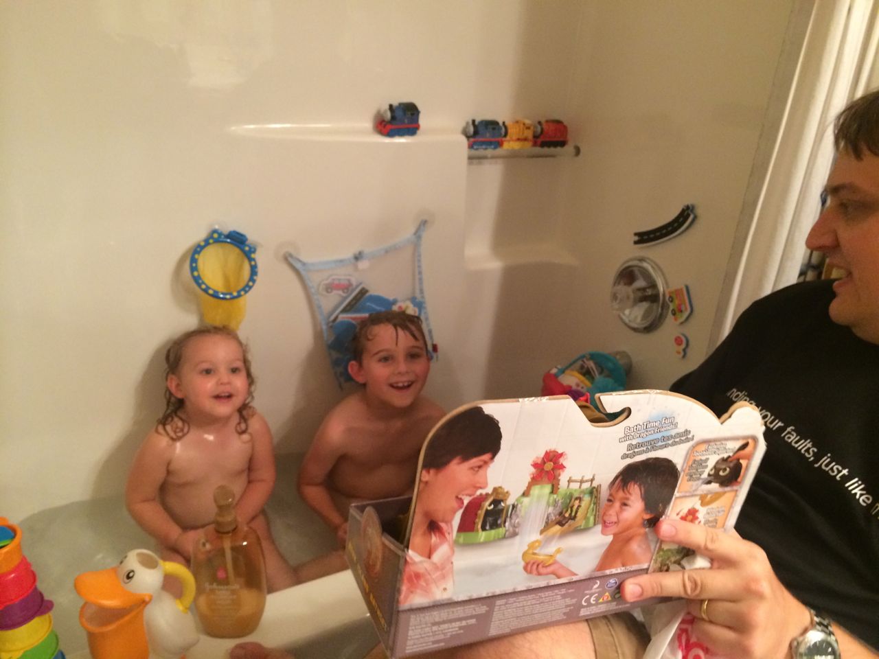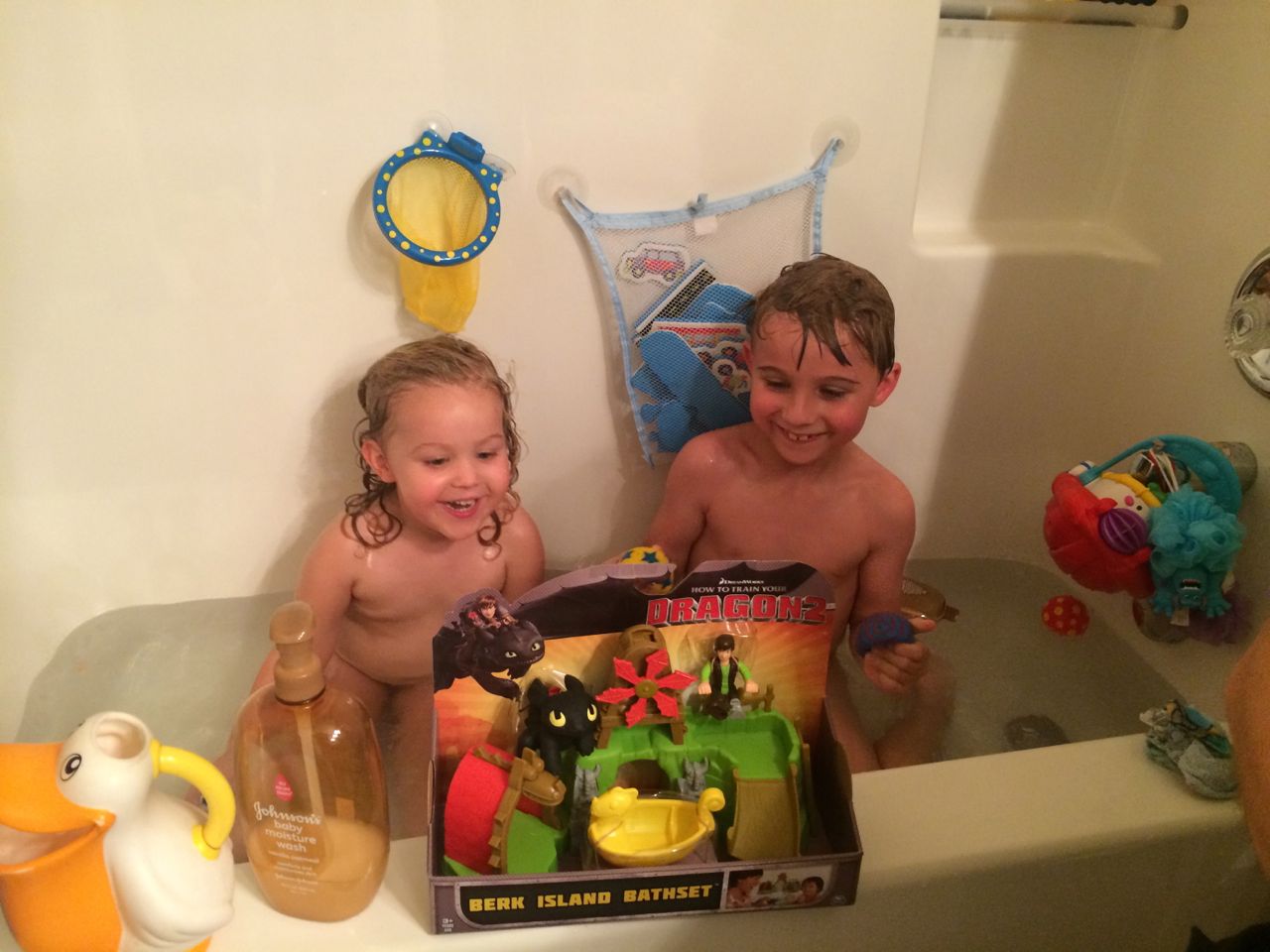 This morning, the kids were being so silly, dancing and playing with their playsilks and the chaise lounge pillow. When Brian was wearing that pillow+scarf on his head, he (inexplicably and repeatedly) called it his “Taco Hat”. (edit: Kendall evidently remembers that, since she put the pillow on her head and called it “Taco Hat” today–January 2, 2015!! The girl remembers ev-ar-y-thing.) We decided to take the kids to Marbles today since it was Goddard School Day, and as usual, it was a hoot and a half. The kids played with all their usual favorites: the pirate ship, the fishing boat, the ambulance, the farm animals, the giant blocks, the kitchen/restaurant and grocery store, and the under the sea room. The “News Around Town” was a new feature, and we tried to get Kendall to notice Brian and Daddy on the screen–they were standing over by the ambulance! The kids played with the giant foam blocks for the longest time before we even went in–they were making each other very fancy royal thrones! The outdoor water play area was another highlight today, perfect on a hot August afternoon. We had lunch at Pogo afterward which is always delicious (hands-down, they have the best damn fried okra in NC.) Both kids ate a good lunch, and were able to realize their dream of getting the Hershey’s shakes, that you buy out of a freezer case and have spun up by the special machine–it’s all very exciting. 😉 I picked up a few things at Target later this afternoon, and surprised the kids at bathtime with a super-fun-looking How to Train Your Dragon bathtub Berk Island playset! It has a lot of cool features, including a miniature viking ship, water wheel, slide, a place to stow your dragon (or maybe it’s a house for your rider?), and of course a Hiccup figure and a Toothless that squirts water (instead of plasma blasts!) They were just over the moon about that toy! 😀