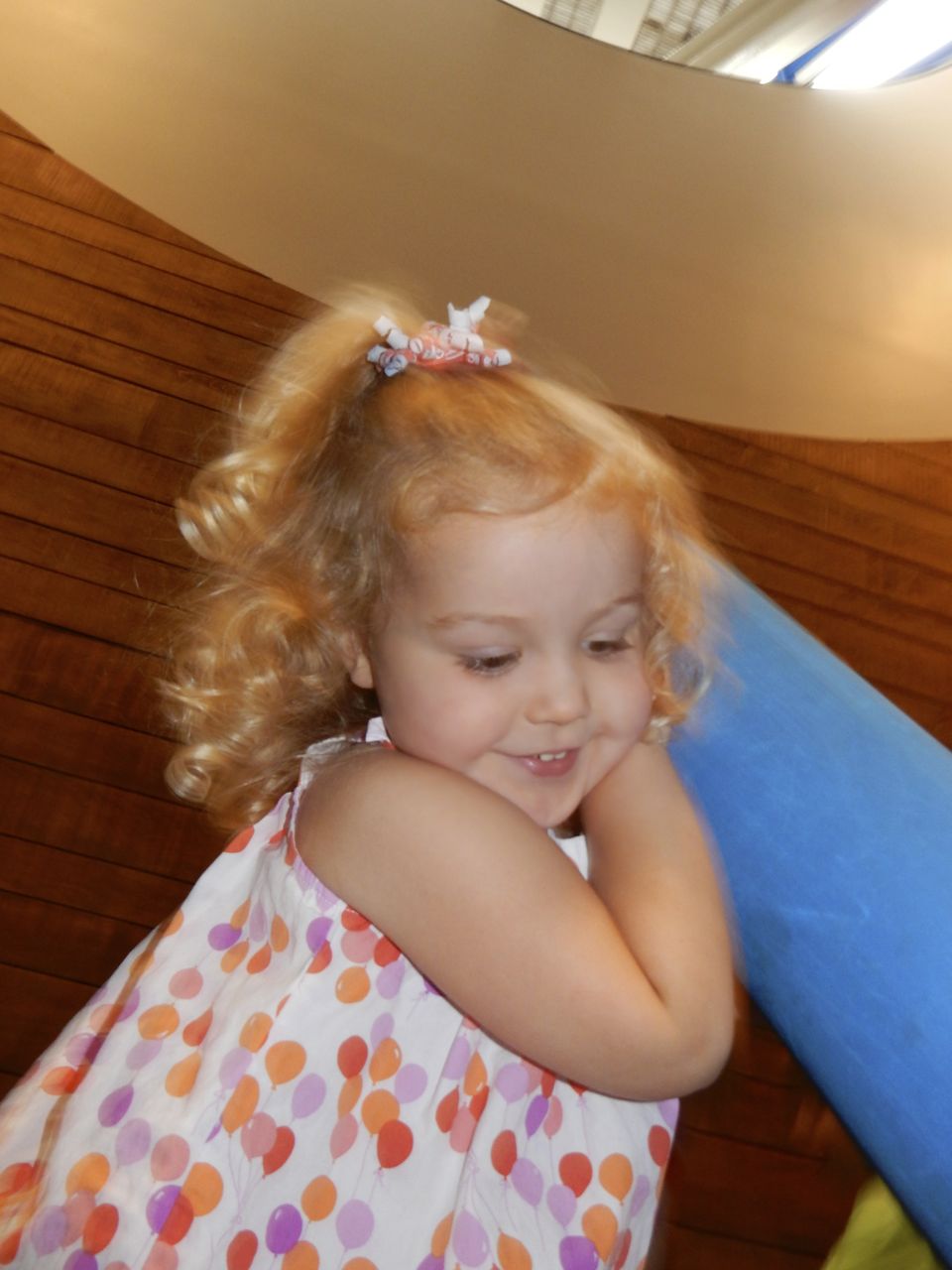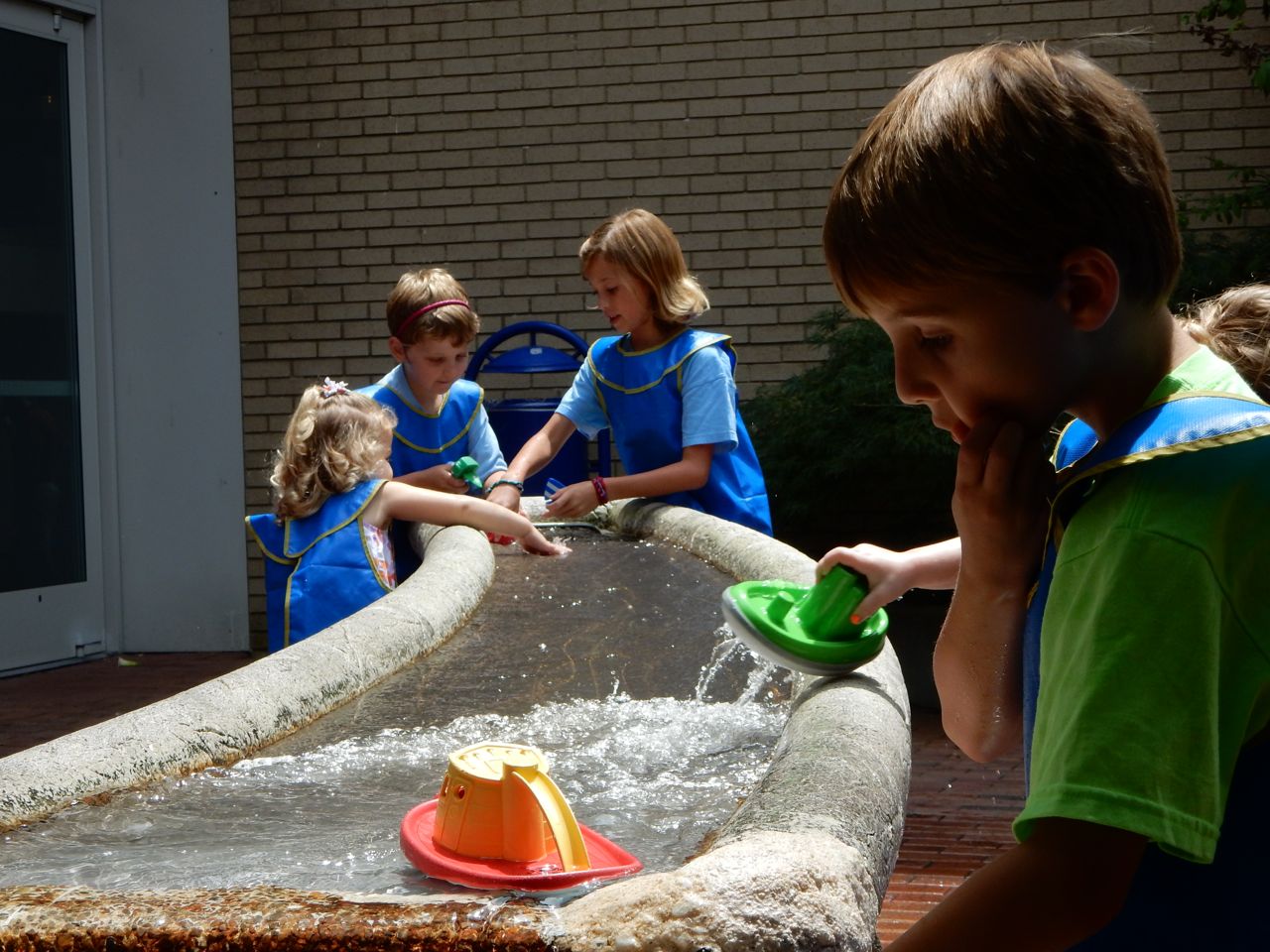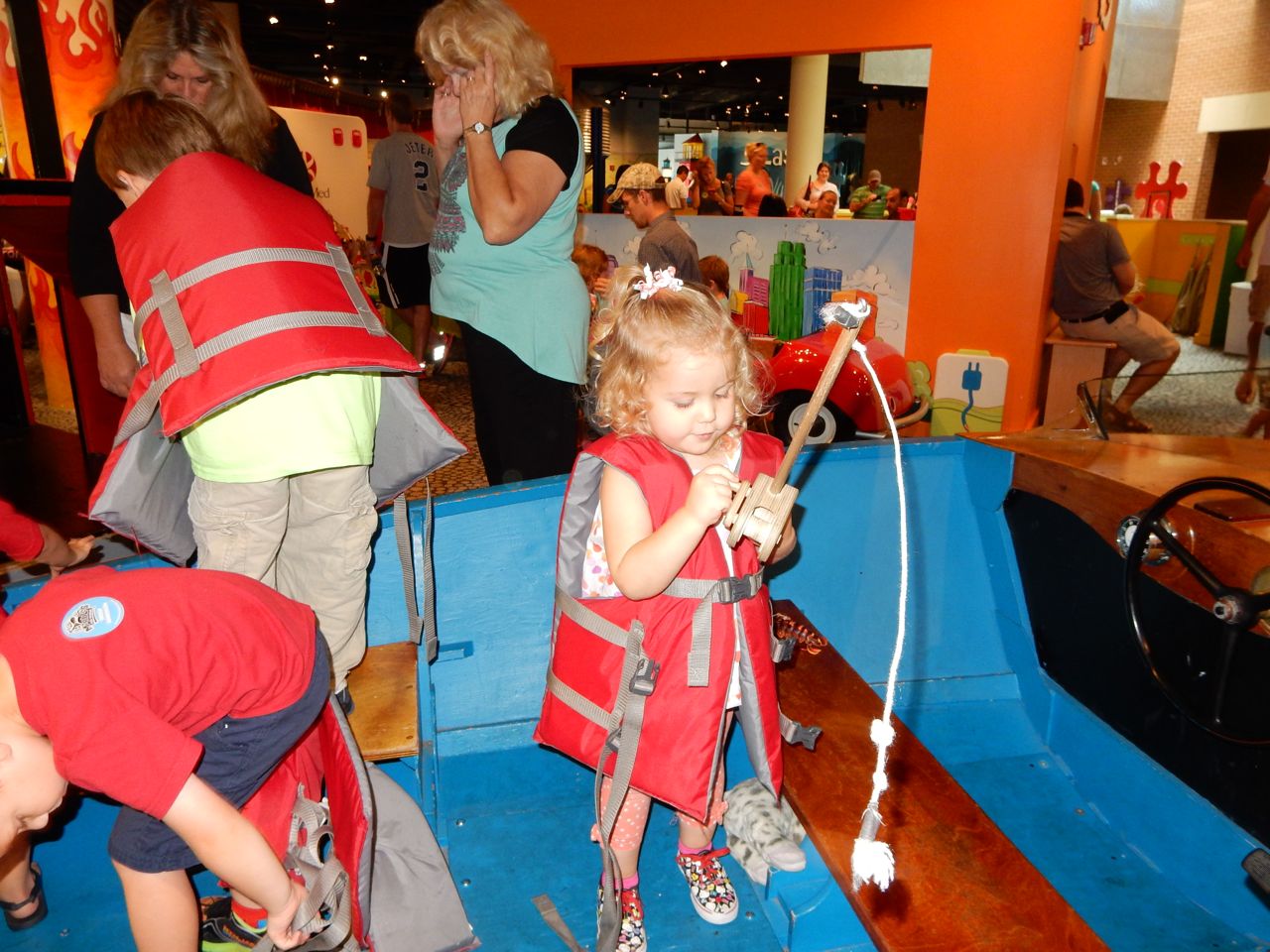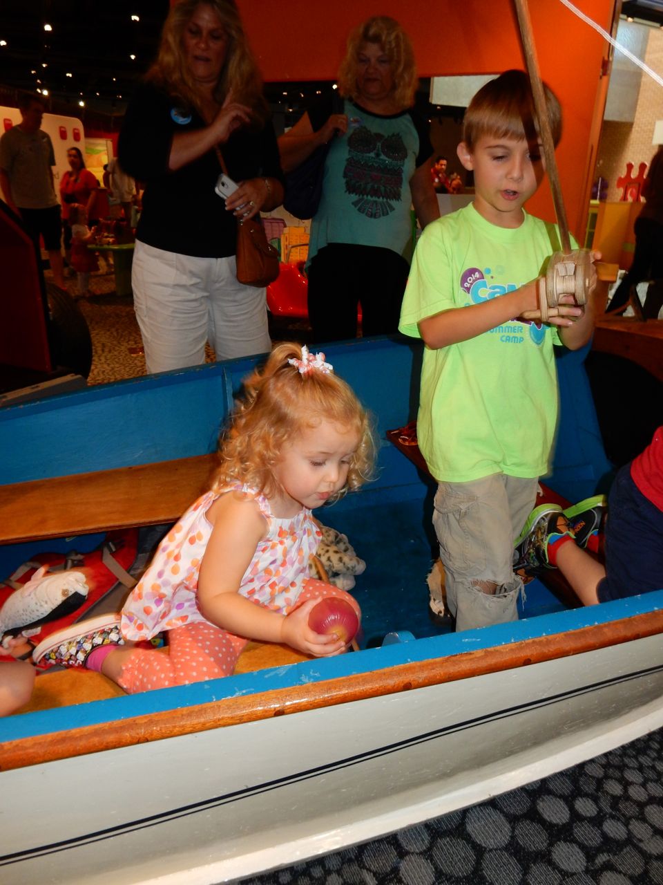 This morning, the kids were being so silly, dancing and playing with their playsilks and the chaise lounge pillow. When Brian was wearing that pillow+scarf on his head, he (inexplicably and repeatedly) called it his “Taco Hat”. (edit: Kendall evidently remembers that, since she put the pillow on her head and called it “Taco Hat” today–January 2, 2015!! The girl remembers ev-ar-y-thing.) We decided to take the kids to Marbles today since it was Goddard School Day, and as usual, it was a hoot and a half. The kids played with all their usual favorites: the pirate ship, the fishing boat, the ambulance, the farm animals, the giant blocks, the kitchen/restaurant and grocery store, and the under the sea room. The “News Around Town” was a new feature, and we tried to get Kendall to notice Brian and Daddy on the screen–they were standing over by the ambulance! The kids played with the giant foam blocks for the longest time before we even went in–they were making each other very fancy royal thrones! The outdoor water play area was another highlight today, perfect on a hot August afternoon. We had lunch at Pogo afterward which is always delicious (hands-down, they have the best damn fried okra in NC.) Both kids ate a good lunch, and were able to realize their dream of getting the Hershey’s shakes, that you buy out of a freezer case and have spun up by the special machine–it’s all very exciting. 😉 I picked up a few things at Target later this afternoon, and surprised the kids at bathtime with a super-fun-looking How to Train Your Dragon bathtub Berk Island playset! It has a lot of cool features, including a miniature viking ship, water wheel, slide, a place to stow your dragon (or maybe it’s a house for your rider?), and of course a Hiccup figure and a Toothless that squirts water (instead of plasma blasts!) They were just over the moon about that toy! 😀