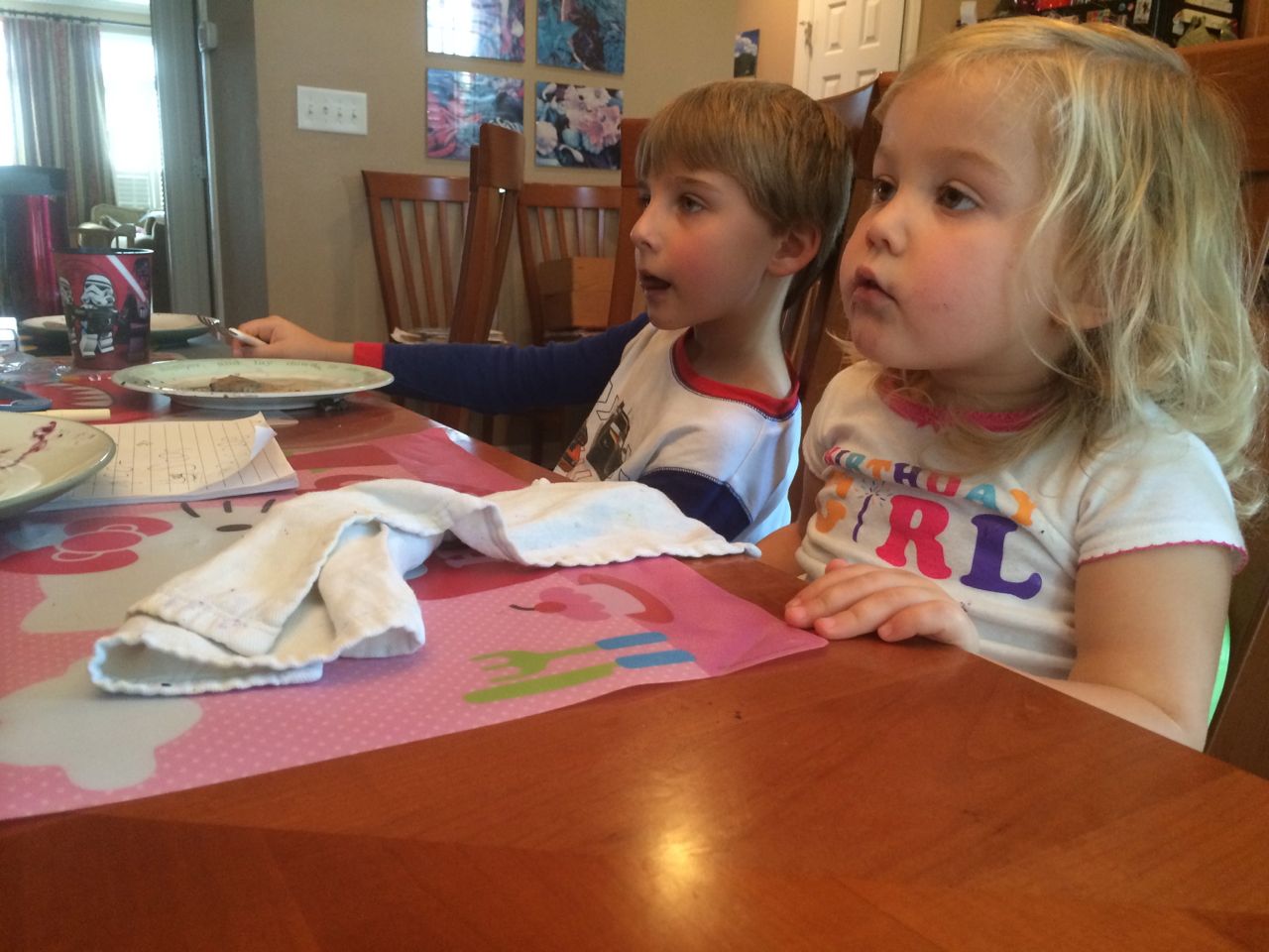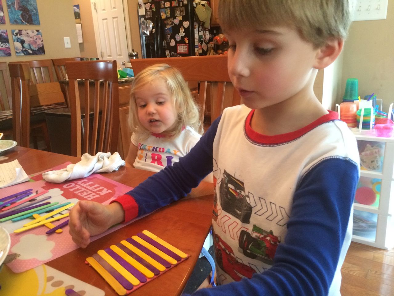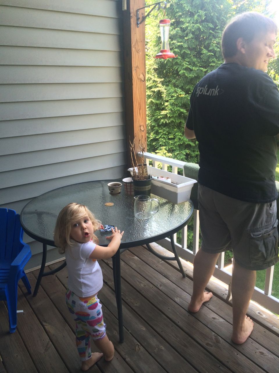 Today we had grand plans to visit Steve and Sue around midday, but the kids were, let’s just say, unsuitable for public consumption in the afternoon. Naps were an absolute must. Not sure what was up with them, it was a pretty calm morning as things go, just breakfast, some crafts, feeding the hummingbirds, finishing up the Jedi Starfighter models.. Brandon was hard at work on glass shard abatement in the van until around 5pm. But, we did make it out to have a nice pizza dinner with Steve and Sue. The kids loved playing with Grandma’s toys and of course the contents of the special art supplies drawer! Video follows below, Kendall playing her “Happy Birthday / Open Your Present” game after breakfast this morning, and a still-sleepy post-nap Kendall who is excited to see Grandma Steve–ah, she means to say Grandpa Steve! (She was chanting their names and getting a bit mixed up!)