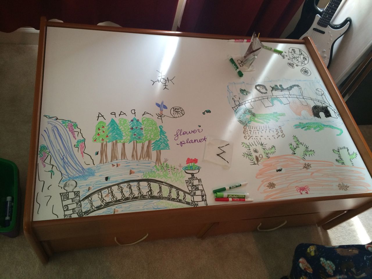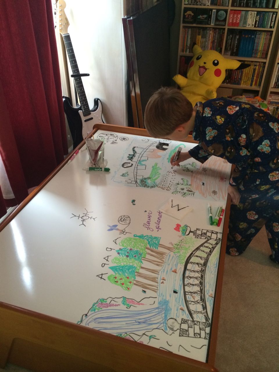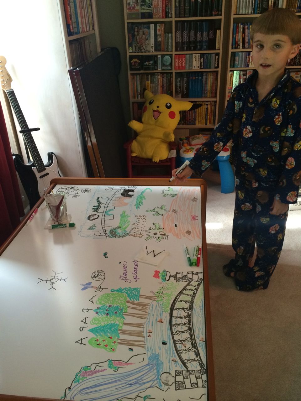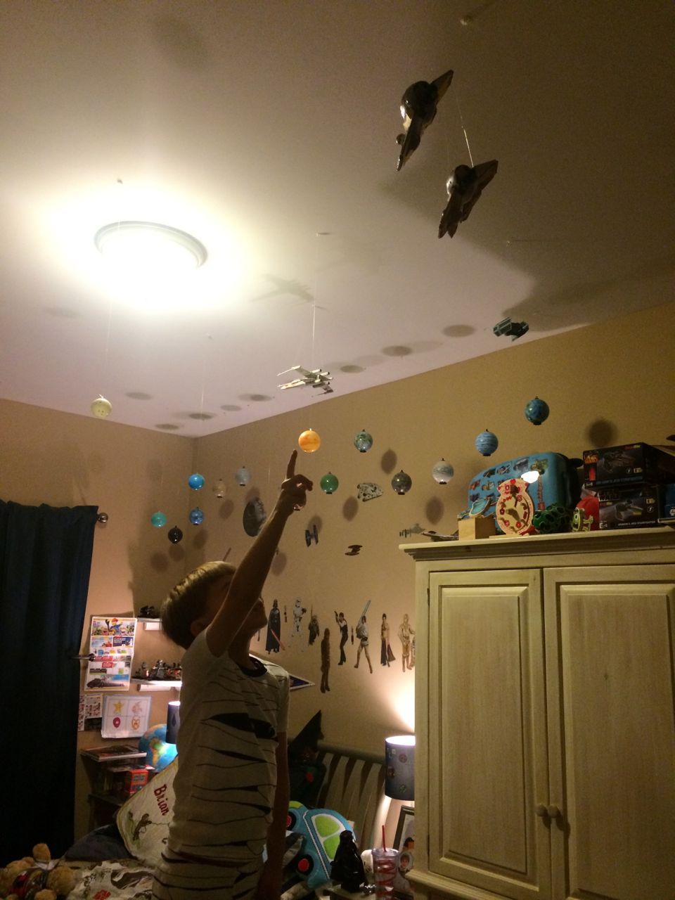 Today we hung up Brian’s new models in his room, Anakin’s and Obi-Wan’s Jedi Starfighers.  We also flipped over the Lego table and had some marker fun on the whiteboard side.  Brian came up with the idea of drawing different sorts of “worlds” on it, and we had a great time filling up the space with different single-biome planets (sort of like in Star Wars!)  Tonight, like many nights, the kids put on their coordinating pajamas and asked for a dance party!  We indulged them, hoping it would get some of the wiggles out, and not make them get too spun up before bed (plus it gave Brandon a chance to finish up the model-hanging)!  They sure have some moves, don’t they? 😉