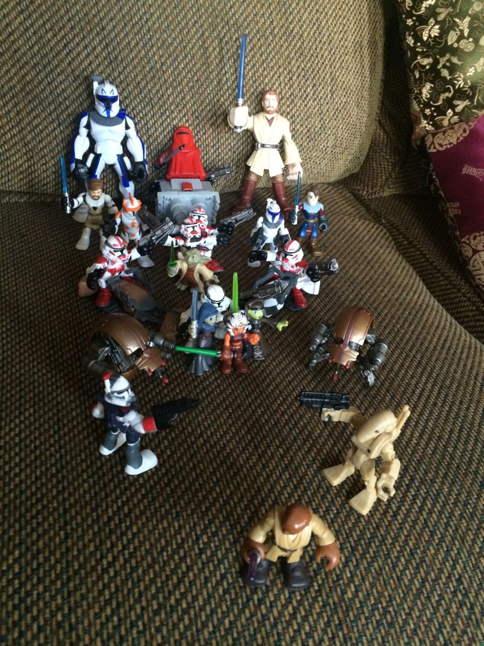 Kendall just can’t wait to be the Buttercup Fairy for Halloween, and she seems to really like the Flower Fairies. My tiny books from when I was a kid have only a limited selection, and Buttercup herself doesn’t appear in them. It seems that a few years ago, the estate of Mary Cicely Barker went on a pretty major publishing spree, and this cute boxed set of hardcover books was part of that. It’s out of print now, and I didn’t expect to find a decent used copy for a reasonable price–but, eBay to the rescue! I picked it up for about 10% of what I’d seen this set usually go for. 🙂 Kendall was pretty happy to receive it! Also included, the kids in their matching Fresh Beat Band t-shirts, on the way to school, and one of Brian’s epic battle scene setups. 🙂