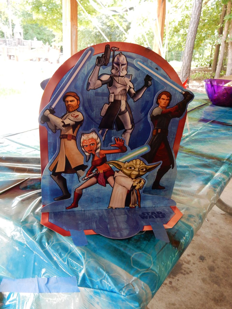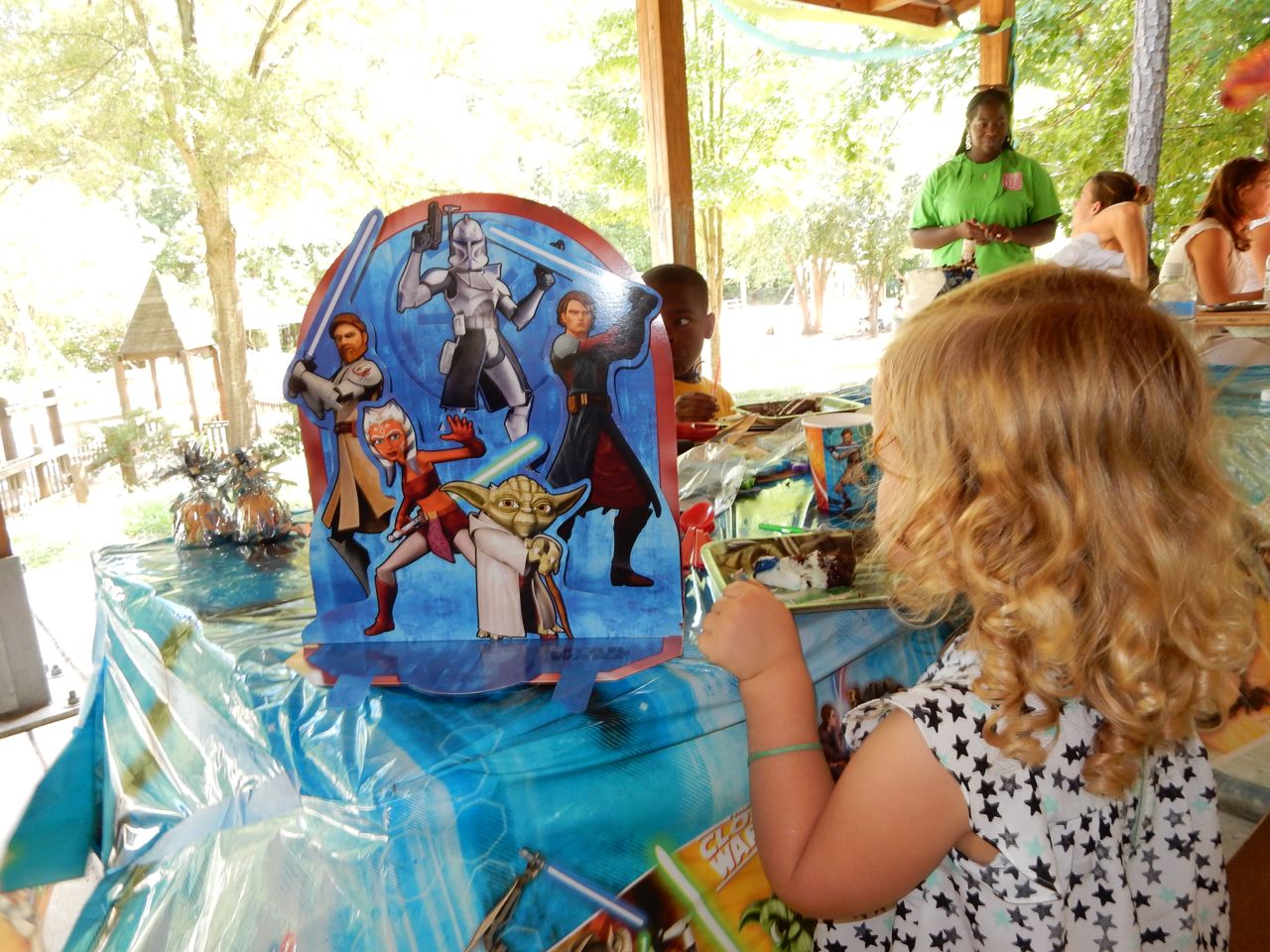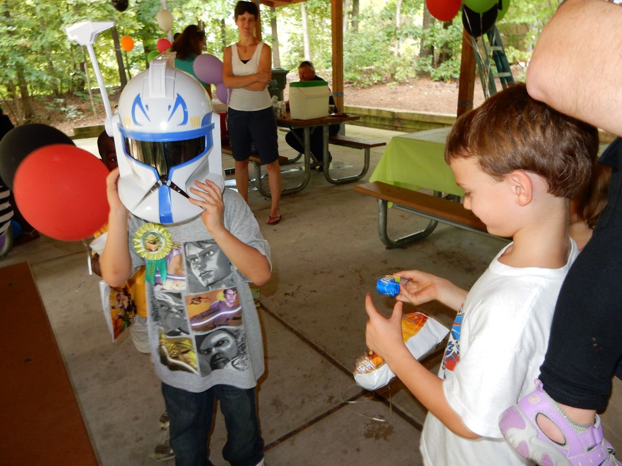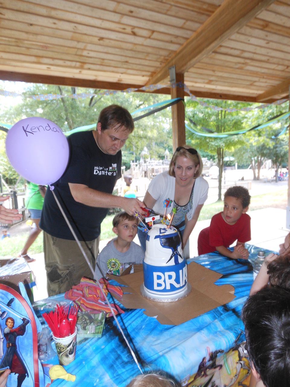 Today was Brian’s 7th birthday party, and what a bash it was! Even though his favorite Star Wars spinoff series, Star Wars: The Clone Wars was cancelled more than a year ago, through the magic of eBay, and the Internet, I was able to collect all the party supplies we needed so that he could have the Clone Wars party he dreamed of. We surprised him with a special present this morning, a talking Captain Rex helmet! Rex is Brian’s favorite character, so being able to wear his helmet, hear Rex’s catchphrases, and receive “orders” from the Jedi generals was a real treat! Commander Fluffy, Brian’s Build-a-Bear, was dressed up as Captain Rex for the occasion as well–but, we insisted he stay in the van during the party (we can’t have the Commander getting frosting on his uniform, that just wouldn’t do!) Nana Rosemary and Sytse came by early to help us get things set up, and after some playtime with the helmet, we headed off to the park to get the picnic shelter transformed into party mode. We worked hard and finished up just as the first guests started to arrive. We couldn’t have pulled it off without them! The kids had a great time playing, and we didn’t have too hard of a time convincing them to eat the party food from Chick-Fil-A (Brian’s request!) Brian’s cake was pretty fabulous and everyone was just amazed at how it turned out. Even more than how it looked, the kids and parents both just raved about how great it tasted! Chocolate cake with white mint frosting (also Brian’s request!)–so yummy! It converted even the non-cake-eaters and mint-chocolate-haters. All too soon, our time was up at the shelter, so we packed things up quickly and made our way home. Back at our house, we cooled off in the air conditioning, and Brian opened up his gifts. Nana and Sytse stayed long enough for Brian to open up his presents (his long-awaited Z-95 Headhunter Lego set, and a Carolina Hurricanes outfit for Commander Fluffy). Our friend Jennie stayed for awhile, and we played with Brian’s toys, and ate up the rest of the food and a lot of the remaining cake! The day went really well, and really the only minor disaster was Kendall losing her pink balloon at the park (but her lavender one made it all the way back home!)