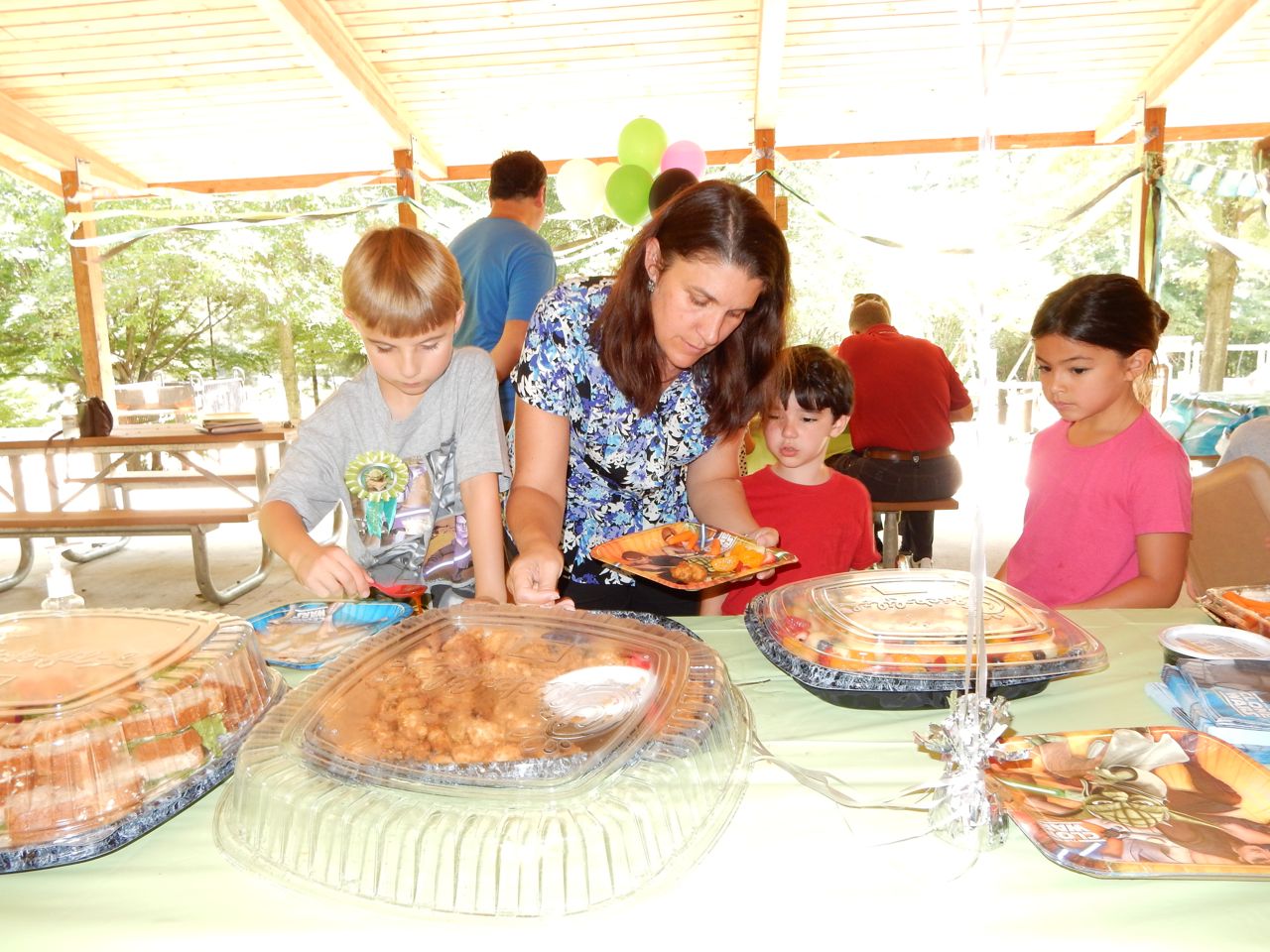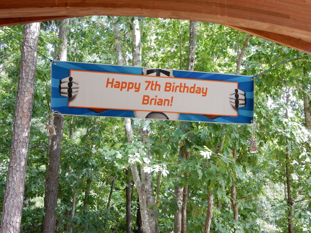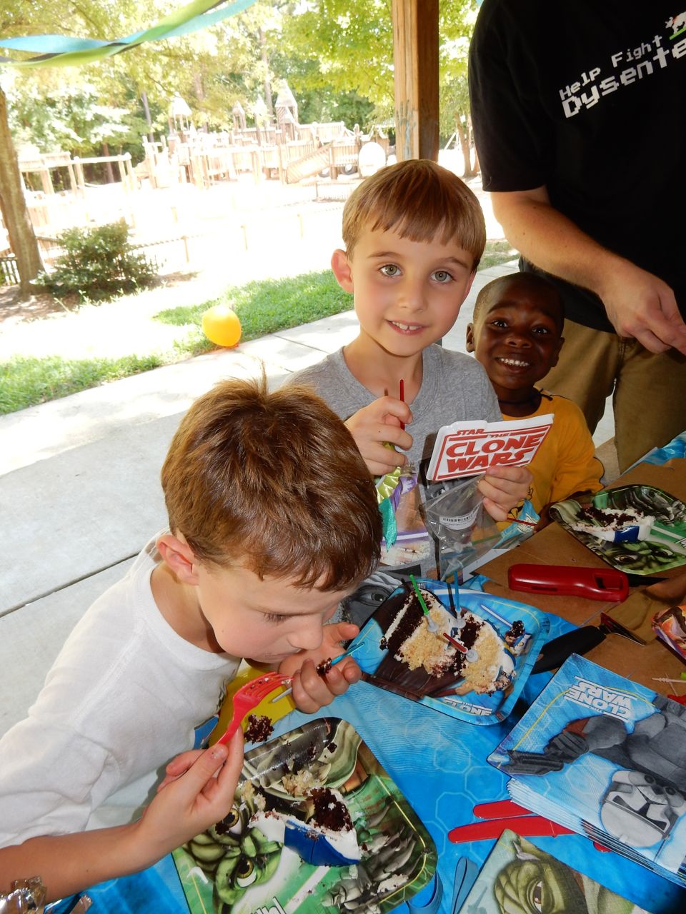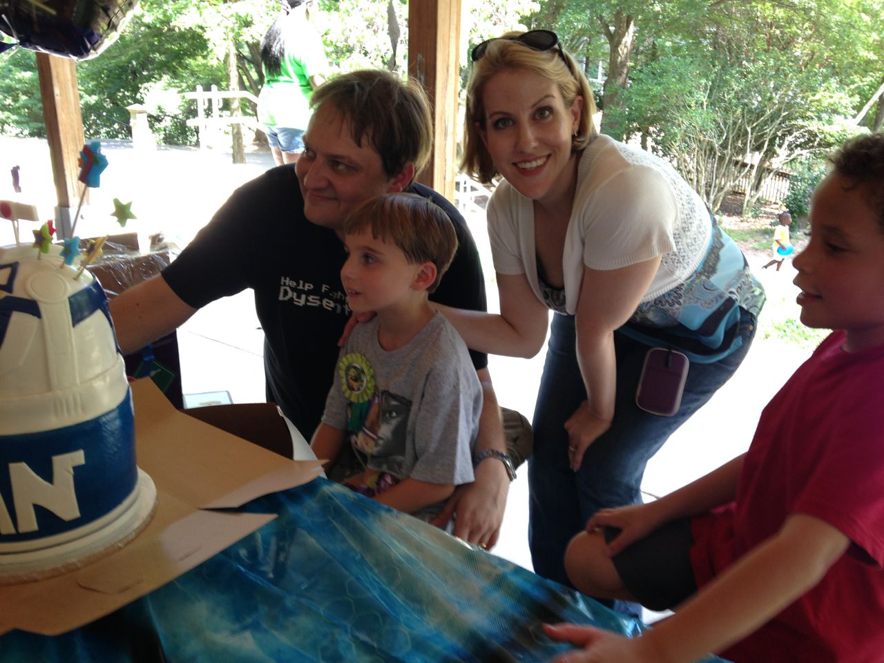 Today was Brian’s 7th birthday party, and what a bash it was! Even though his favorite Star Wars spinoff series, Star Wars: The Clone Wars was cancelled more than a year ago, through the magic of eBay, and the Internet, I was able to collect all the party supplies we needed so that he could have the Clone Wars party he dreamed of. We surprised him with a special present this morning, a talking Captain Rex helmet! Rex is Brian’s favorite character, so being able to wear his helmet, hear Rex’s catchphrases, and receive “orders” from the Jedi generals was a real treat! Commander Fluffy, Brian’s Build-a-Bear, was dressed up as Captain Rex for the occasion as well–but, we insisted he stay in the van during the party (we can’t have the Commander getting frosting on his uniform, that just wouldn’t do!) Nana Rosemary and Sytse came by early to help us get things set up, and after some playtime with the helmet, we headed off to the park to get the picnic shelter transformed into party mode. We worked hard and finished up just as the first guests started to arrive. We couldn’t have pulled it off without them! The kids had a great time playing, and we didn’t have too hard of a time convincing them to eat the party food from Chick-Fil-A (Brian’s request!) Brian’s cake was pretty fabulous and everyone was just amazed at how it turned out. Even more than how it looked, the kids and parents both just raved about how great it tasted! Chocolate cake with white mint frosting (also Brian’s request!)–so yummy! It converted even the non-cake-eaters and mint-chocolate-haters. All too soon, our time was up at the shelter, so we packed things up quickly and made our way home. Back at our house, we cooled off in the air conditioning, and Brian opened up his gifts. Nana and Sytse stayed long enough for Brian to open up his presents (his long-awaited Z-95 Headhunter Lego set, and a Carolina Hurricanes outfit for Commander Fluffy). Our friend Jennie stayed for awhile, and we played with Brian’s toys, and ate up the rest of the food and a lot of the remaining cake! The day went really well, and really the only minor disaster was Kendall losing her pink balloon at the park (but her lavender one made it all the way back home!)