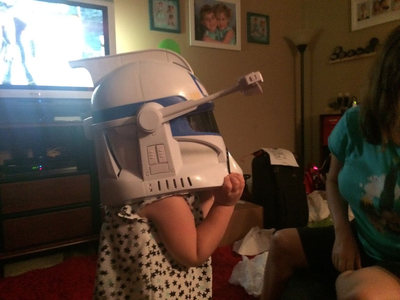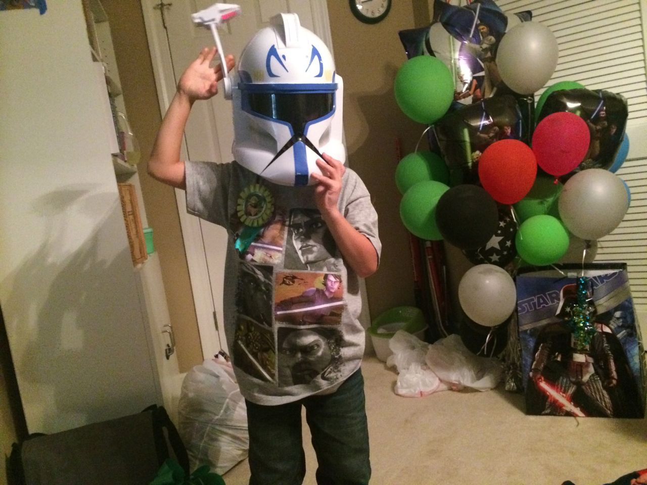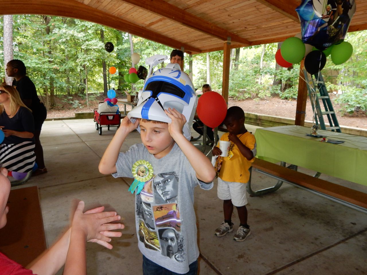 Some thoughts after I got to attend Brian’s birthday party: Amazing Captain Rex cake, sad seeing the pink balloon floating away, nice photo of Sue and Grandfather Naylor, park setting so much nicer for kids to run around, liked Grandma Rosemary reading their birthday card to Brian. Grandma Cheryl has extreme claustrophobia so I could not put Captain Rex helmet on but it seems great for play acting Star Wars.