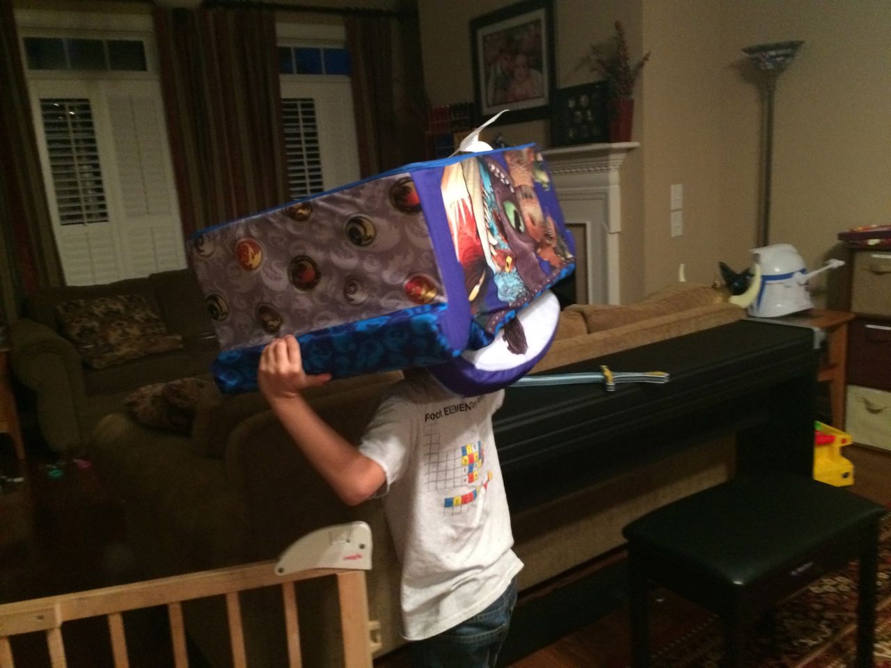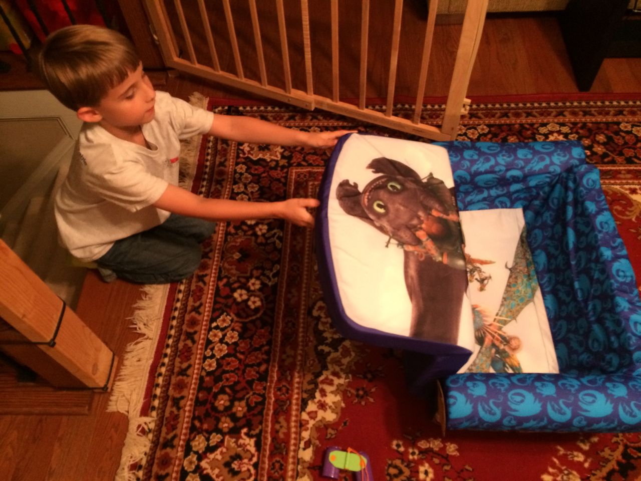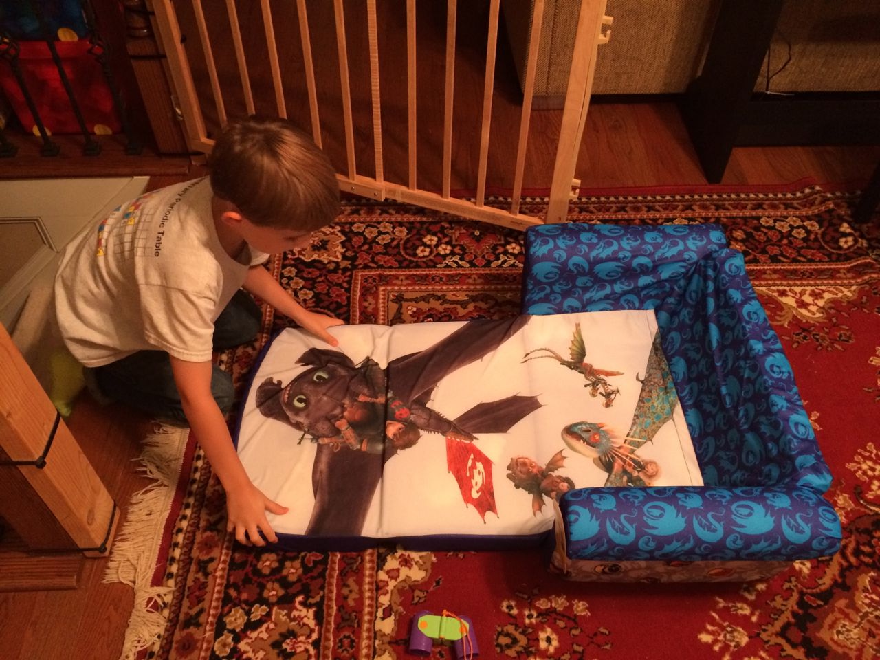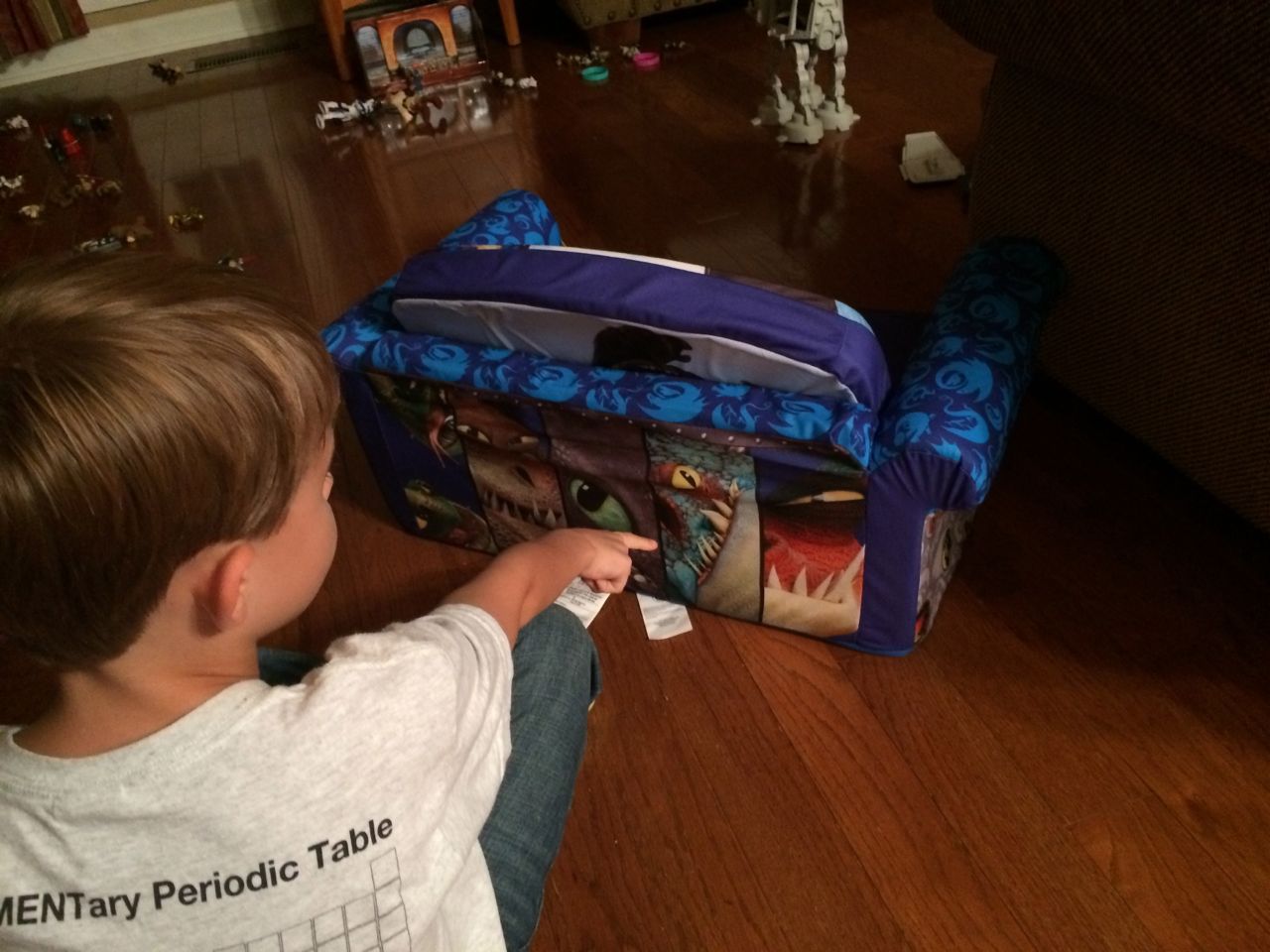 The kids were so excited by the garbage truck this morning! Brian always loved watching it when he was a tiny little guy, and now both of them run to the windows when the truck comes. Tonight, I went to the Open House at Root, attended the PTA meeting, talked with Brian’s teacher, saw some of Brian’s work, met some of the other moms, and signed up for some volunteer activities. I liked his picture he made about his feet! I had a surprise for him when I got home–a Dragon-themed fold-out kid size couch! He loved all the detail, and multiple different designs all over. It looked like something he’d really love, and what sealed the deal for me was when he set up his special place with the couch cushions. Not that I minded him using the cushions, but I thought he would really like a portable, fun, piece of furniture just for him. Well, him and Kendall. Of course they’re going to have to share, like it or not! 😉