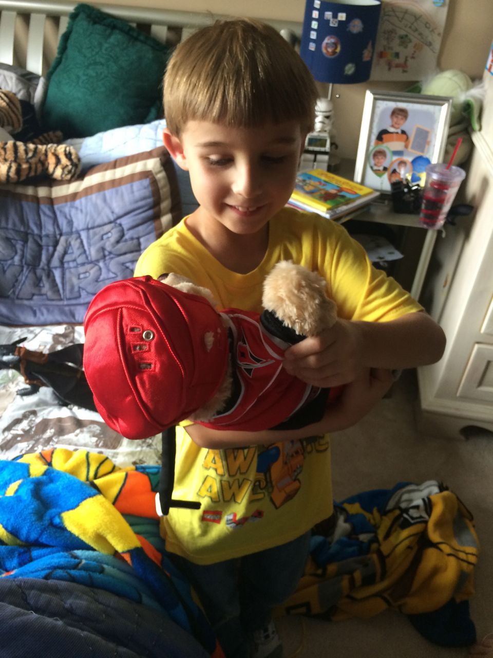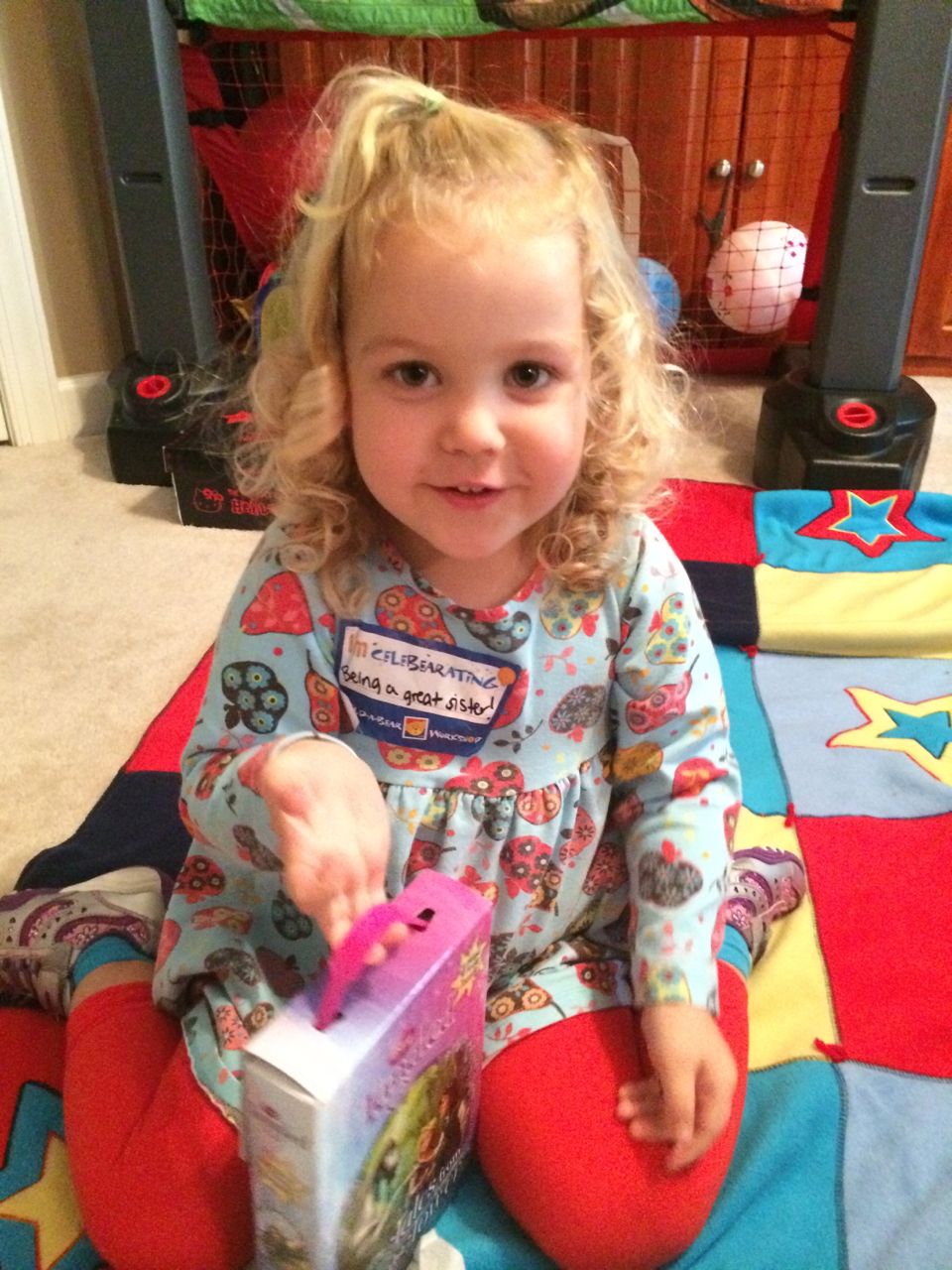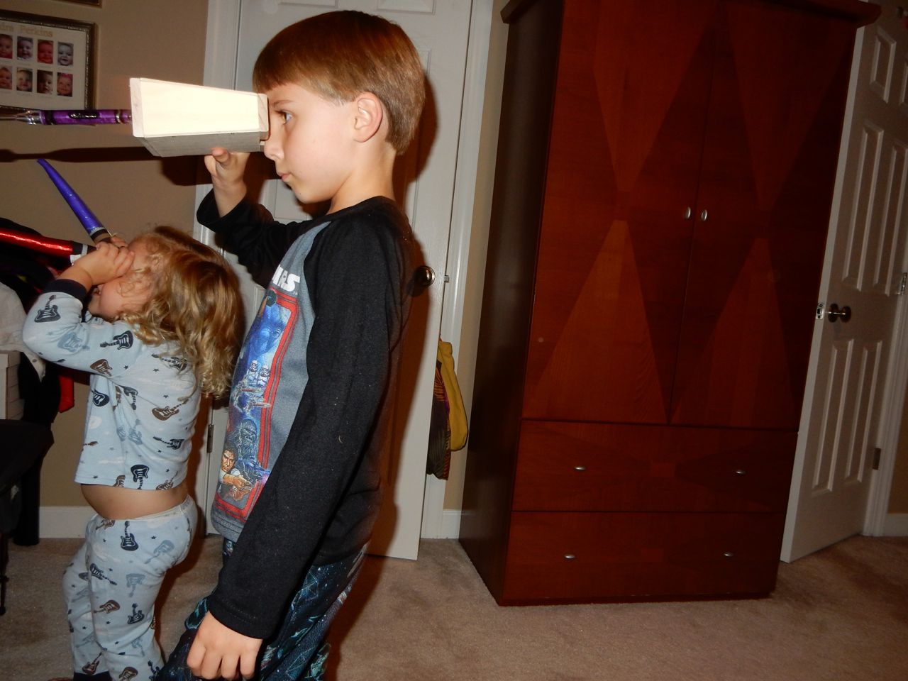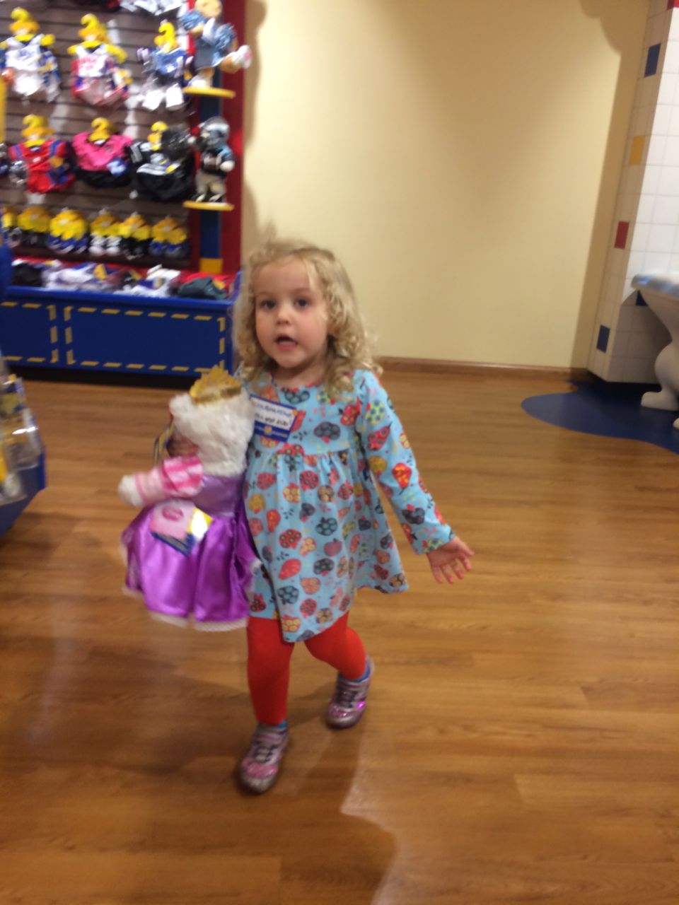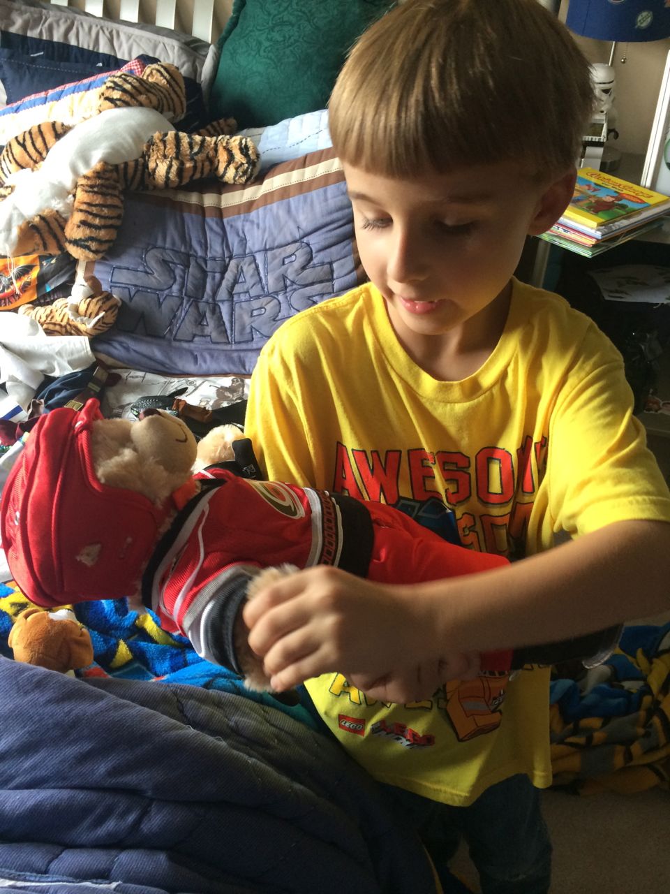 This morning, Brian was playing with Commander Fluffy, and dressed him up in the Carolina Hurricanes hockey outfit that Nana gave him as a birthday present! Funny, because we planned on going back to Build-A-Bear today! After Brian’s trip to Lowes for another Build-and-Grow session, that is. Today he built a cool pair of binoculars! They actually kind of work, too. 😉 I played with Kendall until the boys returned, then we were off to Build-a-Bear! Brian got to stuff his Toothless, and Kendall got to make her own bear, and dress it up like Rapunzel! Toothless got a cool roar sound, and Rapunzel bear got the song “Let It Go” from Frozen. Kendall also got a box of Tangled board books today–that was one of the “little sister” presents I’d gotten her, in case she got really jealous about Brian’s birthday presents (it wasn’t an issue, so she got the books today, just for fun!) She really loves them, and they’re short enough to read all four, and convenient for lots of situations, so I’m glad I picked those up for her. She loves books in a box! Brian’s old Thomas and Curious George sets are favorites of hers, too. The kids topped off an already busy day with a dance party in our room! They begged to hear the “Move It Move It” song and the “Way-Oh” song, which they know from hockey games. They brought all sorts of light-up toys (even their blinking toothbrushes!) to add to the fun. 😉