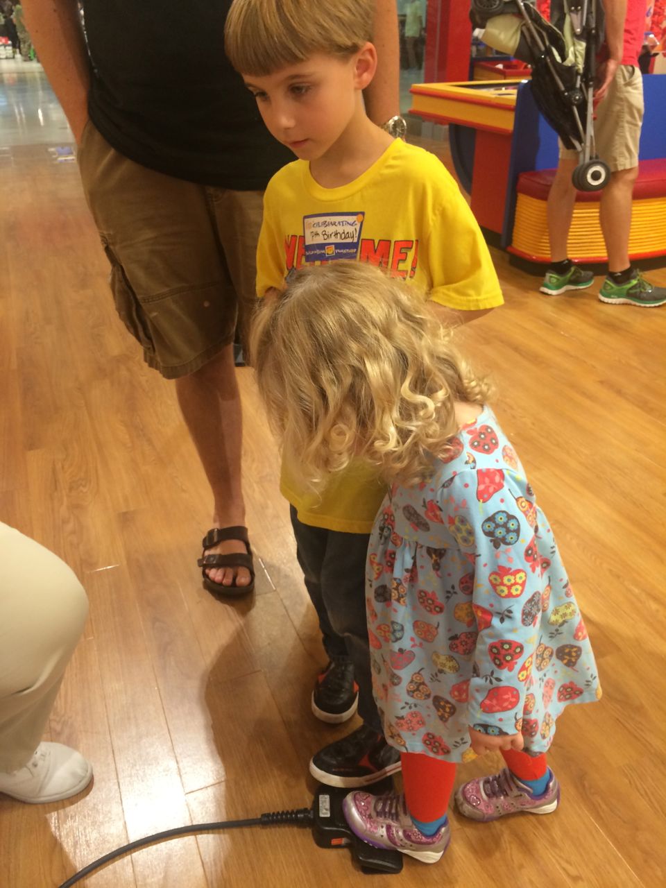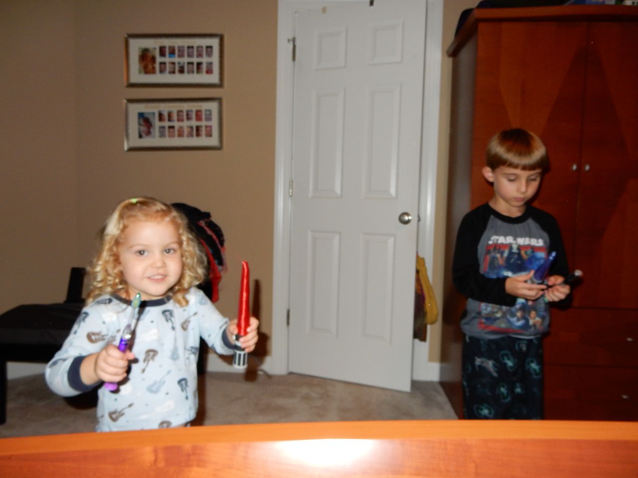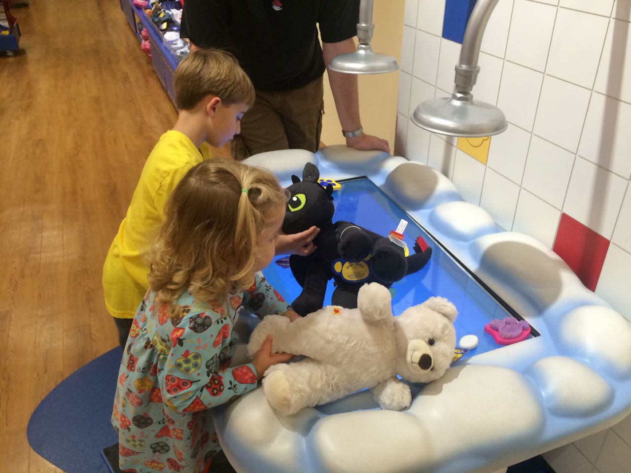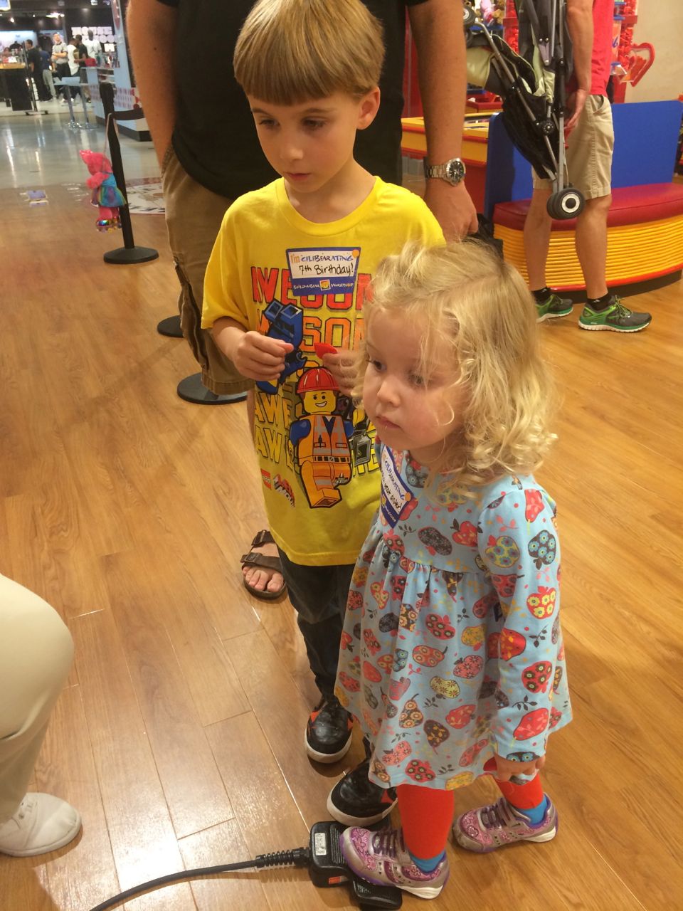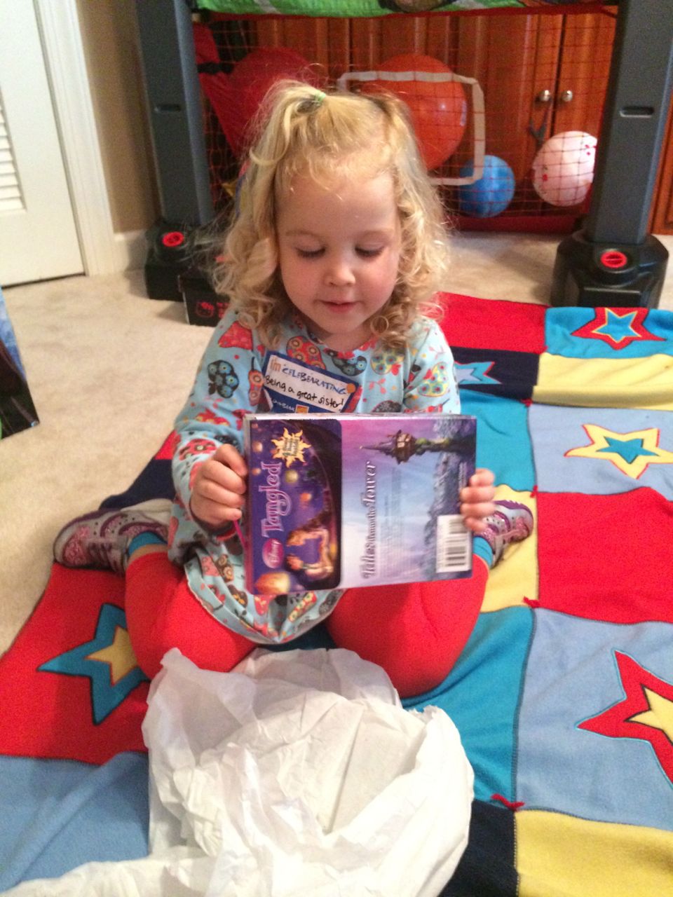 This morning, Brian was playing with Commander Fluffy, and dressed him up in the Carolina Hurricanes hockey outfit that Nana gave him as a birthday present! Funny, because we planned on going back to Build-A-Bear today! After Brian’s trip to Lowes for another Build-and-Grow session, that is. Today he built a cool pair of binoculars! They actually kind of work, too. 😉 I played with Kendall until the boys returned, then we were off to Build-a-Bear! Brian got to stuff his Toothless, and Kendall got to make her own bear, and dress it up like Rapunzel! Toothless got a cool roar sound, and Rapunzel bear got the song “Let It Go” from Frozen. Kendall also got a box of Tangled board books today–that was one of the “little sister” presents I’d gotten her, in case she got really jealous about Brian’s birthday presents (it wasn’t an issue, so she got the books today, just for fun!) She really loves them, and they’re short enough to read all four, and convenient for lots of situations, so I’m glad I picked those up for her. She loves books in a box! Brian’s old Thomas and Curious George sets are favorites of hers, too. The kids topped off an already busy day with a dance party in our room! They begged to hear the “Move It Move It” song and the “Way-Oh” song, which they know from hockey games. They brought all sorts of light-up toys (even their blinking toothbrushes!) to add to the fun. 😉