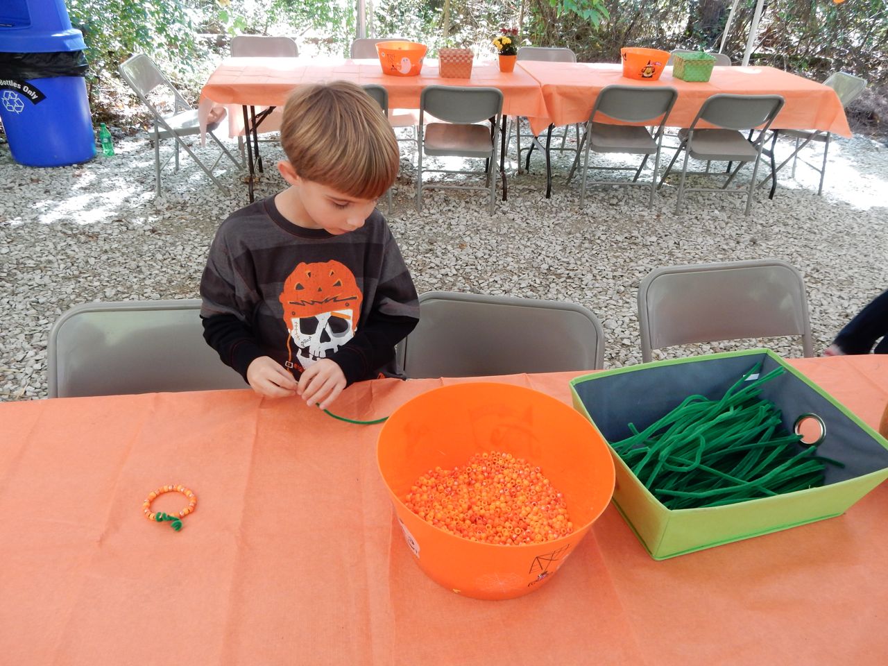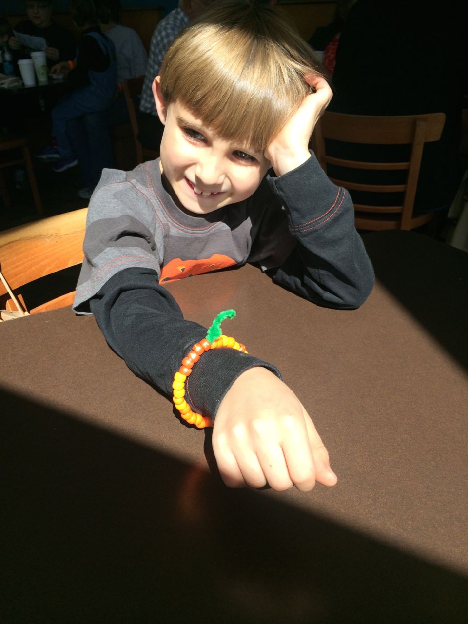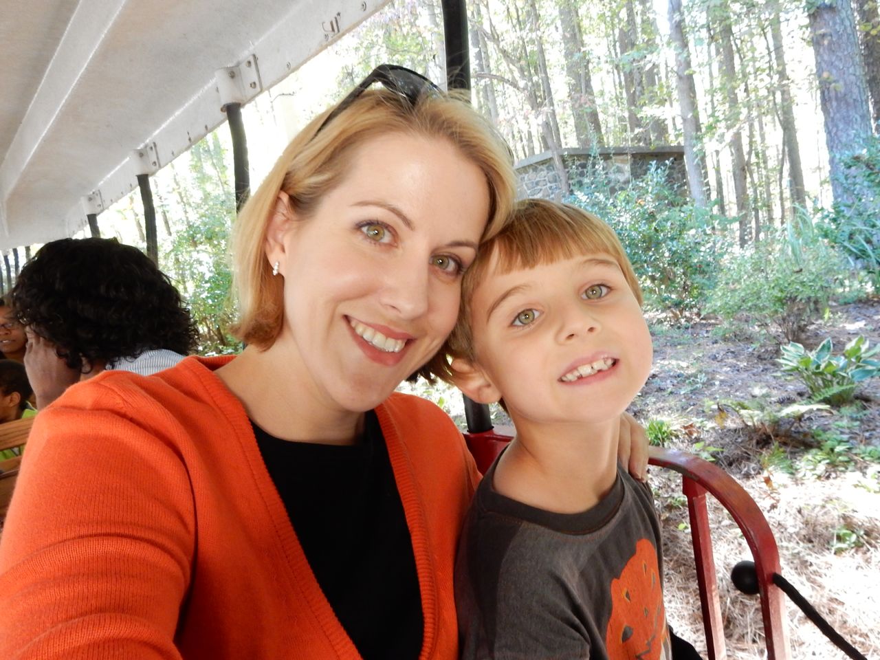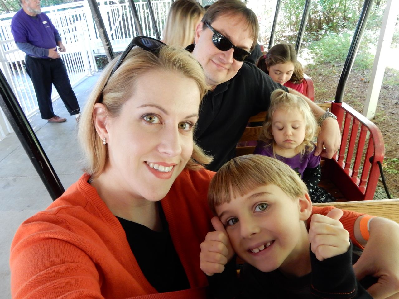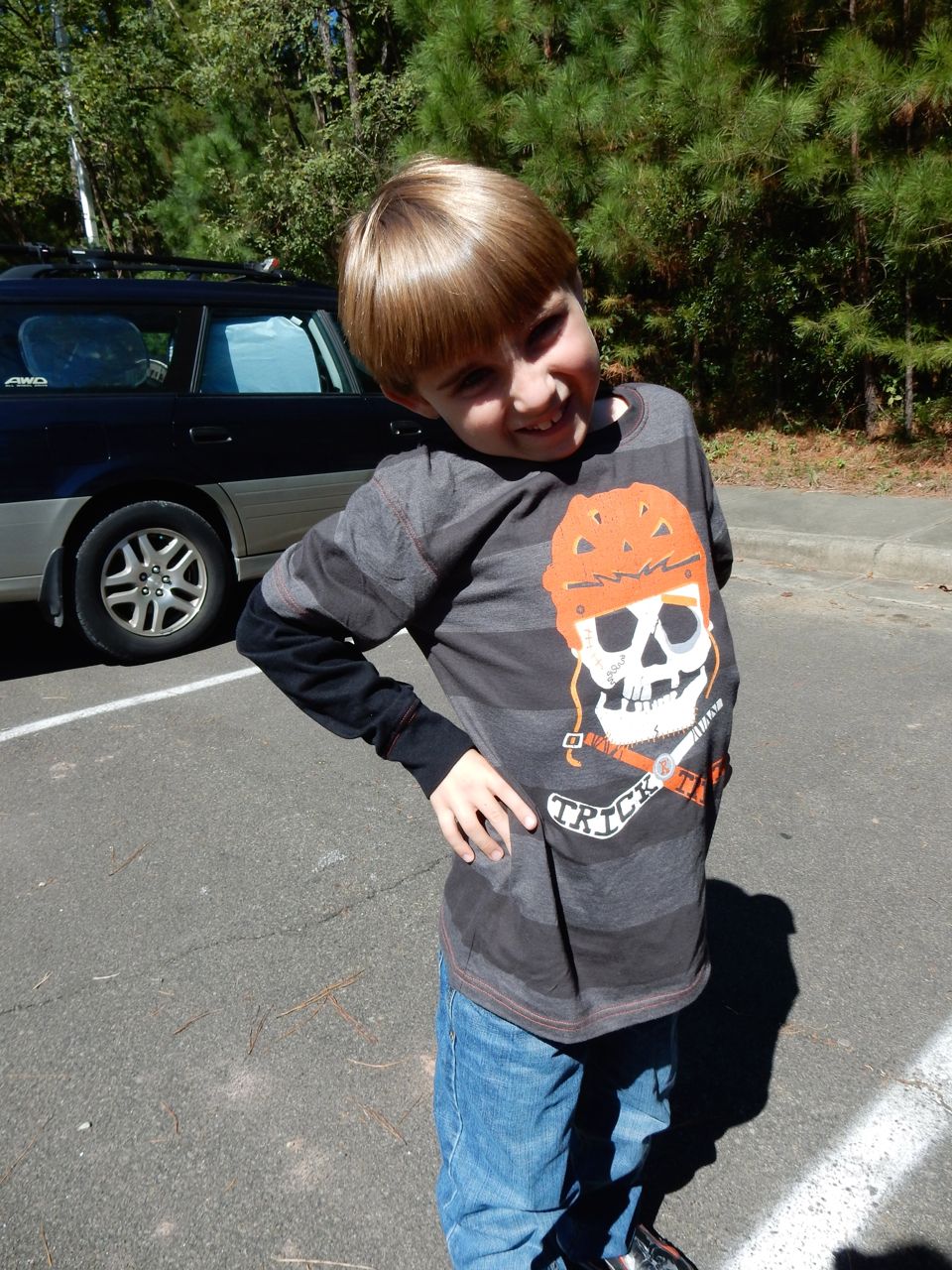 Today was a busy day! We started off with some yummy Star Wars pancakes, and then headed off to the Museum of Life+Science in Durham for the Pumpkin Patch Express! For this event, the museum staff sets up lots of fun games and activities in the woods, at the far end of the train loop. The kids enjoyed choosing pumpkins, decorating with Halloween-themed foam stickers, making pumpkin decorations with pony beads and pipe cleaners, and all the games! Brian loved the pumpkin slingshot the most, and Kendall loved the witch-hat ring toss (but she liked collecting all of the rings for herself!) They enjoyed playing at the museum playground as well. I’m heading out to Las Vegas for a conference tomorrow, so I got my nails done (Red Hat red, of course!) Brian made me a heartwrenching “I Will Miss You Card” and some other items to take along on my trip. Brandon had a surprise for the kids–he’d put up the LED ribbon lights in their “clubhouse” (the alcove under the stairs in the garage). They loved the remote control that lets them change the lights to any color of the rainbow! I had a surprise for each of them as well–a customized Hello Kitty Halloween book for Kendall, and a cool Book of Dragons book for Brian!