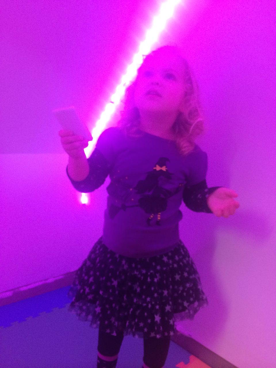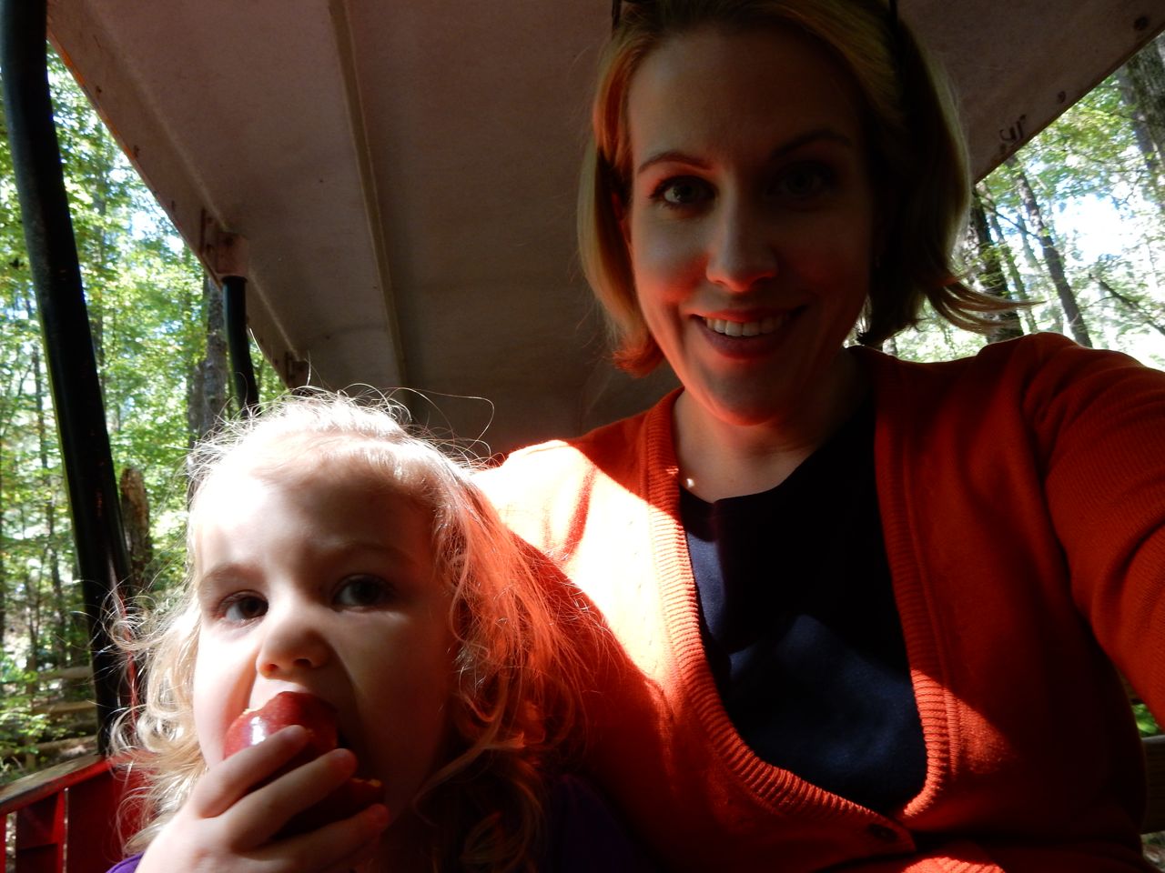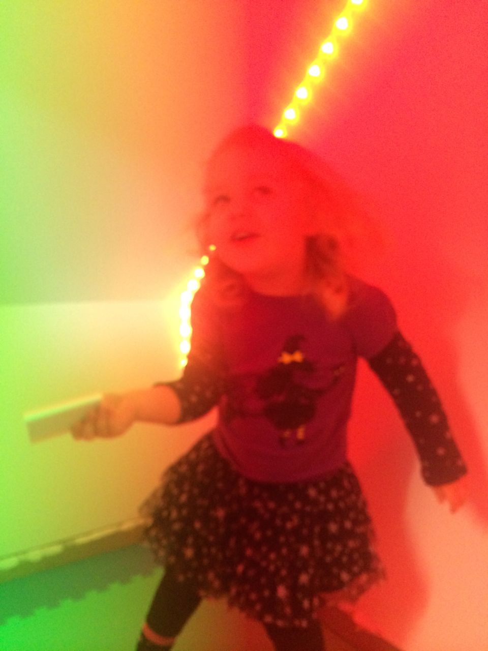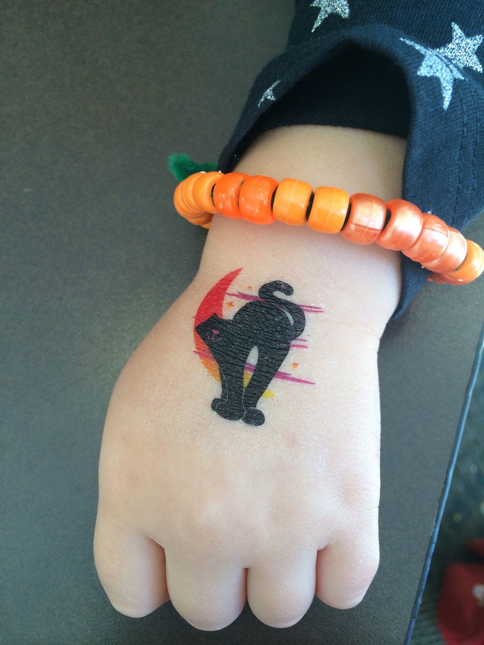 Today was a busy day! We started off with some yummy Star Wars pancakes, and then headed off to the Museum of Life+Science in Durham for the Pumpkin Patch Express! For this event, the museum staff sets up lots of fun games and activities in the woods, at the far end of the train loop. The kids enjoyed choosing pumpkins, decorating with Halloween-themed foam stickers, making pumpkin decorations with pony beads and pipe cleaners, and all the games! Brian loved the pumpkin slingshot the most, and Kendall loved the witch-hat ring toss (but she liked collecting all of the rings for herself!) They enjoyed playing at the museum playground as well. I’m heading out to Las Vegas for a conference tomorrow, so I got my nails done (Red Hat red, of course!) Brian made me a heartwrenching “I Will Miss You Card” and some other items to take along on my trip. Brandon had a surprise for the kids–he’d put up the LED ribbon lights in their “clubhouse” (the alcove under the stairs in the garage). They loved the remote control that lets them change the lights to any color of the rainbow! I had a surprise for each of them as well–a customized Hello Kitty Halloween book for Kendall, and a cool Book of Dragons book for Brian!