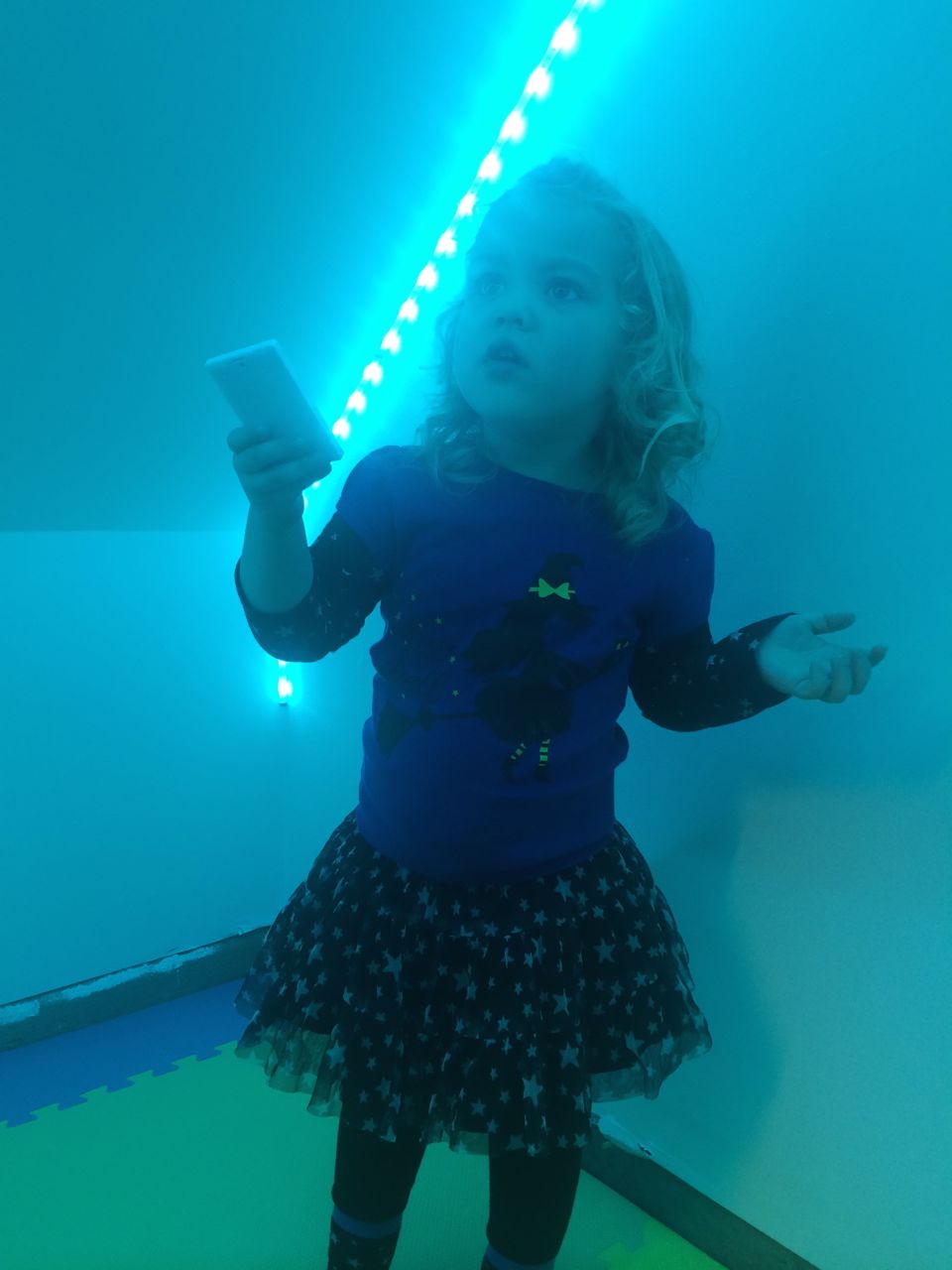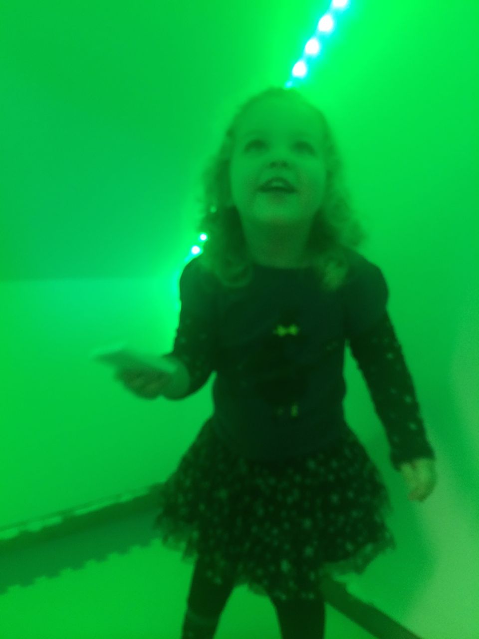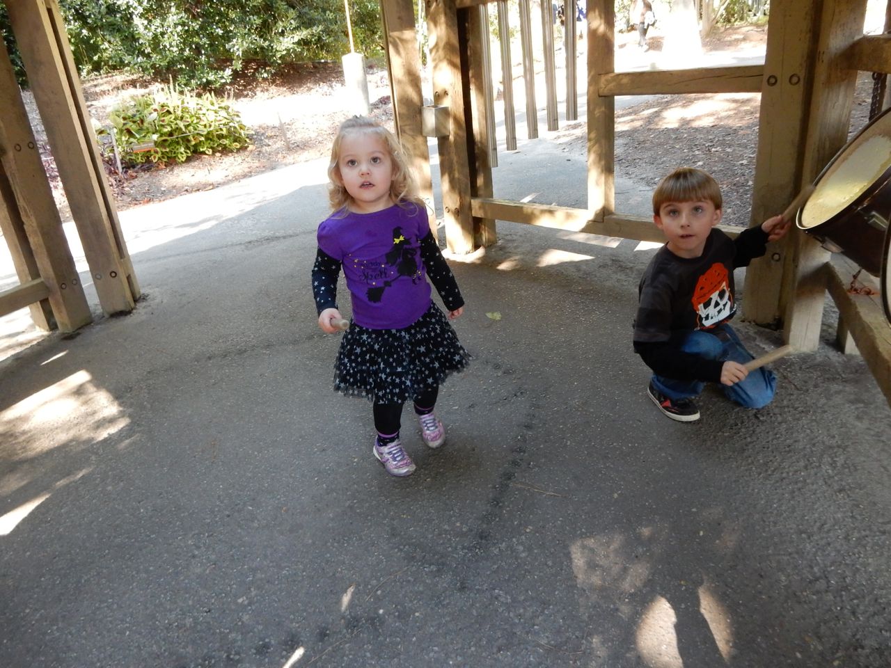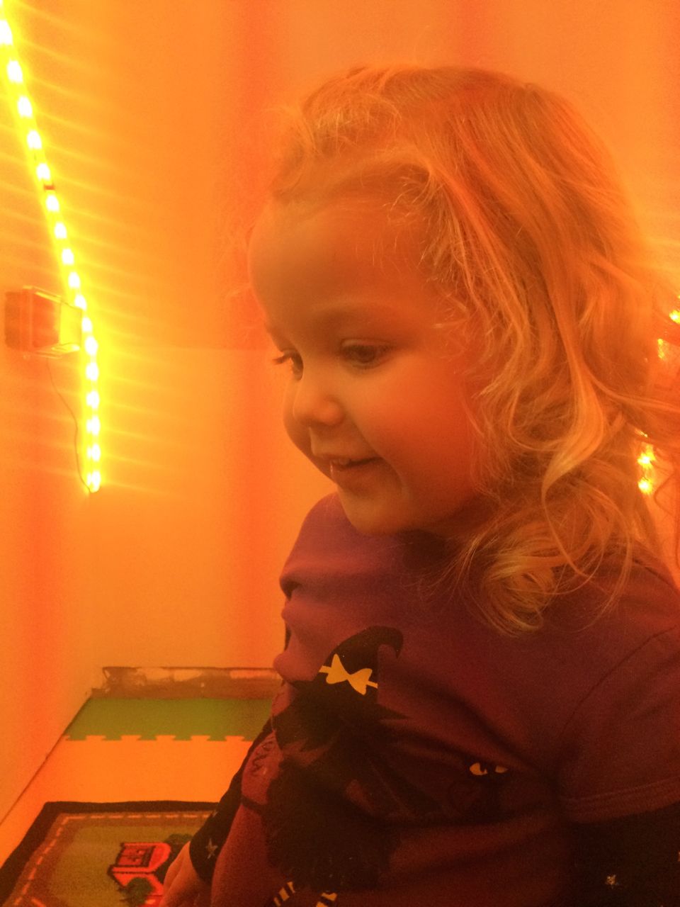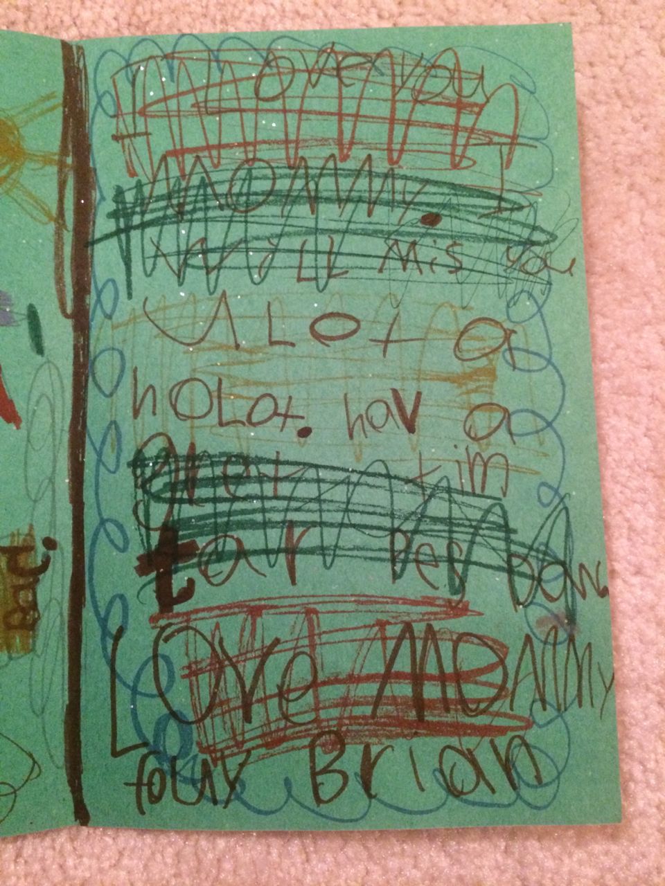 Today was a busy day! We started off with some yummy Star Wars pancakes, and then headed off to the Museum of Life+Science in Durham for the Pumpkin Patch Express! For this event, the museum staff sets up lots of fun games and activities in the woods, at the far end of the train loop. The kids enjoyed choosing pumpkins, decorating with Halloween-themed foam stickers, making pumpkin decorations with pony beads and pipe cleaners, and all the games! Brian loved the pumpkin slingshot the most, and Kendall loved the witch-hat ring toss (but she liked collecting all of the rings for herself!) They enjoyed playing at the museum playground as well. I’m heading out to Las Vegas for a conference tomorrow, so I got my nails done (Red Hat red, of course!) Brian made me a heartwrenching “I Will Miss You Card” and some other items to take along on my trip. Brandon had a surprise for the kids–he’d put up the LED ribbon lights in their “clubhouse” (the alcove under the stairs in the garage). They loved the remote control that lets them change the lights to any color of the rainbow! I had a surprise for each of them as well–a customized Hello Kitty Halloween book for Kendall, and a cool Book of Dragons book for Brian!