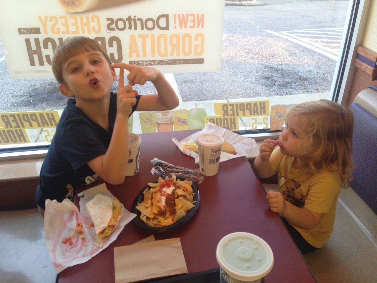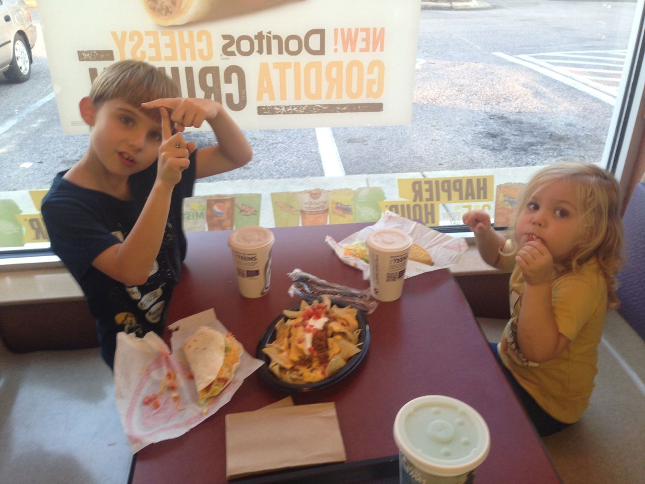 Today was my last day in Vegas, and while my tummy troubles have abated, I’m developing some sore-throat/sinusy-thing–sheesh, I’d be having a better time if my body would cooperate and just be healthy for five minutes! We went to more talks today, and finished up our trip by getting dinner at a fancy restaurant (Pearl, a Chinese place inside the MGM) and going to see a Cirque du Soleil show, Ka. Afterward, we picked up our bags and headed to the airport! Taking the red-eye home, maybe not the most fun thing in the world, but I’ll be able to see the kids in the morning! Brandon sent me a photo of Kendall at PTA this morning, holding her bananaphone, and it looks like they all went out to Taco Bell for dinner! Haha, that’s okay, they’re allowed to eat some junk food while mom’s away. 🙂
