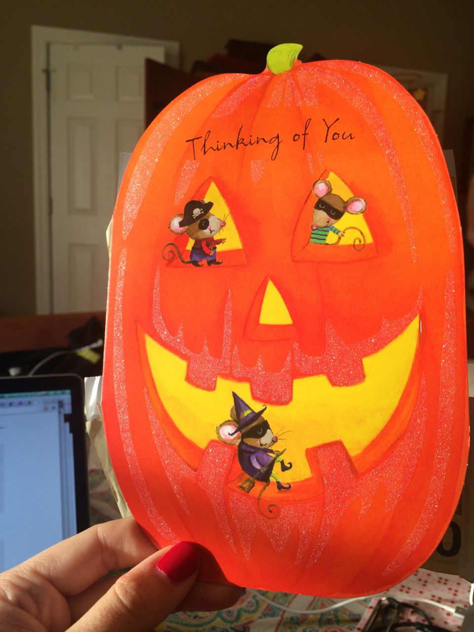 Well, okay, what I have is a bit worse than that..!  I stayed home from work today and tried to rest up.  After school, Brian surprised me with a very cute Halloween-themed card, and even attached $40 from his own money!  I’m not sure why, but he insisted!  What a sweet thing to do, anyway.  🙂  Also included, video of Miss K doing some cool bathtub dancing (?) to the Beastie Boys this morning.
