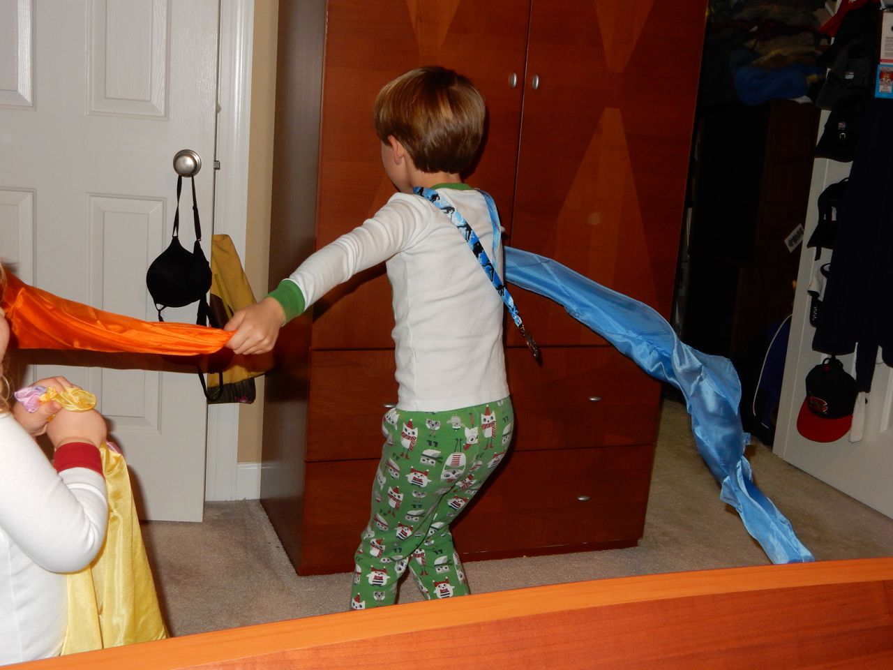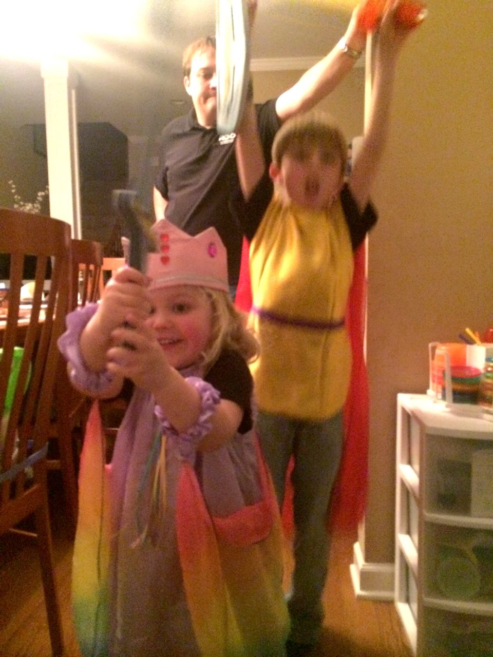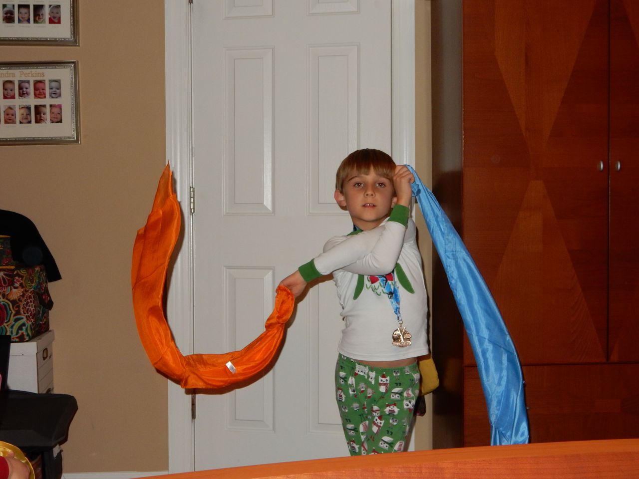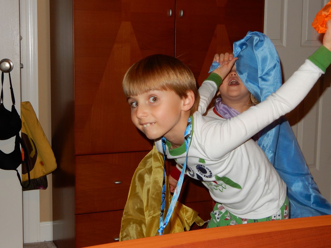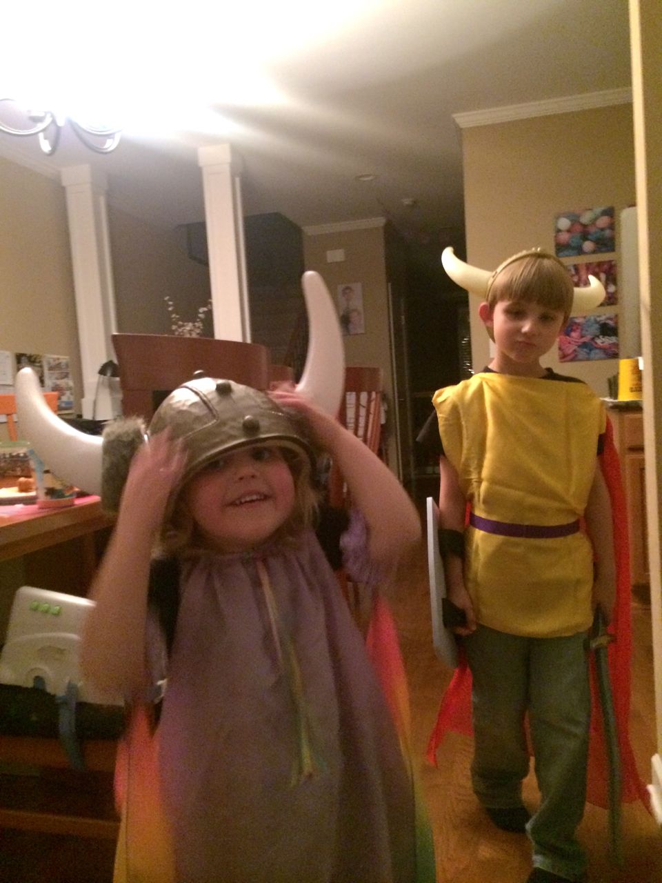 I wasn’t feeling so good today (sinus infection, must be Friday) so Brandon took Kendall along for Brian’s hockey practice. She was excited to be at the IcePlex, but probably pretty jealous to not be on the ice herself! I sent her a picture of her Twilight Sparkle pony who arrived today. 😉 The kids came home and were excited to get their new playsilks, which they combined with their viking helmets and toy swords to great effect. The kids were so spun up, they ended up having an impromptu dance party in our room (coordinating pajamas are key for a good dance party). 😉 I know, it’s early to go ahead and give them what will probably be their Christmas pajamas, but they just love having matching-but-not-the-same pajamas!