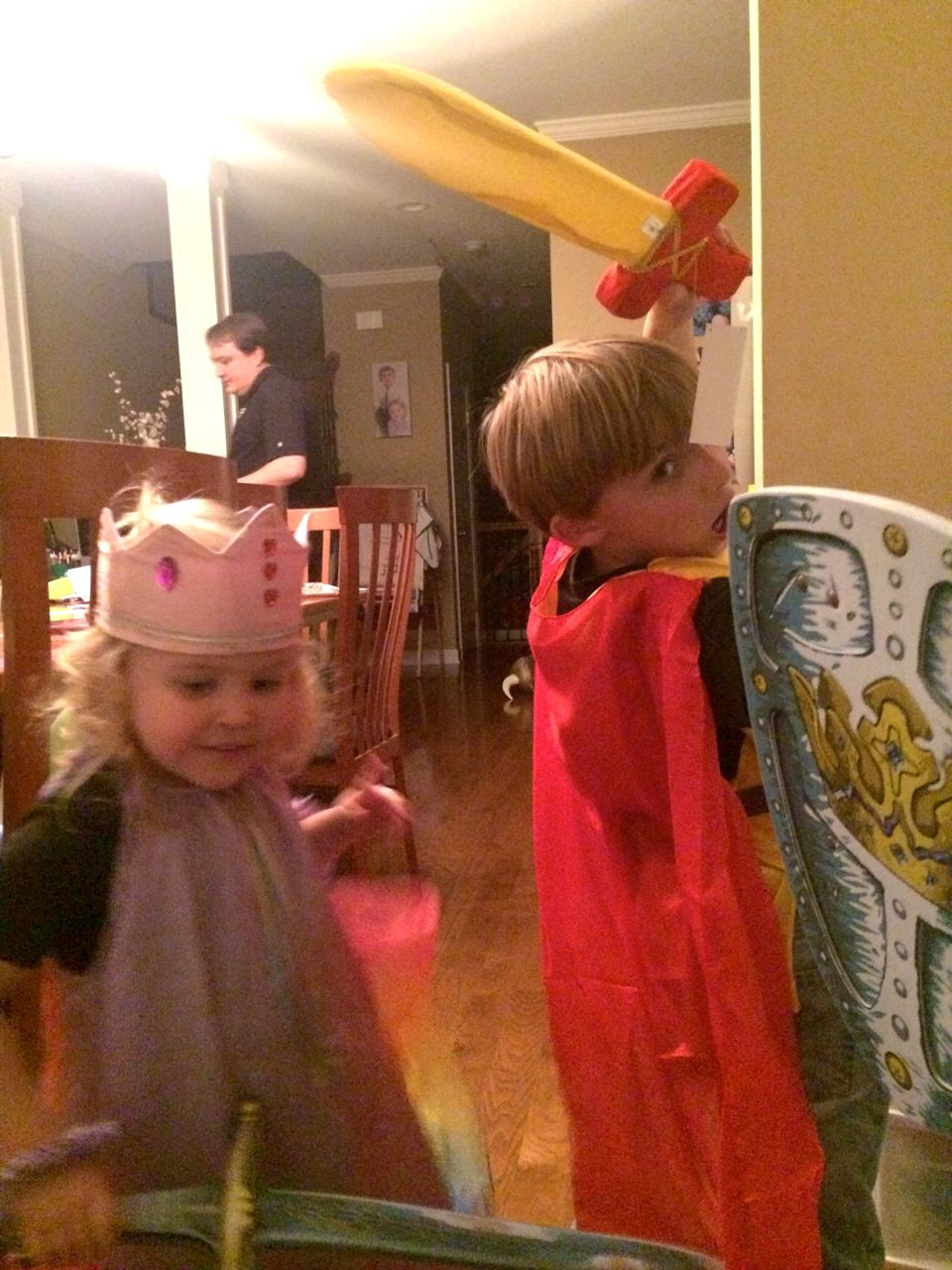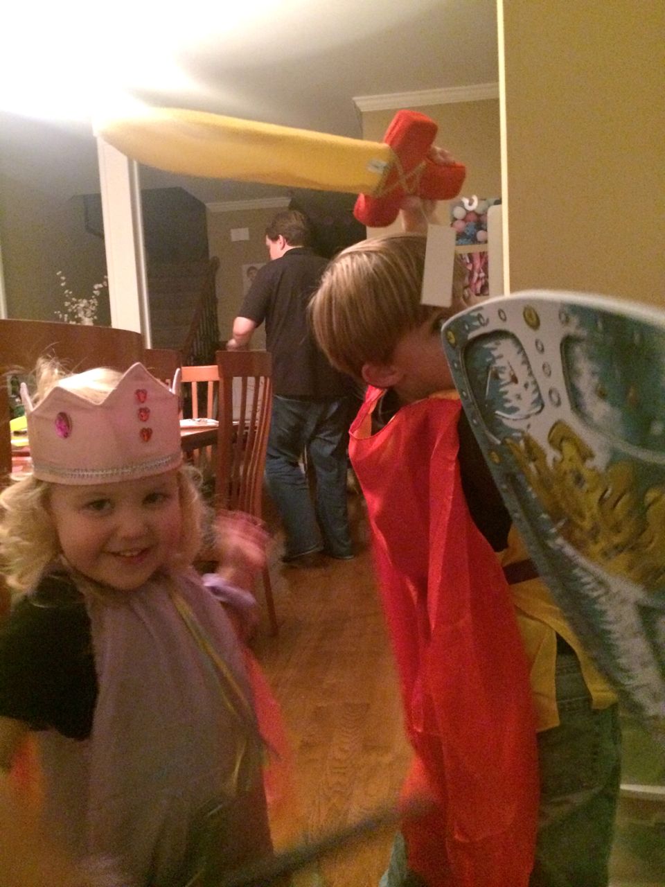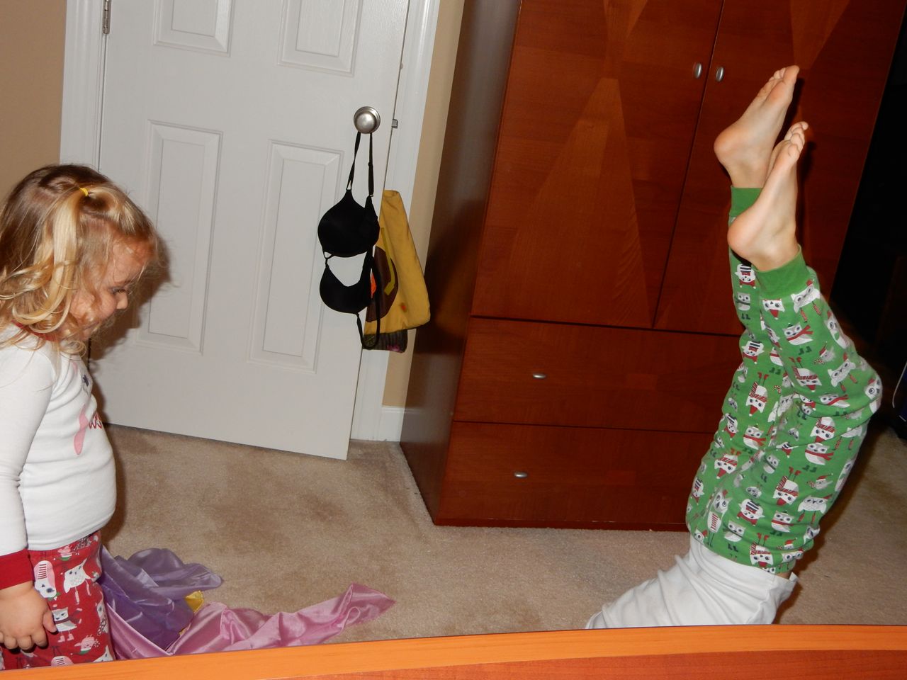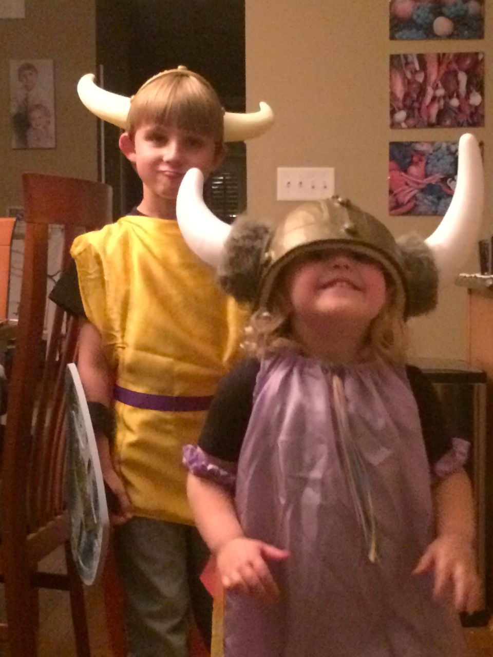 I wasn’t feeling so good today (sinus infection, must be Friday) so Brandon took Kendall along for Brian’s hockey practice. She was excited to be at the IcePlex, but probably pretty jealous to not be on the ice herself! I sent her a picture of her Twilight Sparkle pony who arrived today. 😉 The kids came home and were excited to get their new playsilks, which they combined with their viking helmets and toy swords to great effect. The kids were so spun up, they ended up having an impromptu dance party in our room (coordinating pajamas are key for a good dance party). 😉 I know, it’s early to go ahead and give them what will probably be their Christmas pajamas, but they just love having matching-but-not-the-same pajamas!