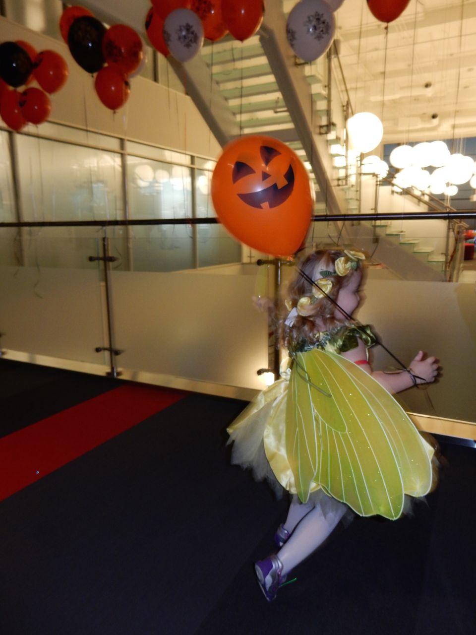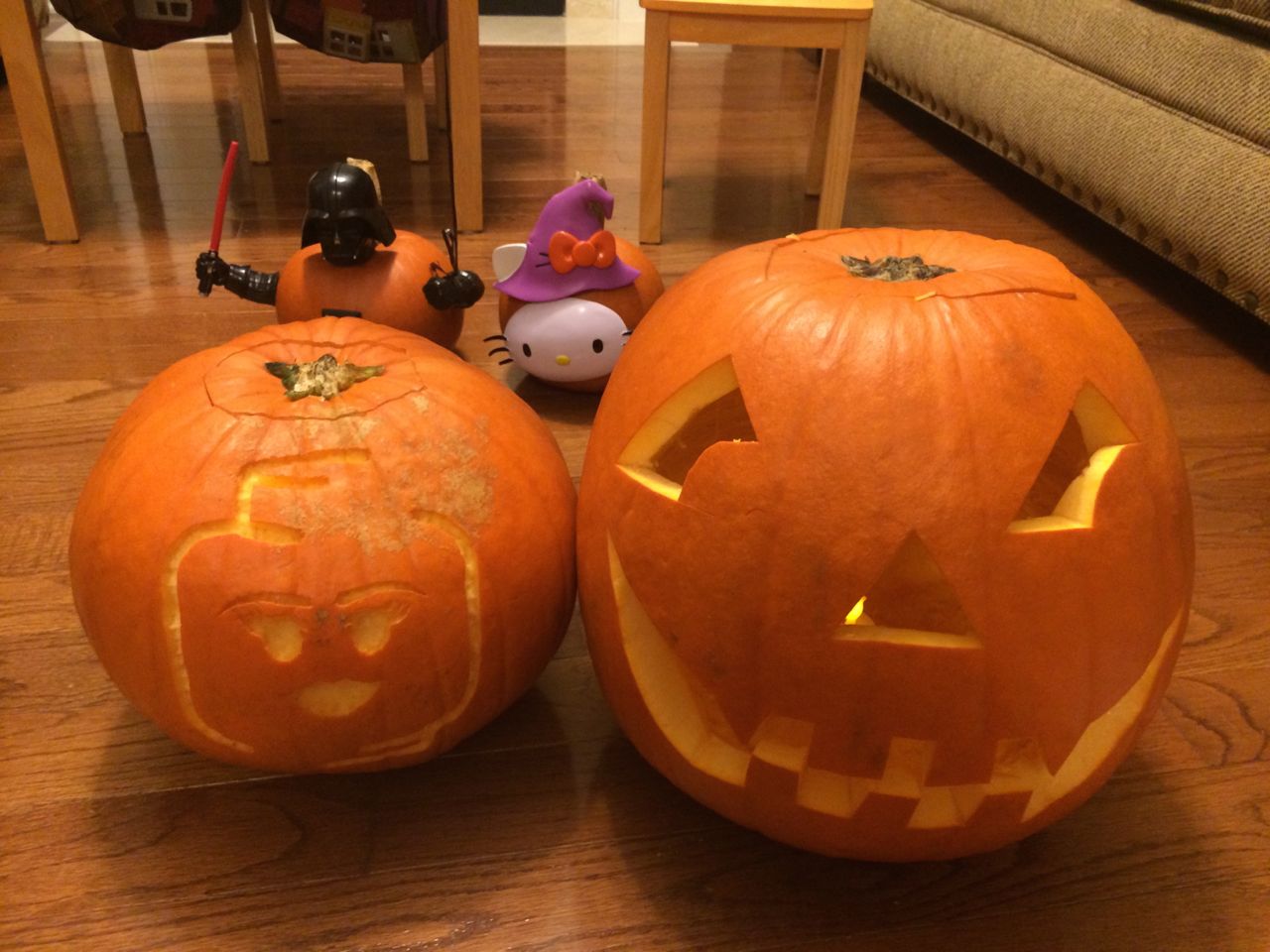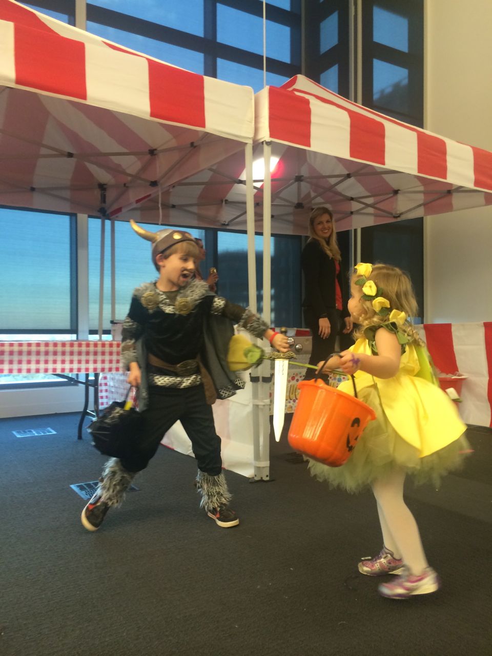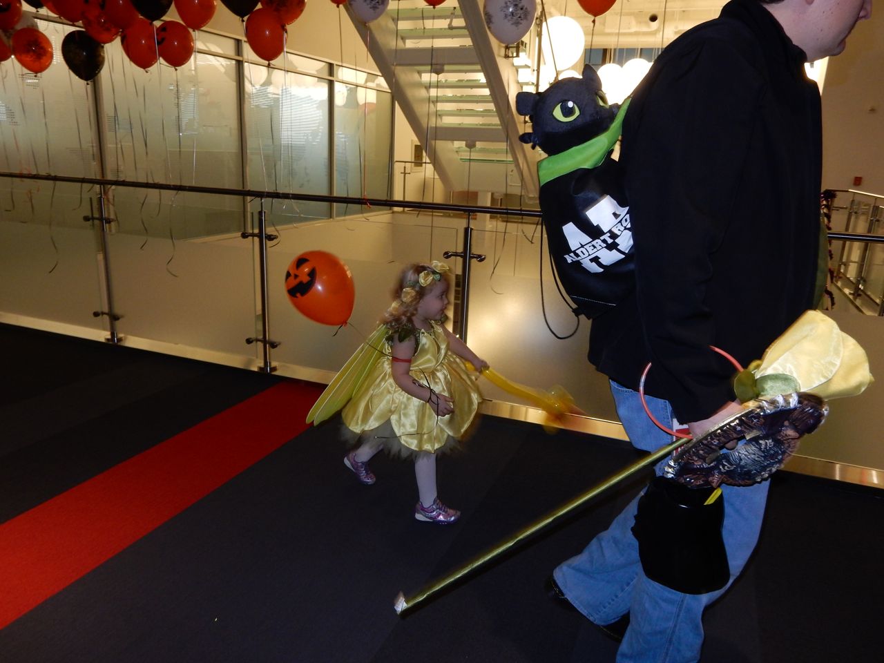 Tonight was the annual Red Hat family Halloween party! Brandon brought the kids to the tower and we got them ready to head inside. They look pretty fantastic, don’t they? Brian makes a fierce Viking, and Kendall makes the most beautiful buttercup fairy! Once we were ready, we headed in for the main event, and a wild time was had by all. It’s fairly chaotic and crowded, but the kids had fun playing silly carnival games, getting candy and prizes, and taking a tour through the haunted house. Both kids got glitter tattoos, and Brian even got a rather hilarious mustache and goatee attempt from the face-painting lady (to be fair, she usually does fantasy animals, realism is not her jam.) Kendall loved getting the plush monster-ball prizes, she had one of every color and called them “my babies!!” We went to the story time hoping for a bit of a calming break, but of course, Brandon and Brian both got called up to participate in the “there’s a giant bug in your pants!” dance (predictably done to Yakety Sax.) Brian did get a signed book for his participation. We stayed until they were closing things down once again, and then headed home. We had all the ingredients to make our own pizza from our Produce Box, so we had fun assembling that (and eating it, of course!) I had some more pumpkin carving to do, including making a Lego girl face at Kendall’s request. That kept me occupied past the kids’ bedtime, but I’m sure they’ll be happy with the result. Brandon discovered we have a cool spider living in our doorframe as he brought the pumpkins in.