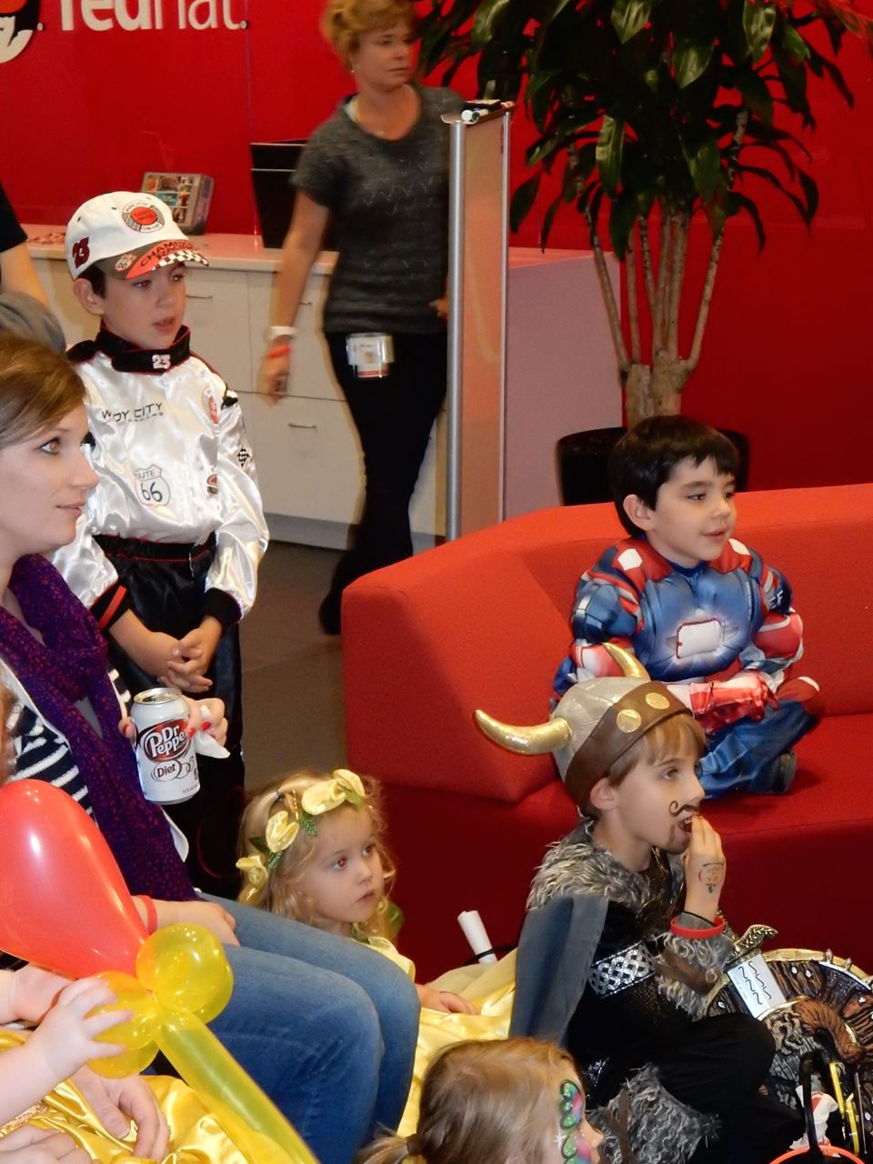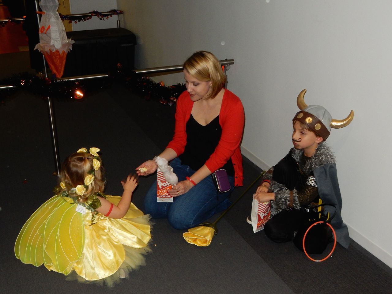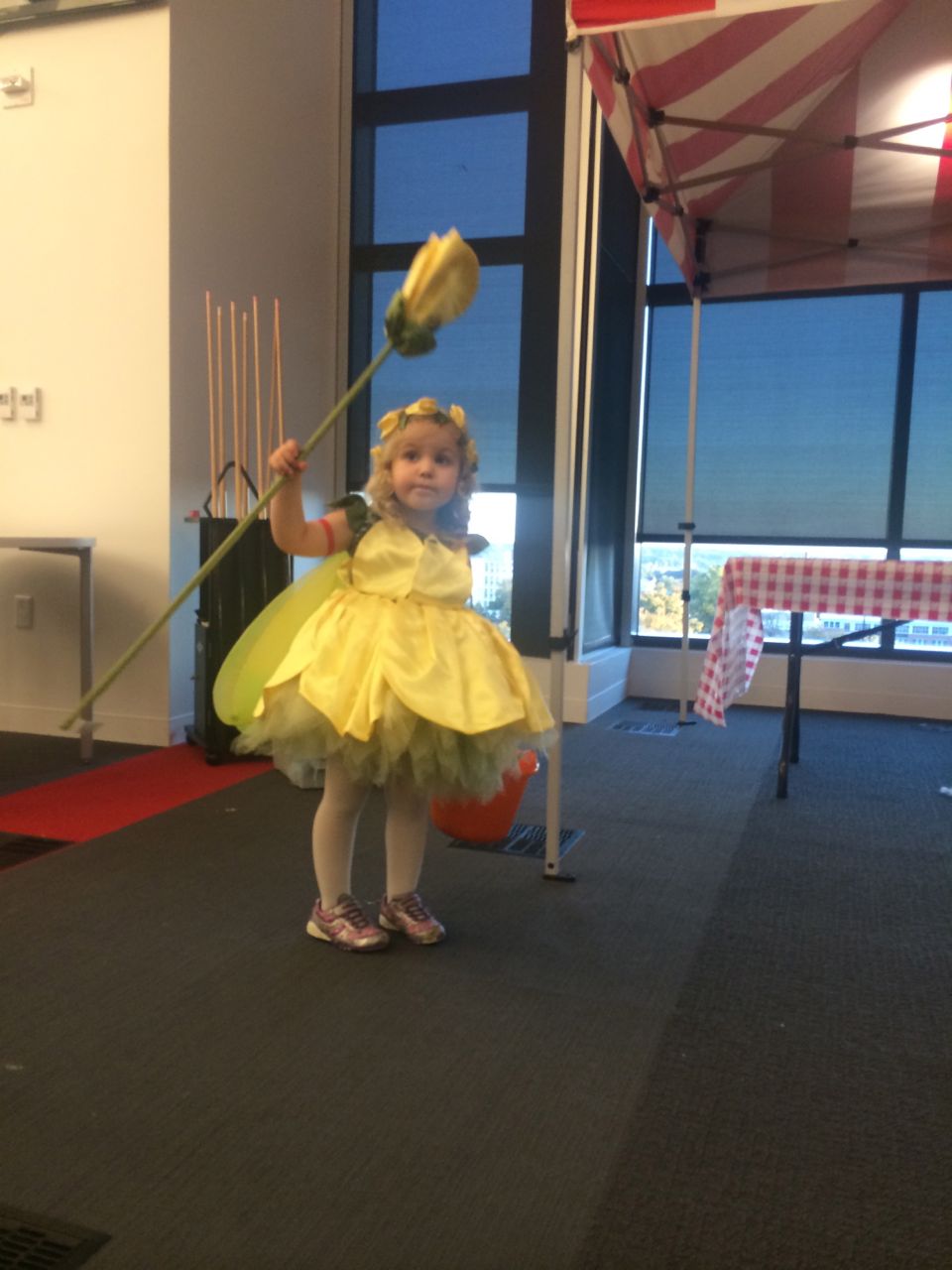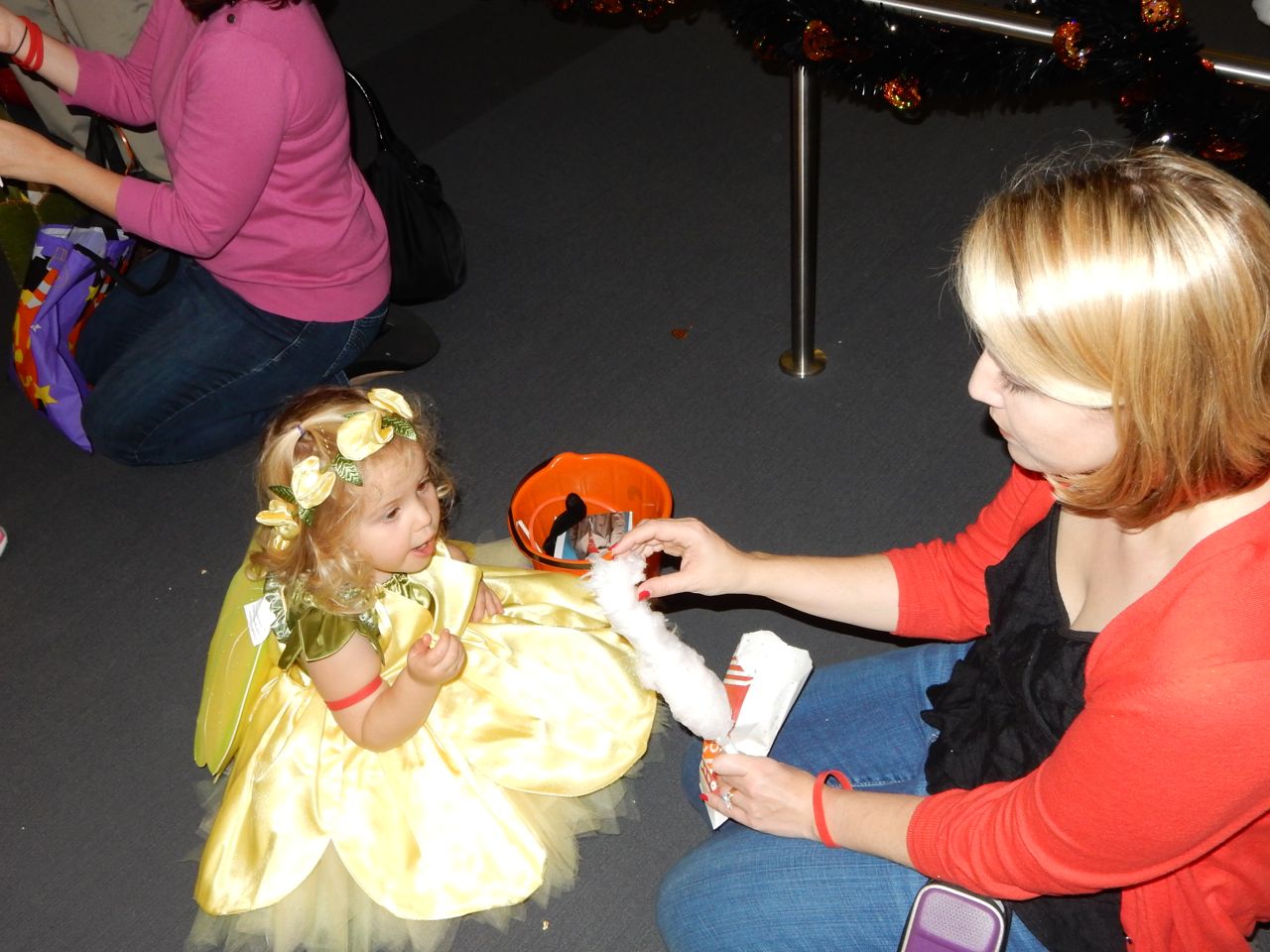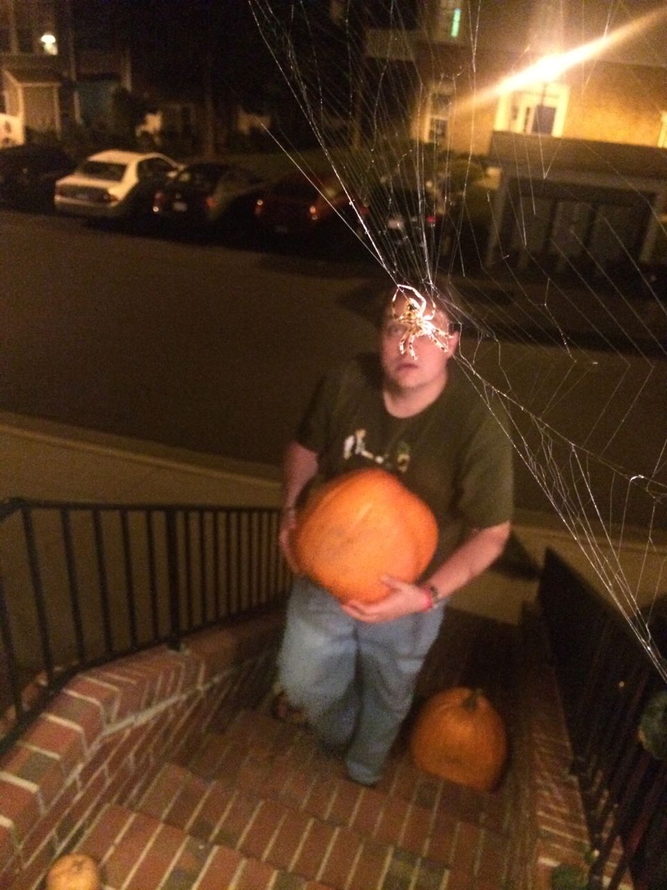 Tonight was the annual Red Hat family Halloween party! Brandon brought the kids to the tower and we got them ready to head inside. They look pretty fantastic, don’t they? Brian makes a fierce Viking, and Kendall makes the most beautiful buttercup fairy! Once we were ready, we headed in for the main event, and a wild time was had by all. It’s fairly chaotic and crowded, but the kids had fun playing silly carnival games, getting candy and prizes, and taking a tour through the haunted house. Both kids got glitter tattoos, and Brian even got a rather hilarious mustache and goatee attempt from the face-painting lady (to be fair, she usually does fantasy animals, realism is not her jam.) Kendall loved getting the plush monster-ball prizes, she had one of every color and called them “my babies!!” We went to the story time hoping for a bit of a calming break, but of course, Brandon and Brian both got called up to participate in the “there’s a giant bug in your pants!” dance (predictably done to Yakety Sax.) Brian did get a signed book for his participation. We stayed until they were closing things down once again, and then headed home. We had all the ingredients to make our own pizza from our Produce Box, so we had fun assembling that (and eating it, of course!) I had some more pumpkin carving to do, including making a Lego girl face at Kendall’s request. That kept me occupied past the kids’ bedtime, but I’m sure they’ll be happy with the result. Brandon discovered we have a cool spider living in our doorframe as he brought the pumpkins in.