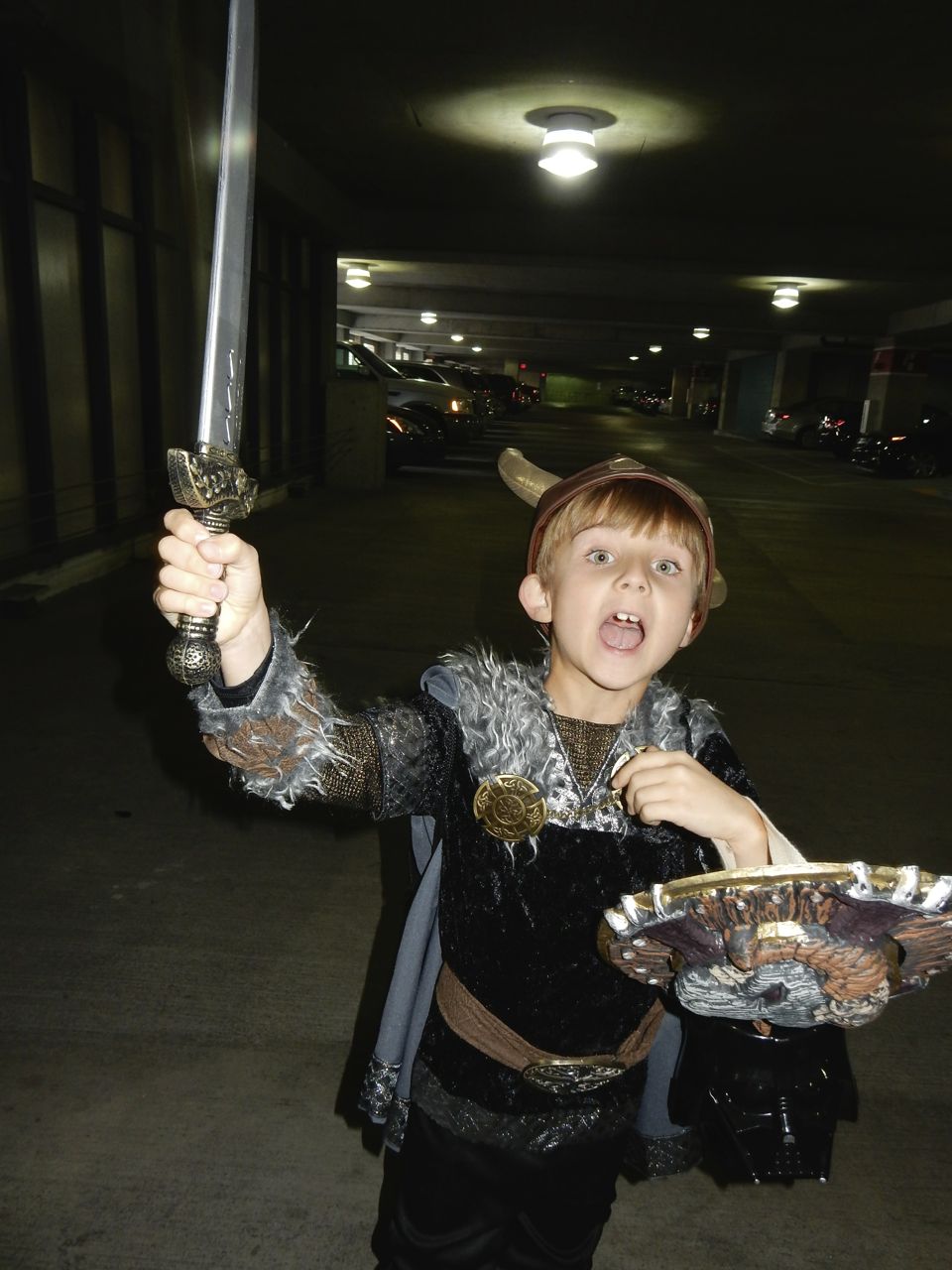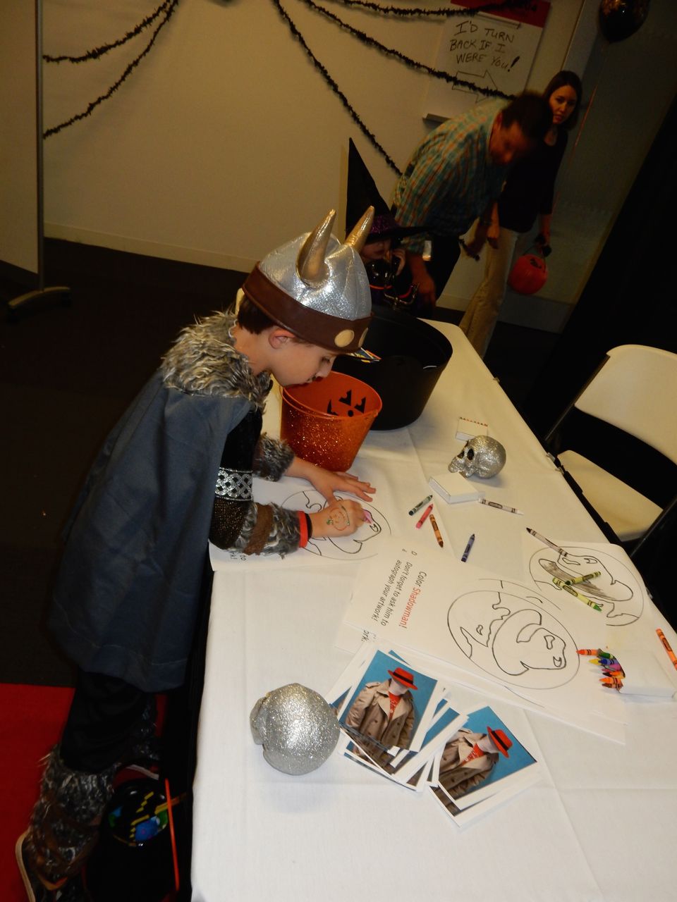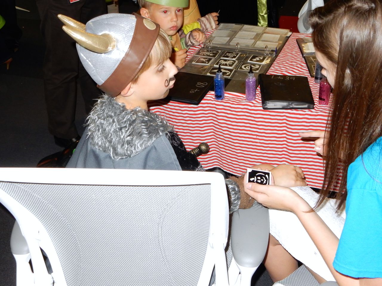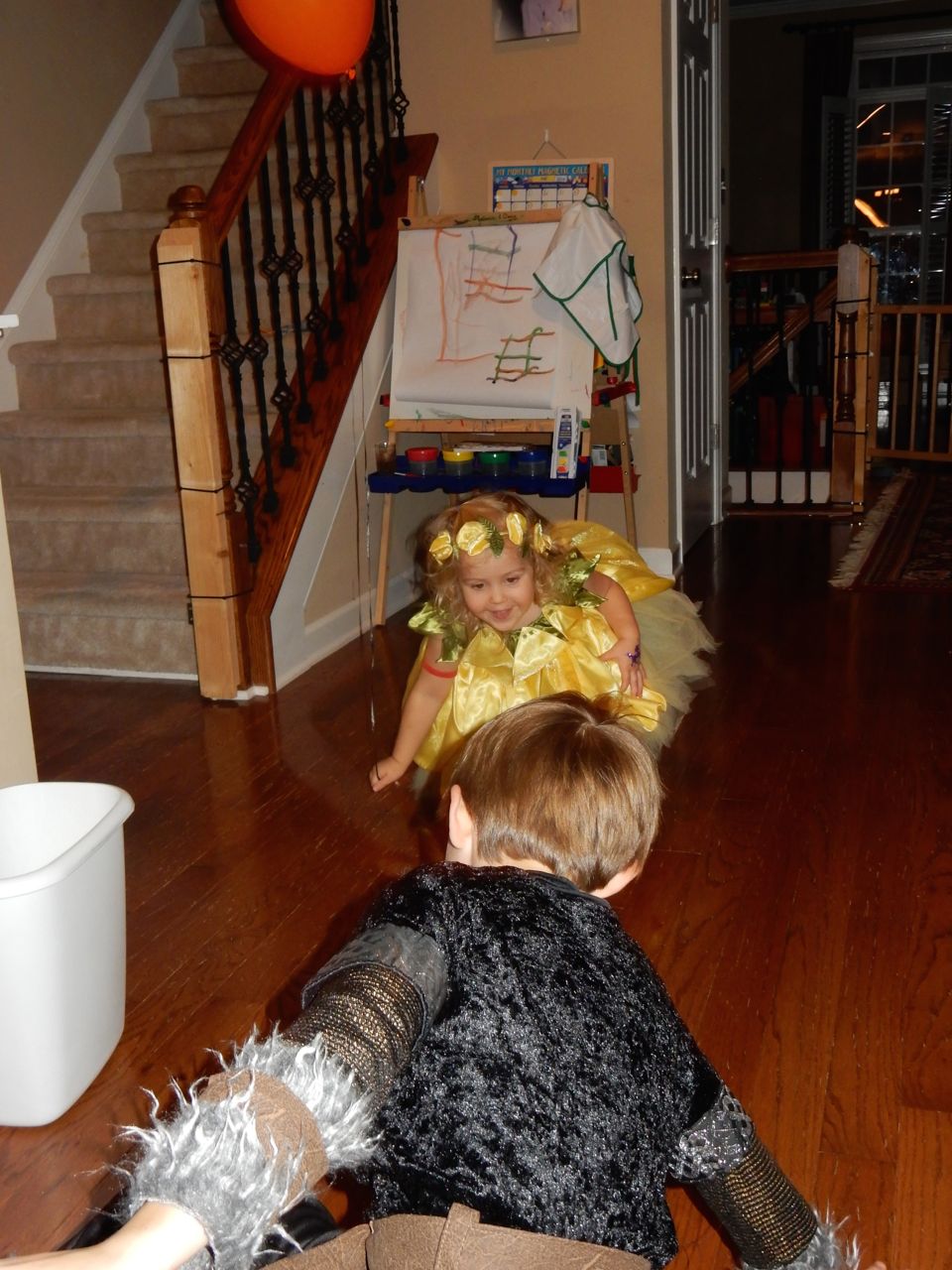 Tonight was the annual Red Hat family Halloween party! Brandon brought the kids to the tower and we got them ready to head inside. They look pretty fantastic, don’t they? Brian makes a fierce Viking, and Kendall makes the most beautiful buttercup fairy! Once we were ready, we headed in for the main event, and a wild time was had by all. It’s fairly chaotic and crowded, but the kids had fun playing silly carnival games, getting candy and prizes, and taking a tour through the haunted house. Both kids got glitter tattoos, and Brian even got a rather hilarious mustache and goatee attempt from the face-painting lady (to be fair, she usually does fantasy animals, realism is not her jam.) Kendall loved getting the plush monster-ball prizes, she had one of every color and called them “my babies!!” We went to the story time hoping for a bit of a calming break, but of course, Brandon and Brian both got called up to participate in the “there’s a giant bug in your pants!” dance (predictably done to Yakety Sax.) Brian did get a signed book for his participation. We stayed until they were closing things down once again, and then headed home. We had all the ingredients to make our own pizza from our Produce Box, so we had fun assembling that (and eating it, of course!) I had some more pumpkin carving to do, including making a Lego girl face at Kendall’s request. That kept me occupied past the kids’ bedtime, but I’m sure they’ll be happy with the result. Brandon discovered we have a cool spider living in our doorframe as he brought the pumpkins in.