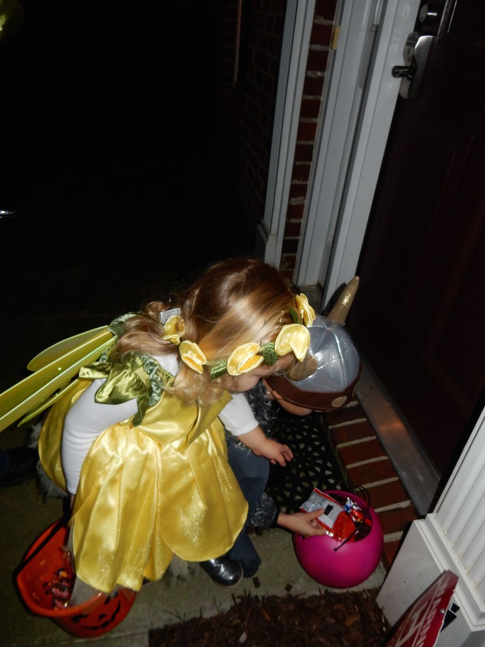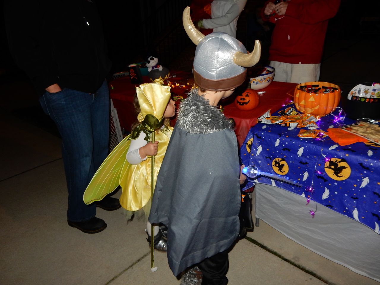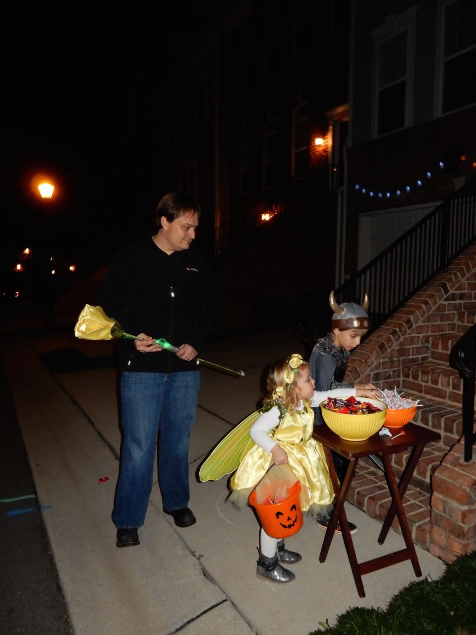 It’s Halloween! Still one of my favorite holidays, even if I’m not doing the dressing up anymore. 😉 Lucky for us, Halloween is a big deal at Red Hat and we always have one of our excellent parties. This year, they really pulled out the stops and had “haunted” elevators in the morning when we arrived, with decorations, sound effects, even including staff dressed up like creepy operators that took us to to our “final destination“–mwa-ha-ha!!! They were great. The party at the Lincoln Theater, the show, and costume contest were a lot of fun as usual (the free beer and leaving work early also helps.) We bugged out after the official events were over, and enjoyed playing hooky and having some time for ourselves before we had to pick up the kids! Once we did, we got everyone dressed and took to the neighborhood to play trick-or-treat! It was sort of hit-or-miss, maybe half of the houses weren’t participating, but there were certainly enough folks passing out candy that the kids still got a pretty ridiculous haul of candy! Everyone thought our Buttercup Fairy and Viking were incredibly adorable. Back home, the kids dumped out their haul in their clubhouse, and Brian even sorted, counted, and catalogued every last piece of his candy, writing it all out on the piece of cardboard his sword and shield came on. We let them sample a pretty decent amount of their treats (and managed to sneak some for ourselves!) before finally calling it a night.