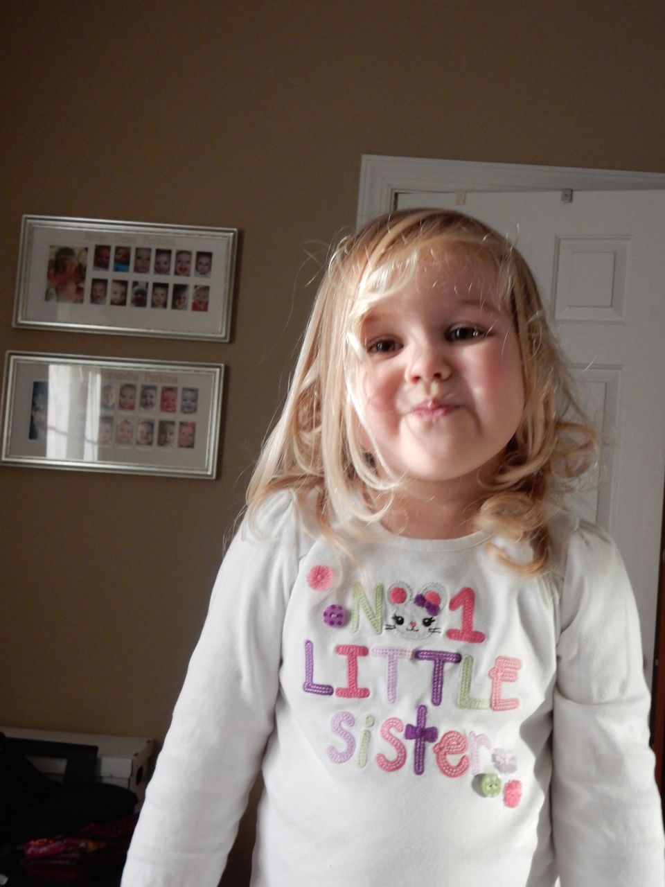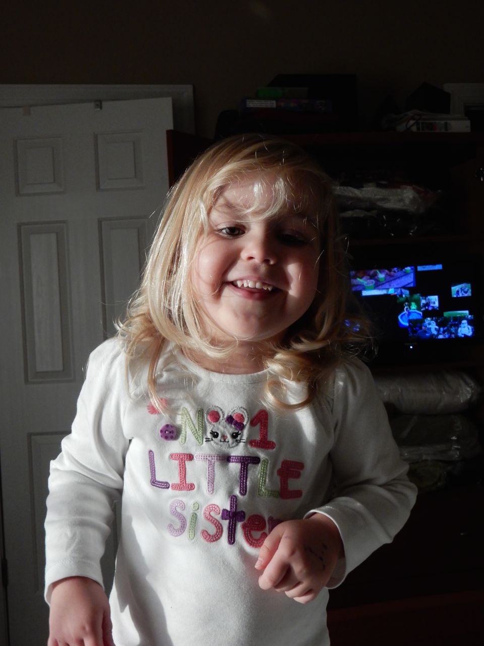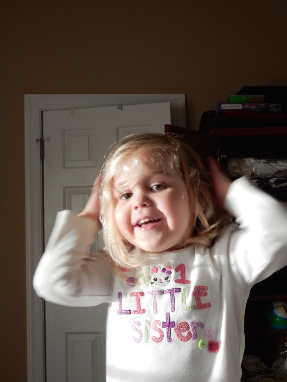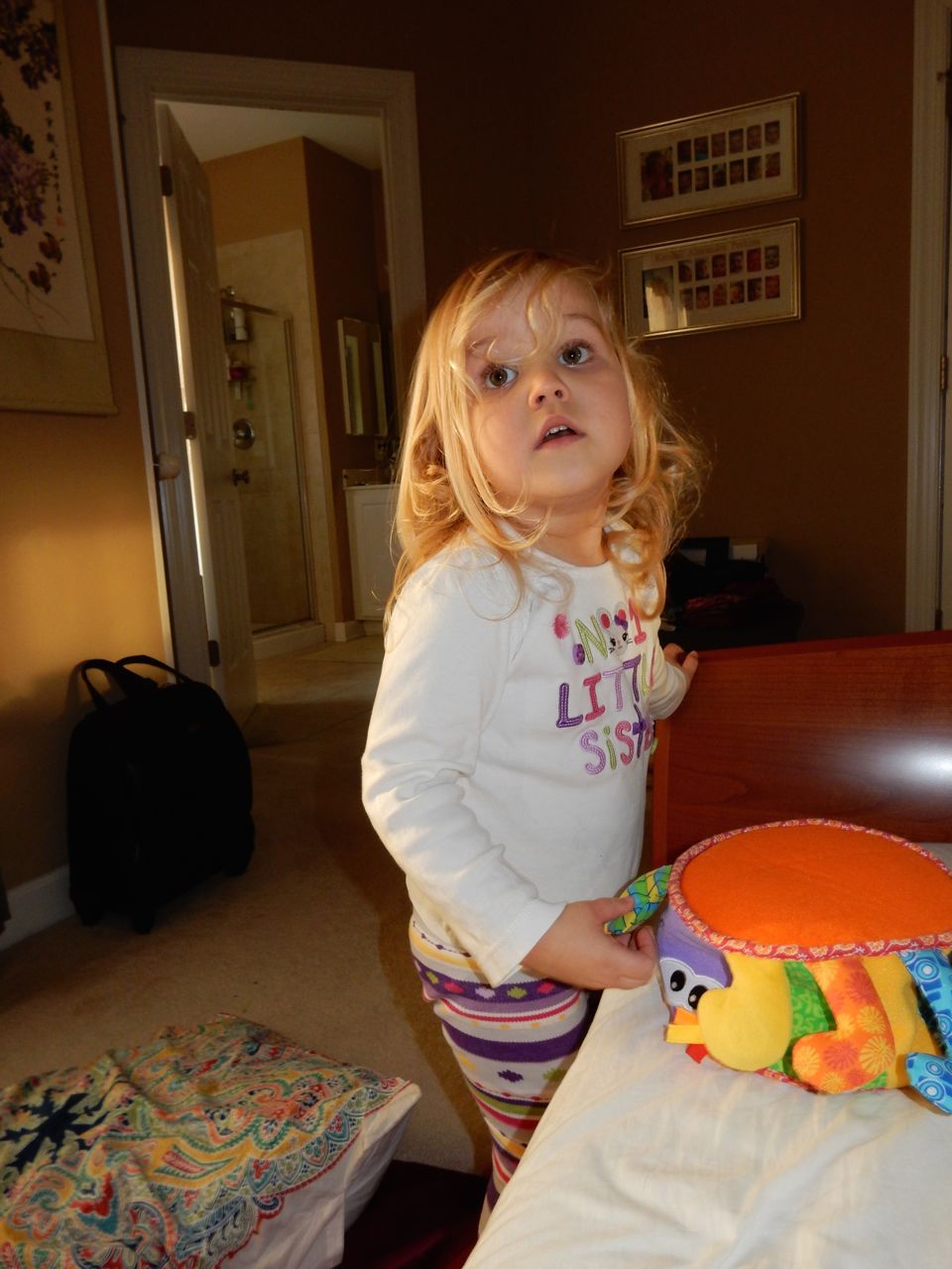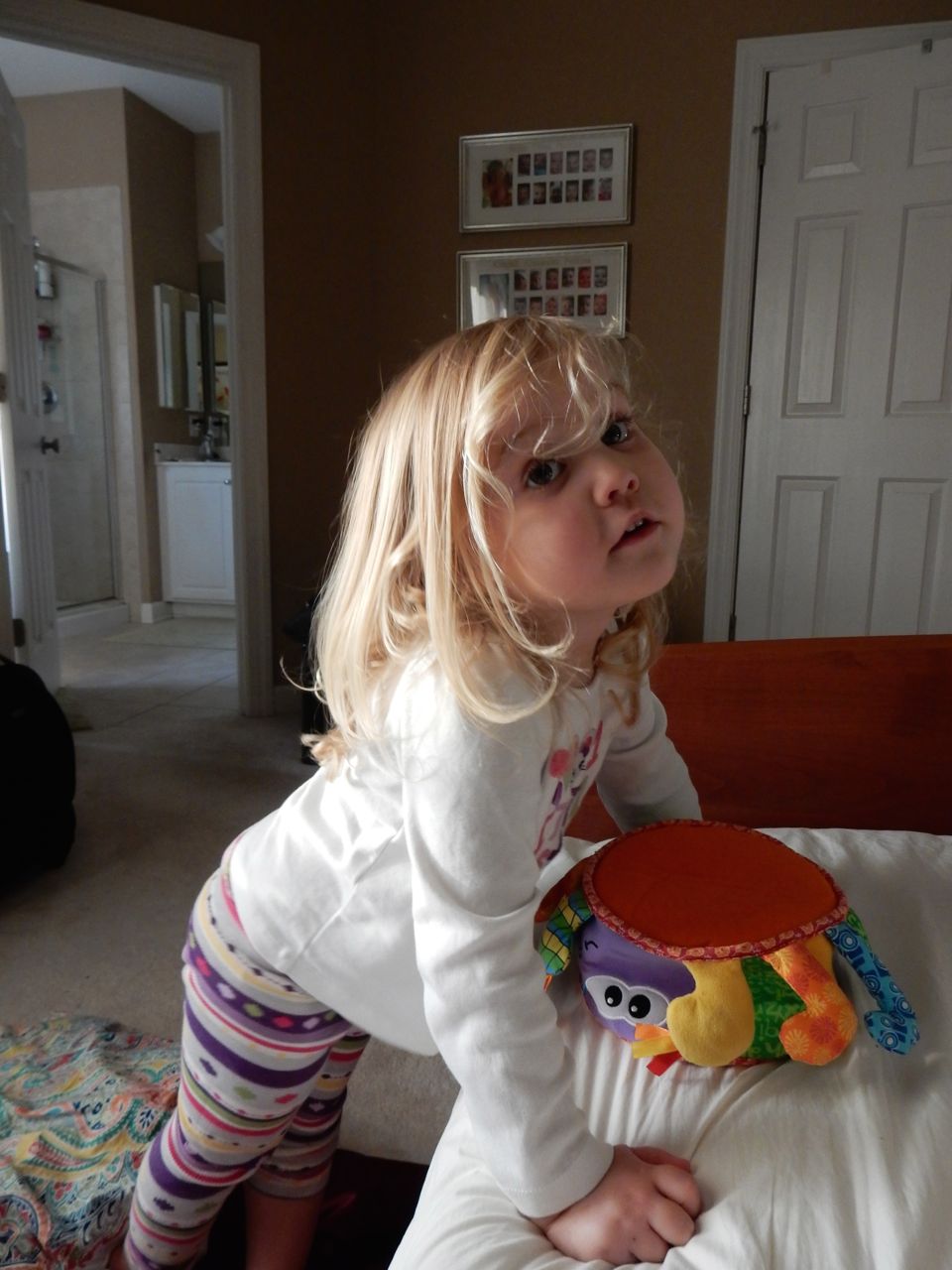 Kendall said today was a “no nap, just a rest” sort of day. What that ended up being was her bouncing on my bed, watching My Little Pony, and playing with toys, such as the Baby Beach Band that Katie gave Brian when he was just born. Somehow, the octopus’s batteries have found some new life (they aren’t supposed to be user-replaceable–amazing they have any charge after 7 years!) and Kendall is making the most of it! I thought she was so cute singing along with it, I took a short video of her from behind–I knew she wouldn’t do it if she saw me recording!