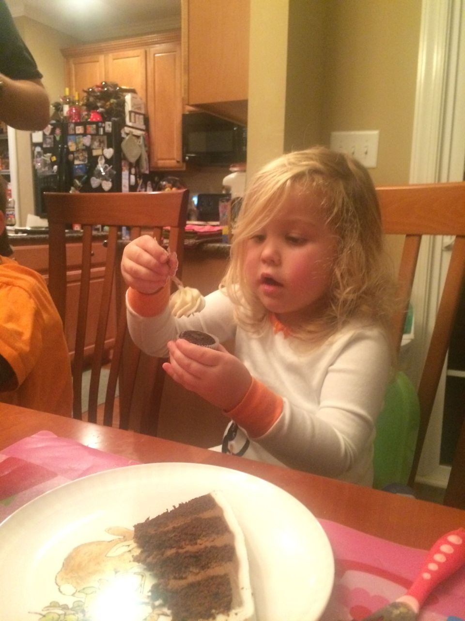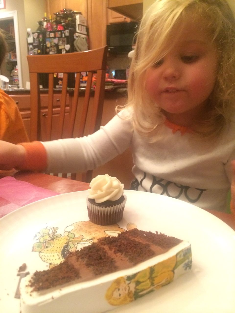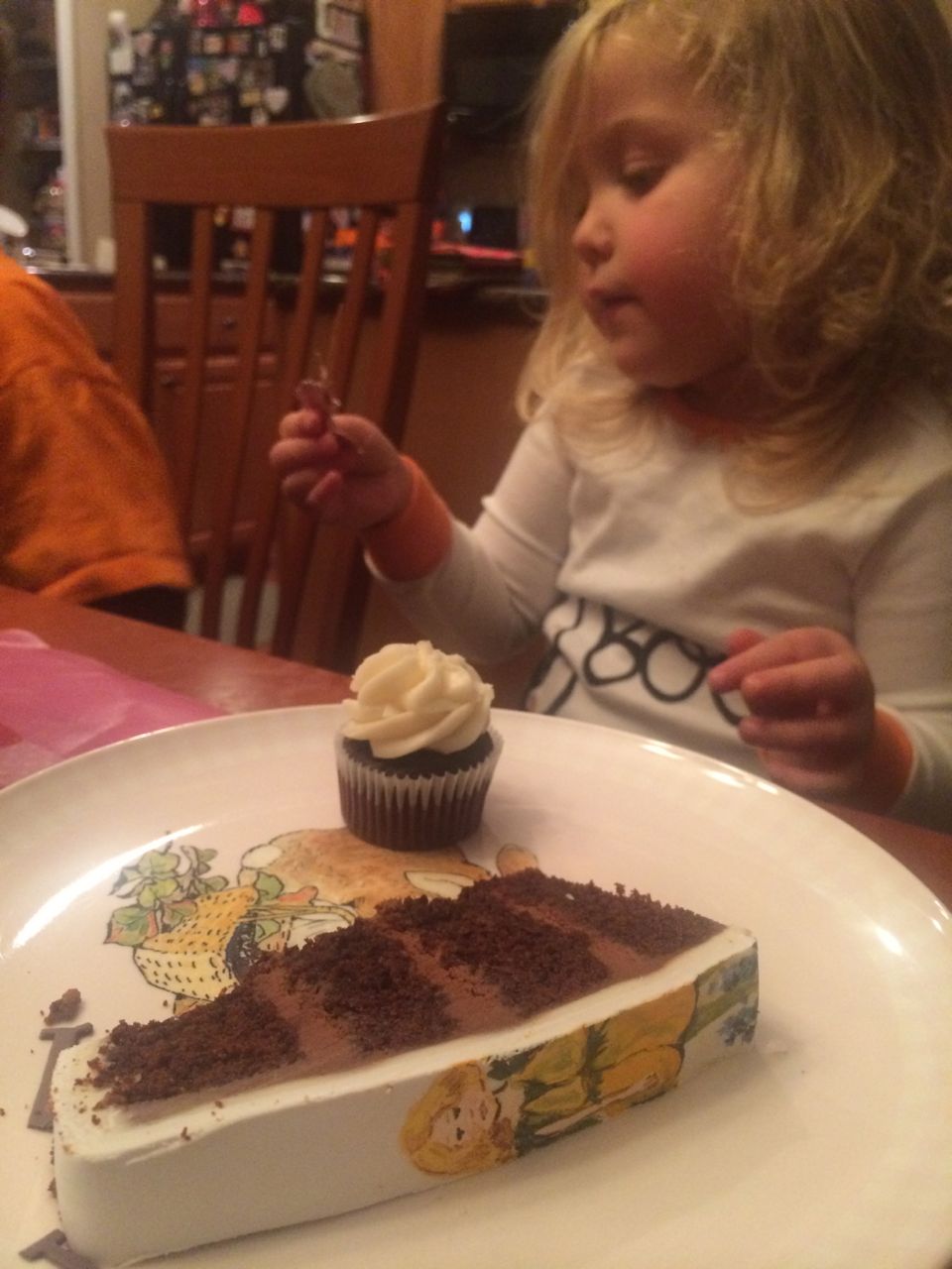 Today was Kendall’s 3rd birthday picture day! She was wild, as usual, but we got some good shots. Brian tried hard to show her how to be still and stay on her mark, but it didn’t work so well! Afterward, we picked up a few things at Target, and the kids got some new Frozen-themed dishes and placemats. Tonight we had the very last bit of Kendall’s birthday cake. We saved the piece with her beloved Buttercup Fairy for her. I wasn’t sure Kendall was going to be able to bring herself to eat it, but she didn’t have any trouble! 😀