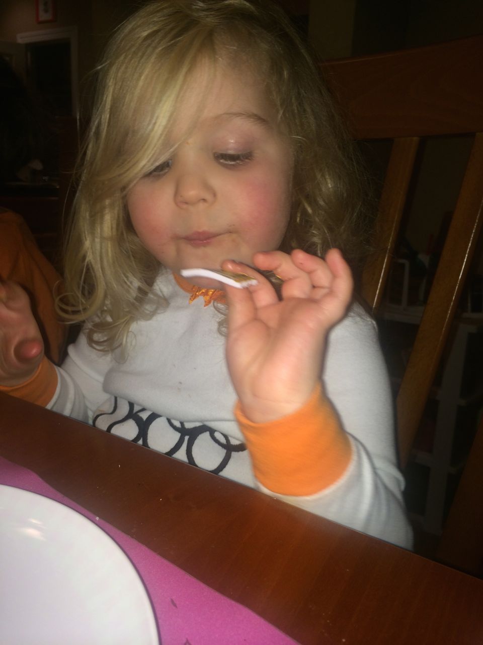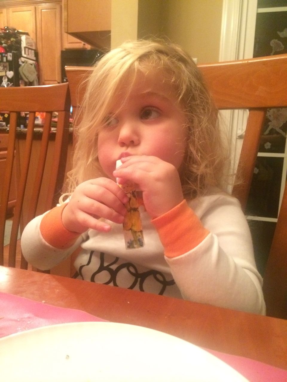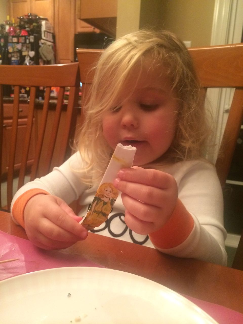 Today was Kendall’s 3rd birthday picture day! She was wild, as usual, but we got some good shots. Brian tried hard to show her how to be still and stay on her mark, but it didn’t work so well! Afterward, we picked up a few things at Target, and the kids got some new Frozen-themed dishes and placemats. Tonight we had the very last bit of Kendall’s birthday cake. We saved the piece with her beloved Buttercup Fairy for her. I wasn’t sure Kendall was going to be able to bring herself to eat it, but she didn’t have any trouble! 😀