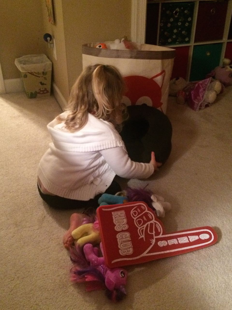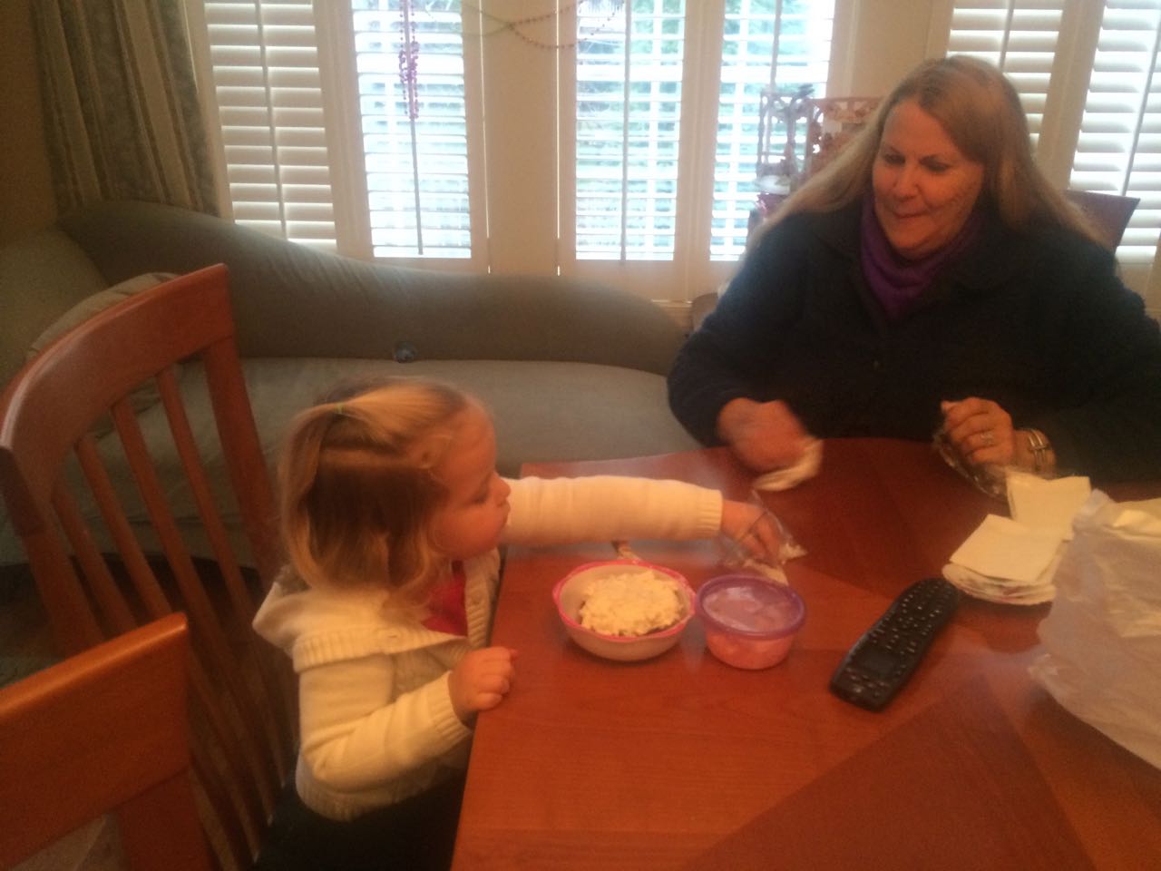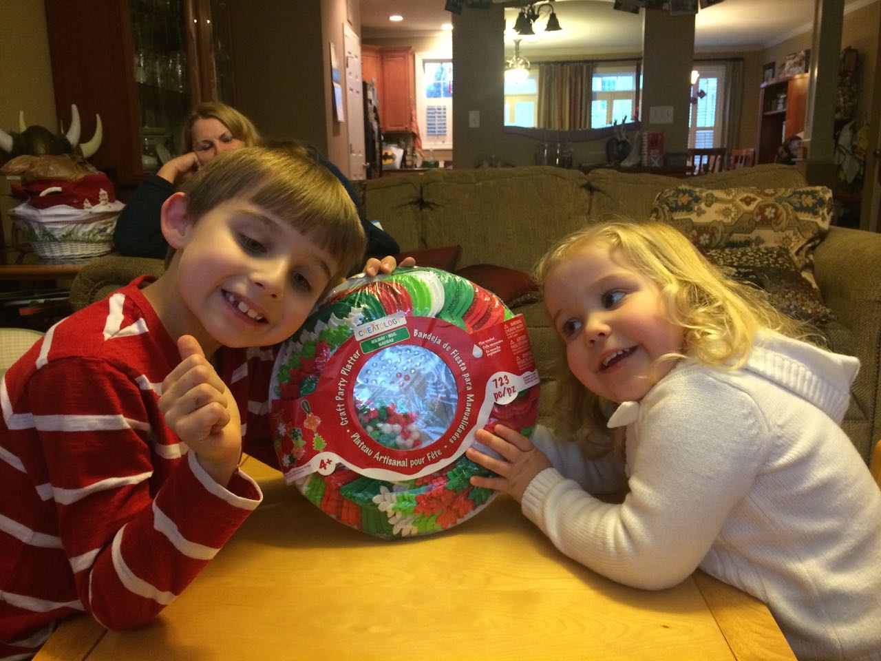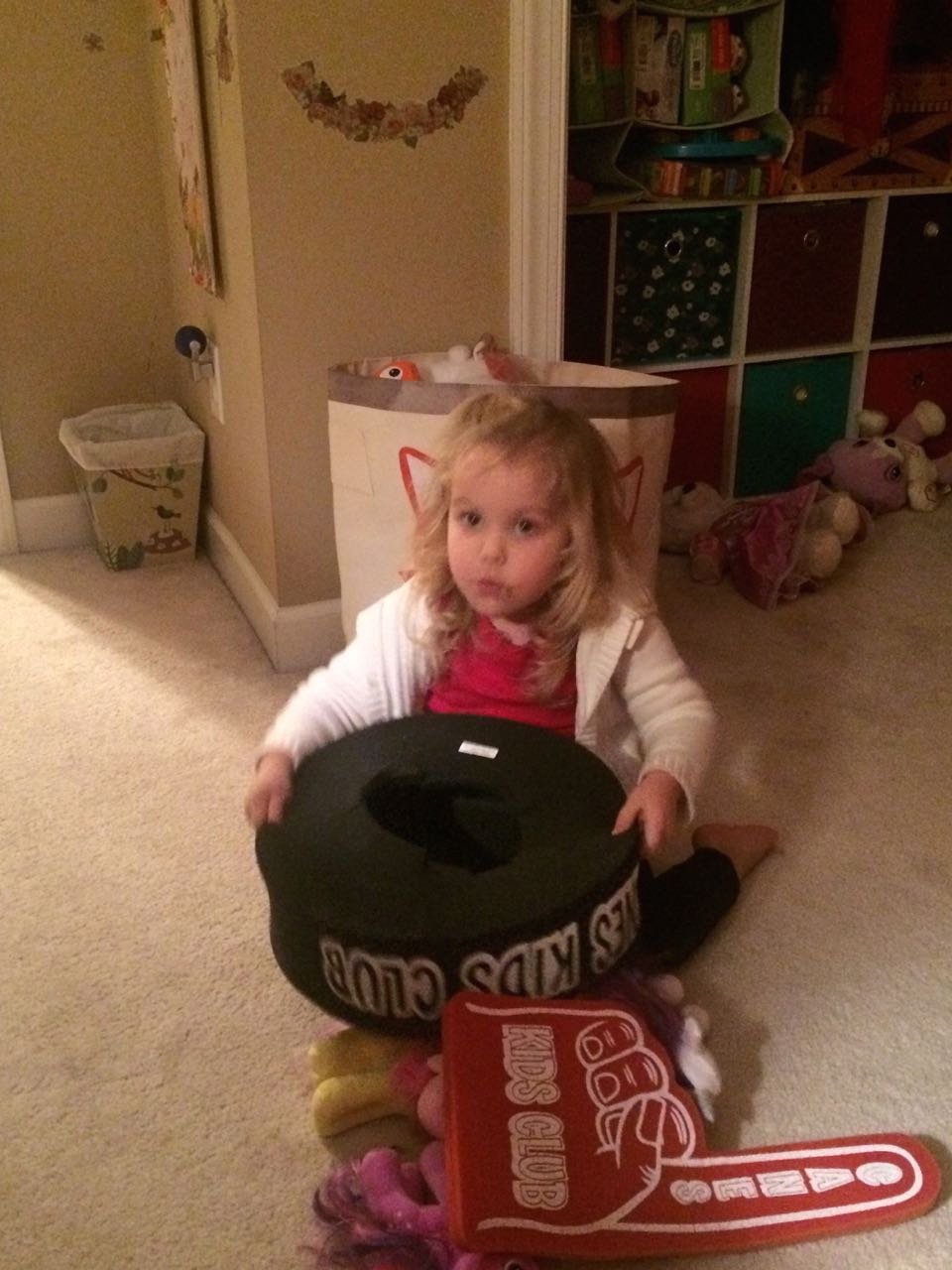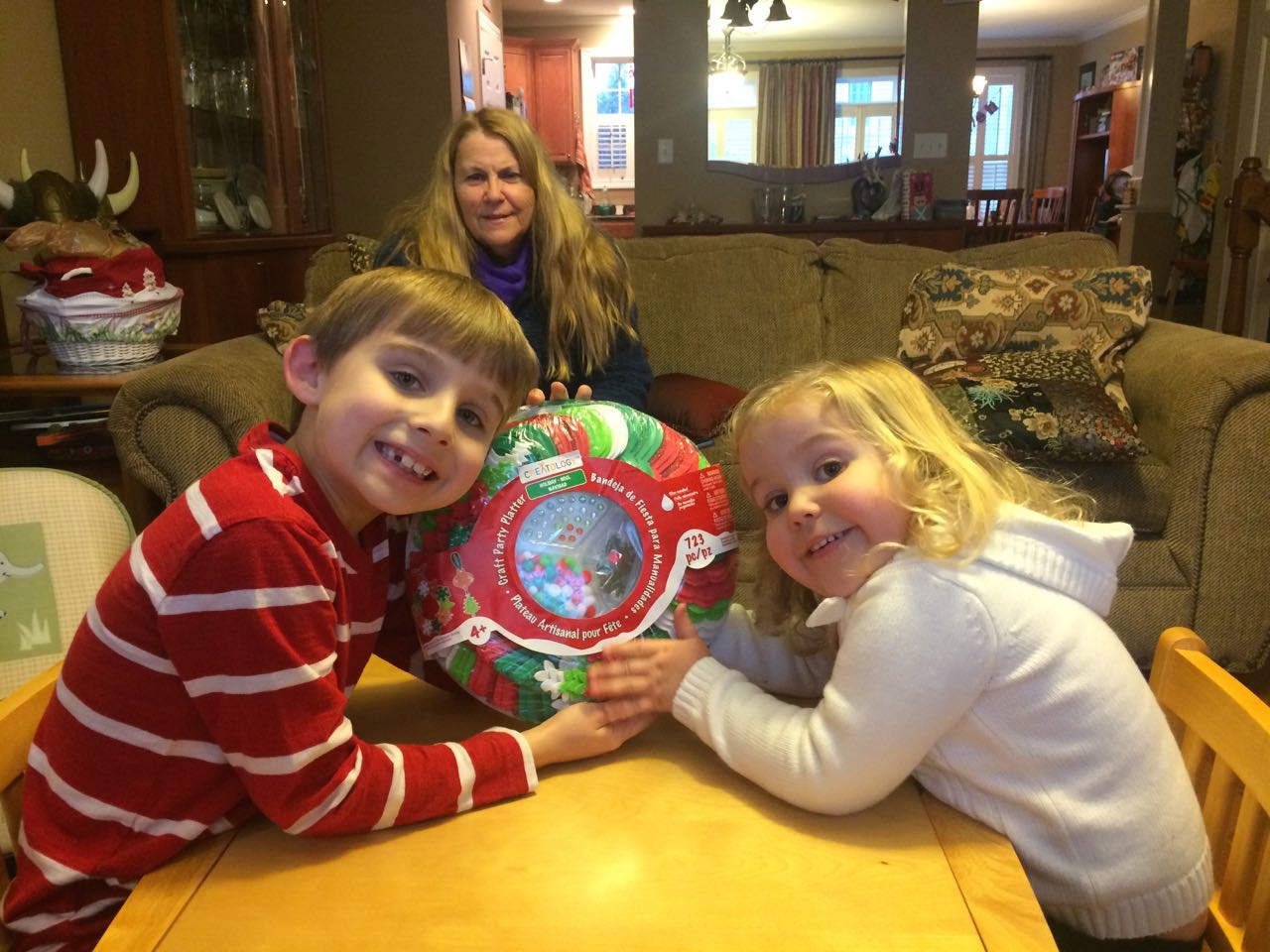 Today was a busy one! We started out early with the kids waking us up to go and watch a squirrel in a tree outside our bathroom window (the height of excitement, truly). Nana Rosemary came by this morning for some more baking, and this time we made red velvet cupcakes! The kids made some more holiday crafts (I keep a lot of options on hand to keep them busy!) In the afternoon we went to Spring Arbor for Granny Jo’s birthday. She seemed happy to see us, and we all enjoyed the delicious chocolate cake! The kids loved getting some party beads to wear like Granny’s. Tonight the boys went out to a hockey game, and Brian came home with a foam hat that Kendall might be a little jealous of (place your bets on how long that’ll last, folks!) And, he picked out a set of toy sticks and pucks that he really wants Santa to know about… 😉