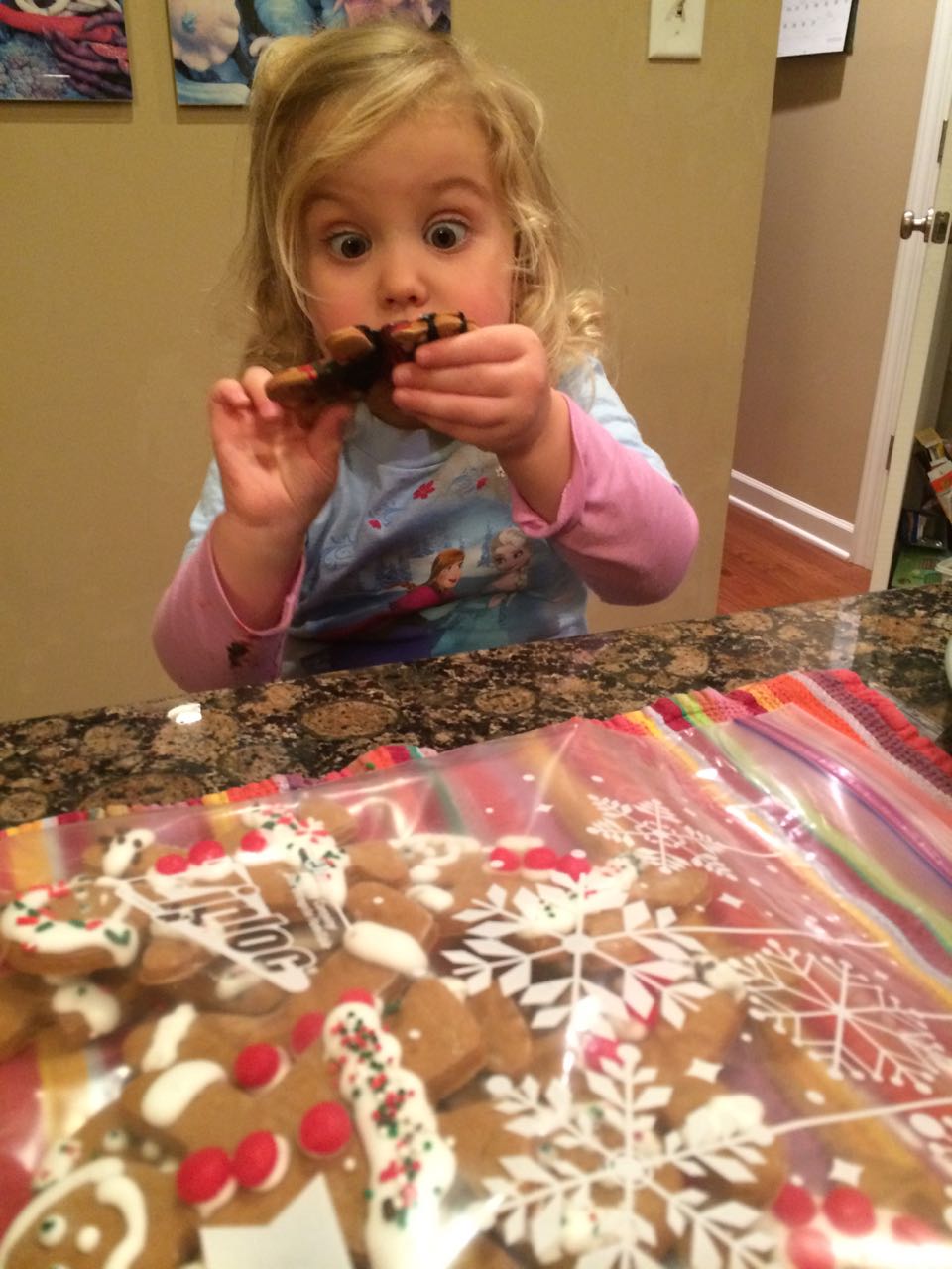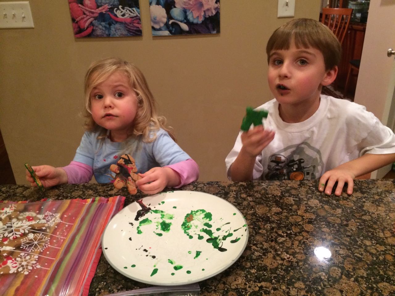 Today the kids had a sticky, crazy good time, decorating all of those extra gingerbread cookies we made yesterday. They liked the icing colors on the Star Wars ones, but I think the sprinkles on the gingerbread boys and girls were their favorite! They also enjoyed some starfruit that came in our Produce Box.