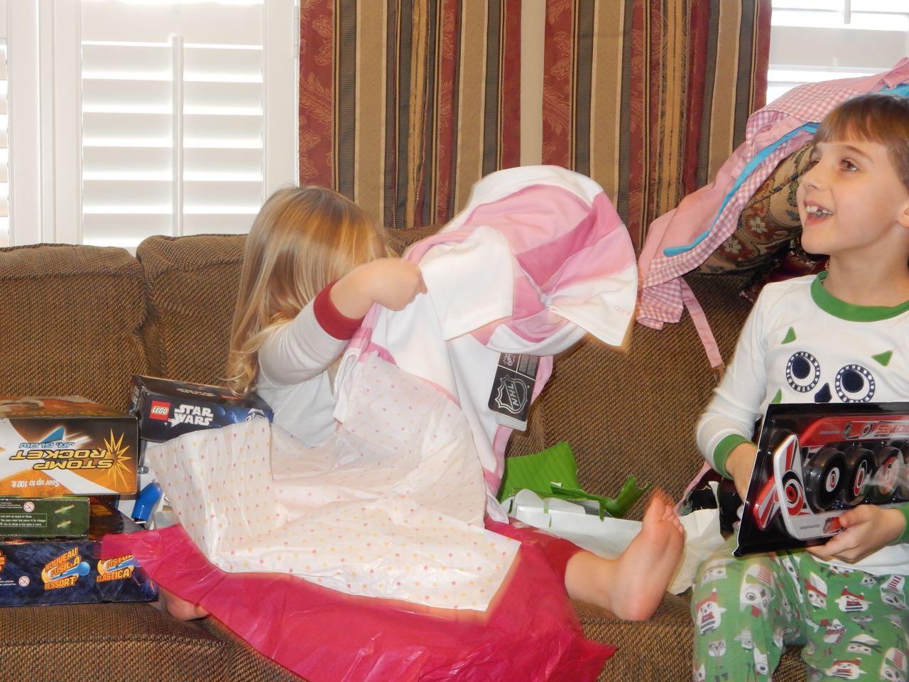Merry Christmas! We started bright and early with the kids. They came downstairs to the Mameshiba Christmas song–we now have a complete set of the plushie beans they love so much. 😉 We had our Christmas stollen for breakfast, and then it was time for presents. The first thing they noticed was the Tauntaun sleeping bag. 🙂 The kids got the things they asked Santa for when we rode the Santa Train–a Bitty Baby book for Kendall, and Clone Wars Lego sets for Brian. (Among about a million other things..!) Kendall got some very special presents–brand-new pink ice skates, a pink-and-white hockey helmet, and a new pink-and-white Hurricanes jersey! The kids played all morning, until we went over to Steve and Sue’s for Christmas dinner.